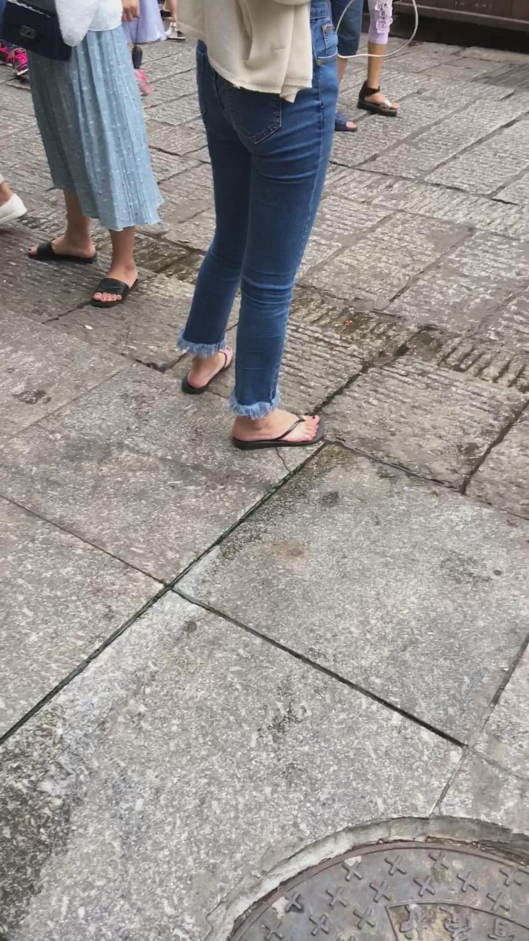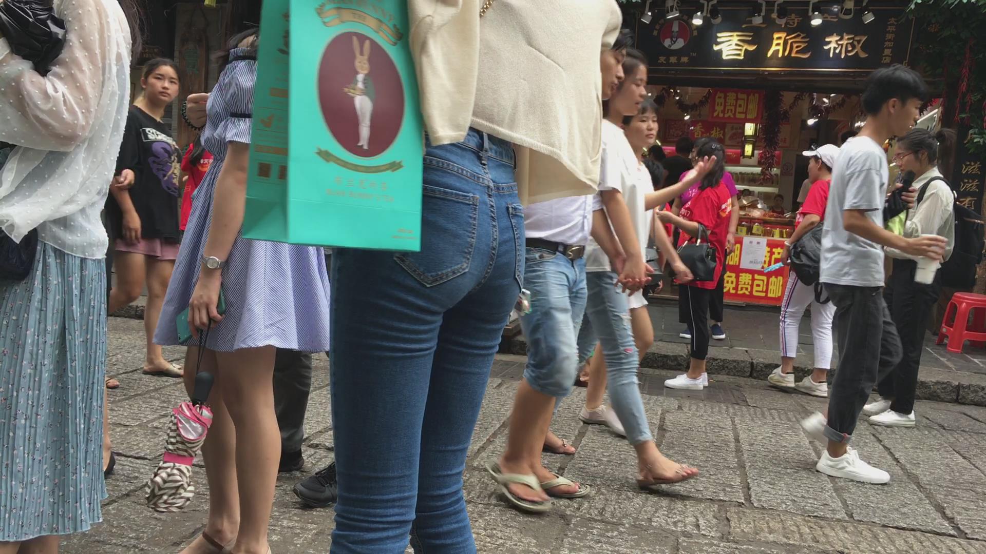 街拍清纯紧身蓝色牛仔裤可人娇小美女 编号6083