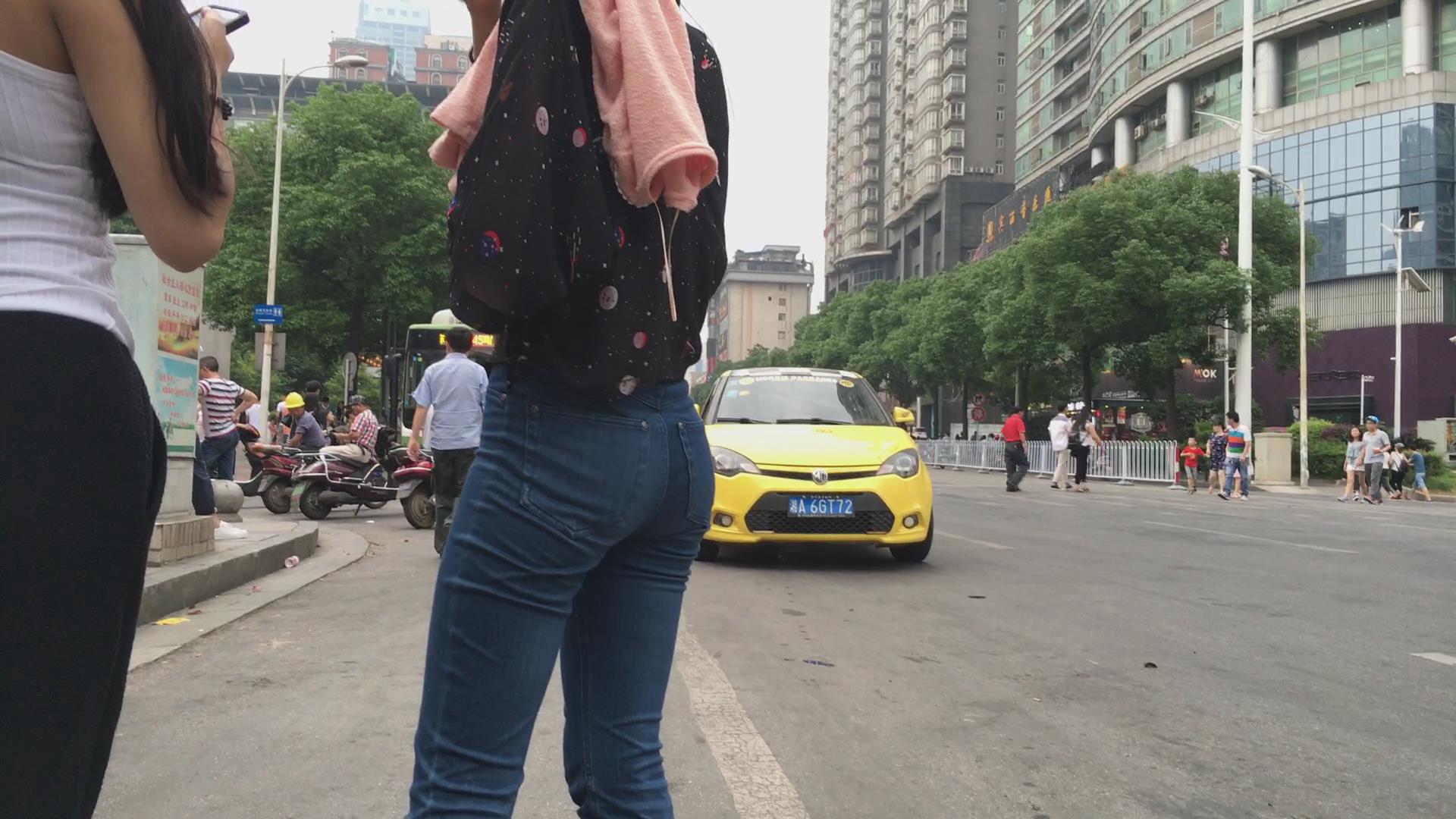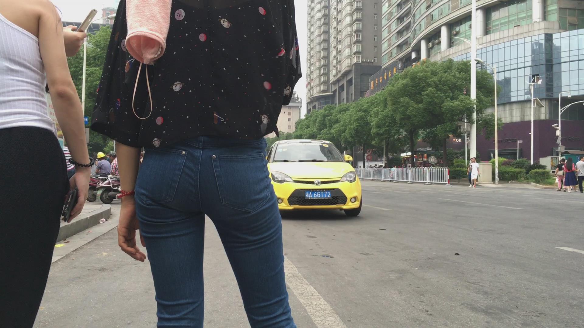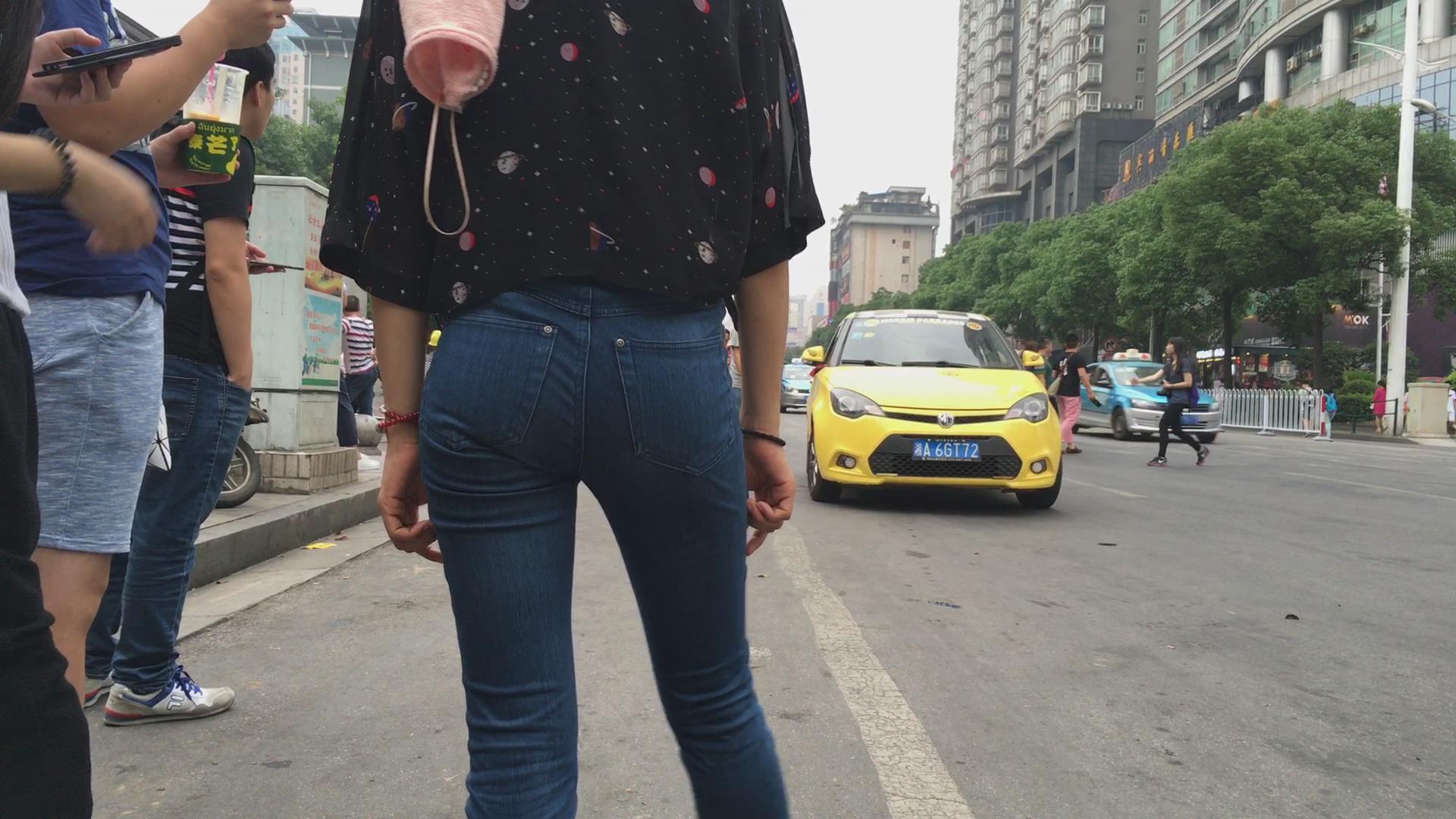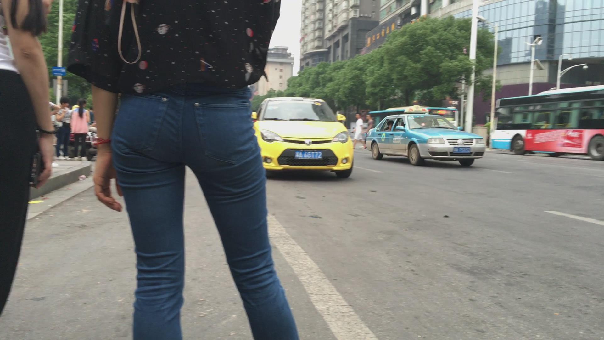街拍路边等车的紧身蓝牛宽臀小妹 编号6113