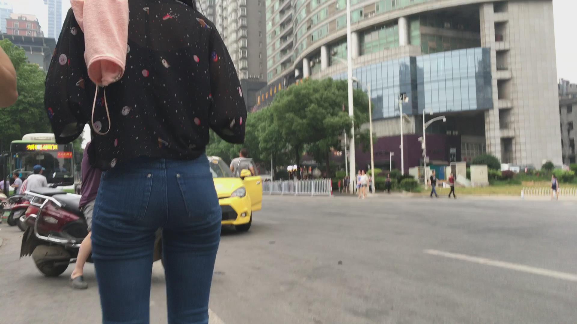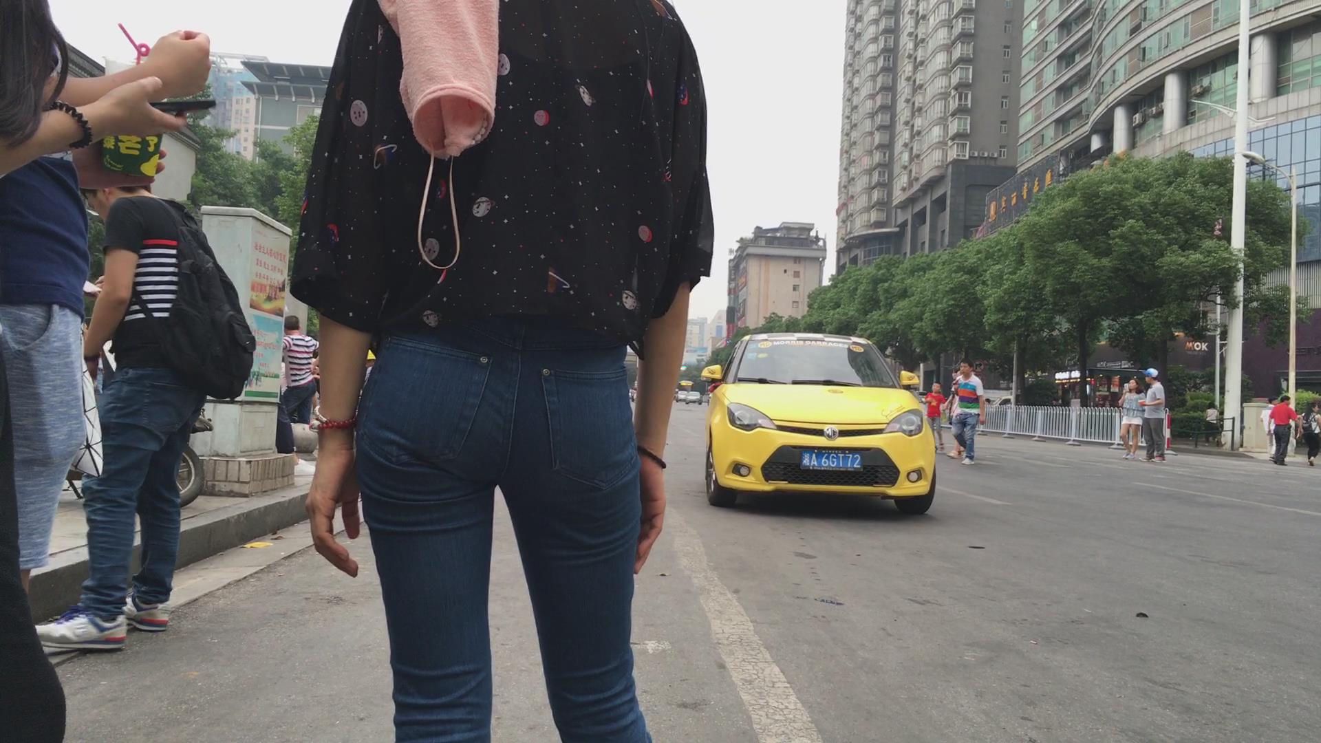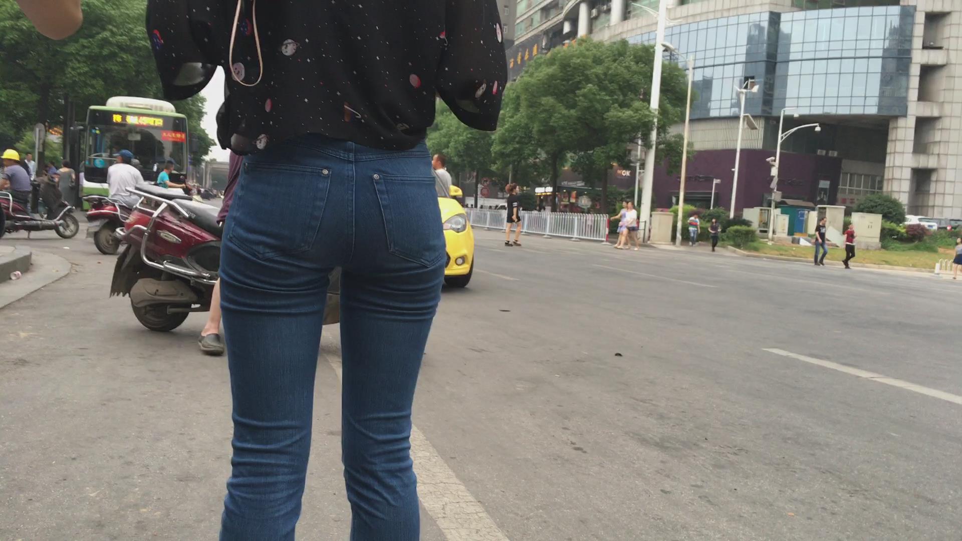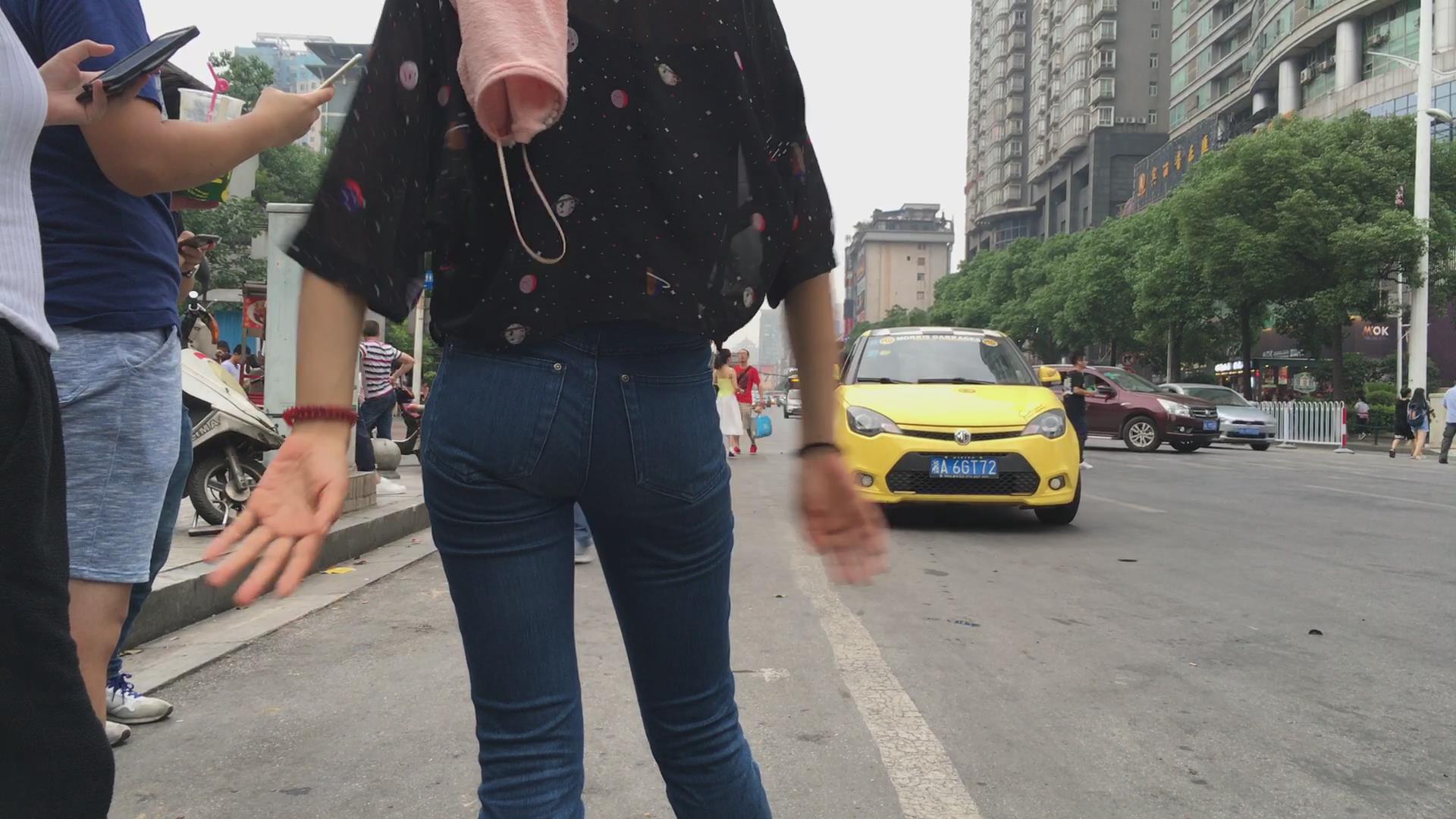 街拍路边等车的紧身蓝牛宽臀小妹 编号6113