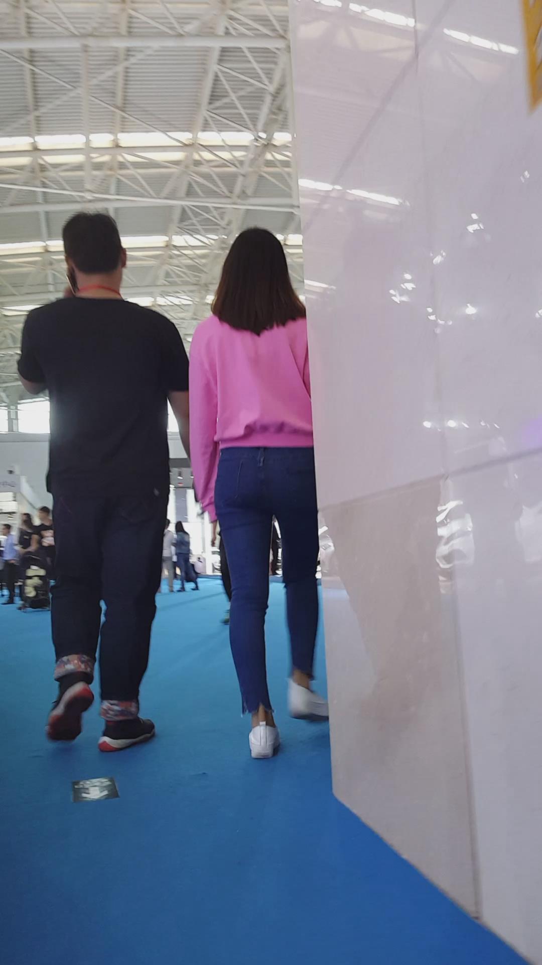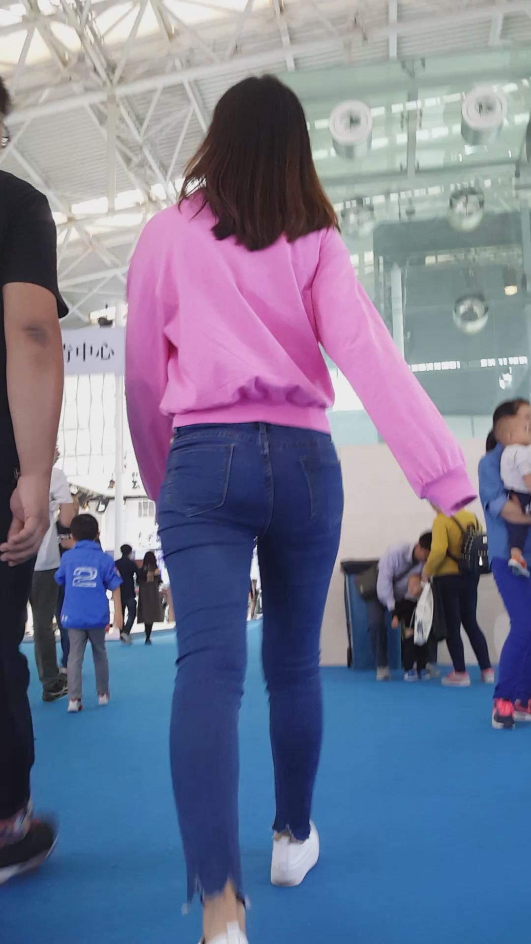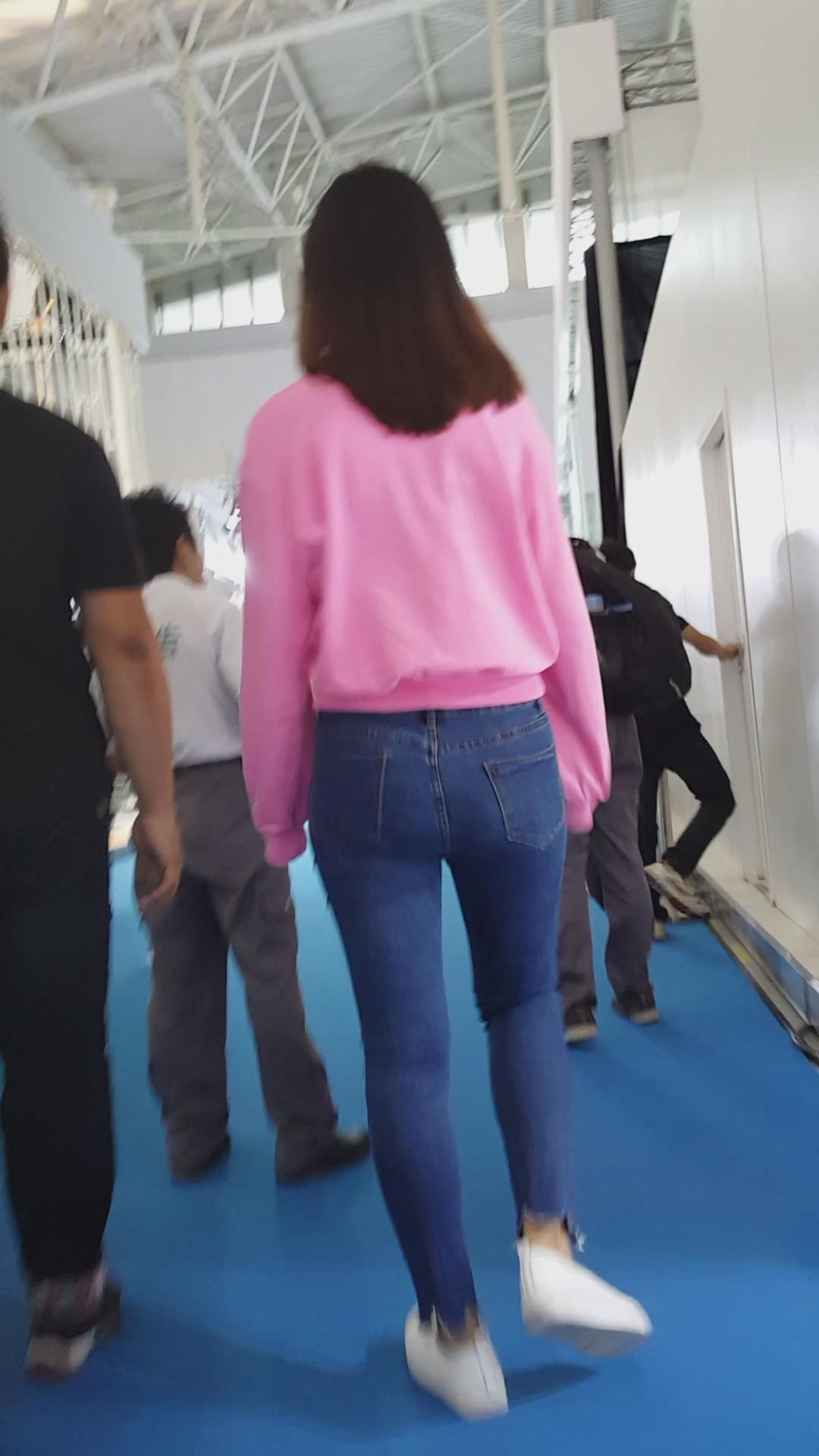 跟拍超紧蓝色牛仔裤粉T恤小清新美眉 编号5420 |