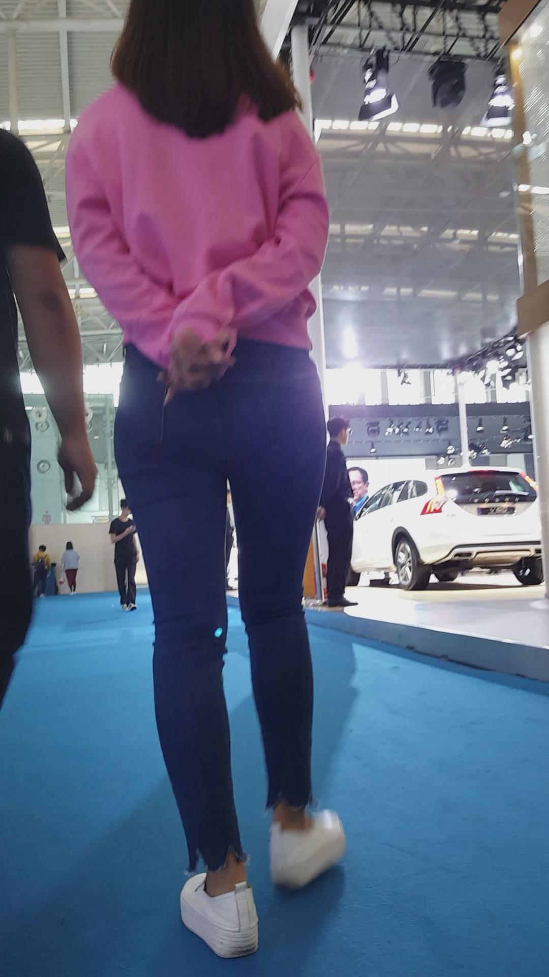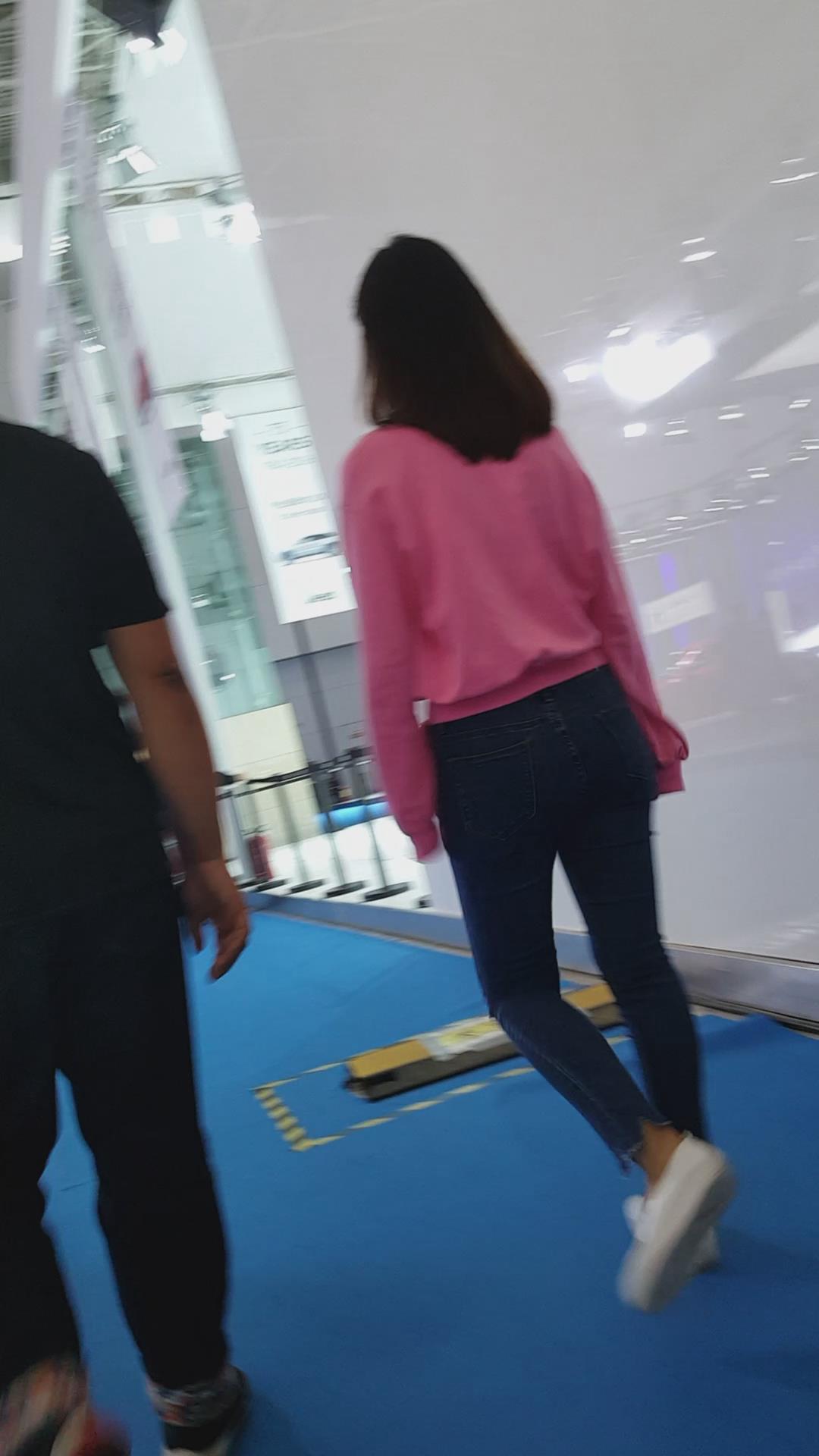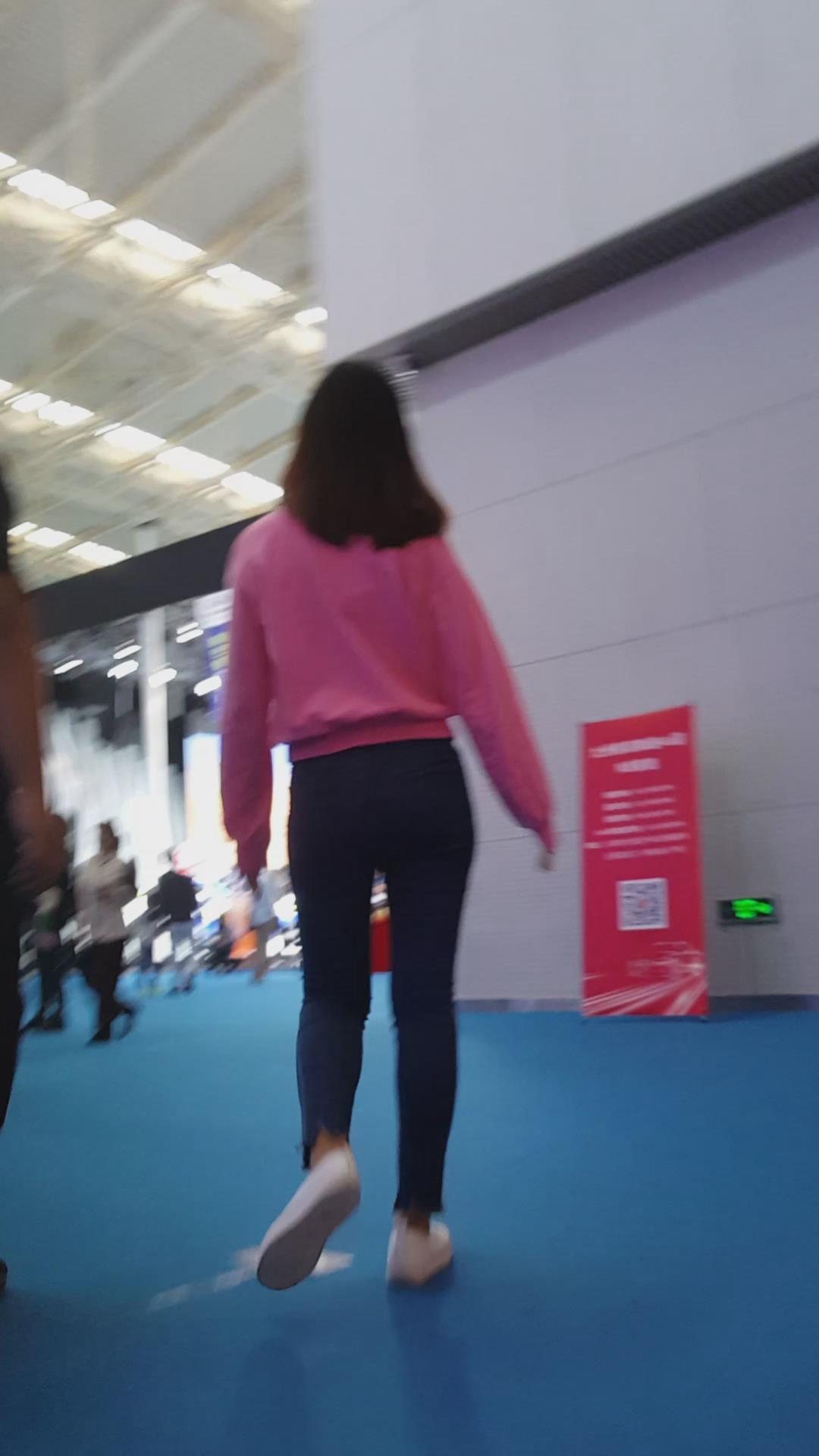 跟拍超紧蓝色牛仔裤粉T恤小清新美眉 编号5420 |