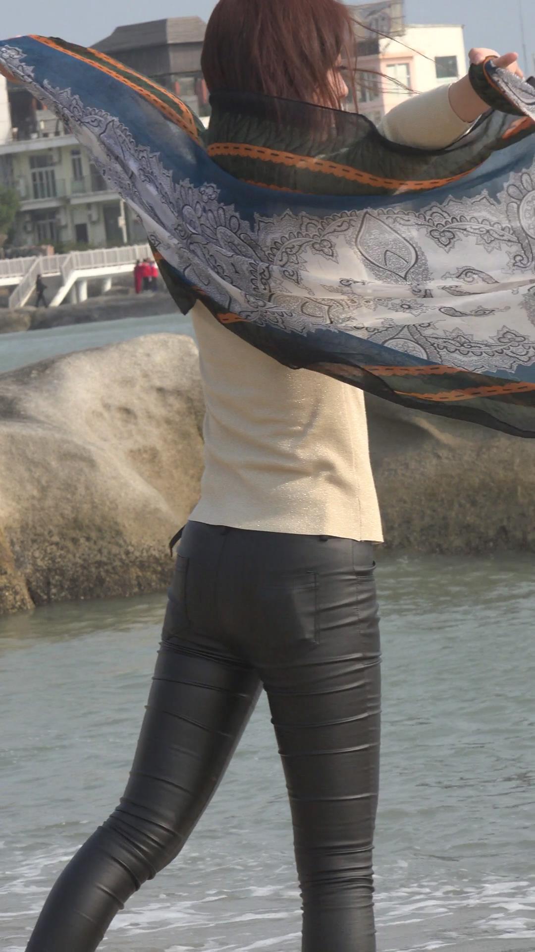 海边迎风拍照超美的皮裤运动鞋美女 编号5693 |