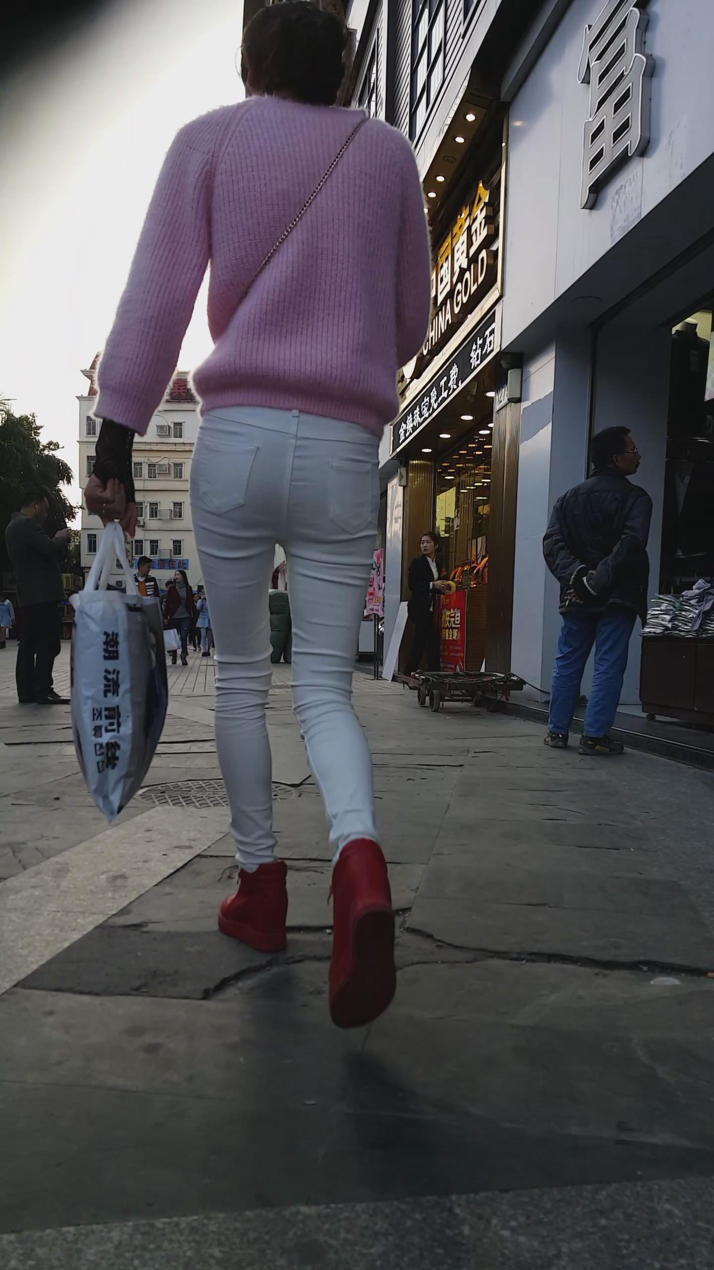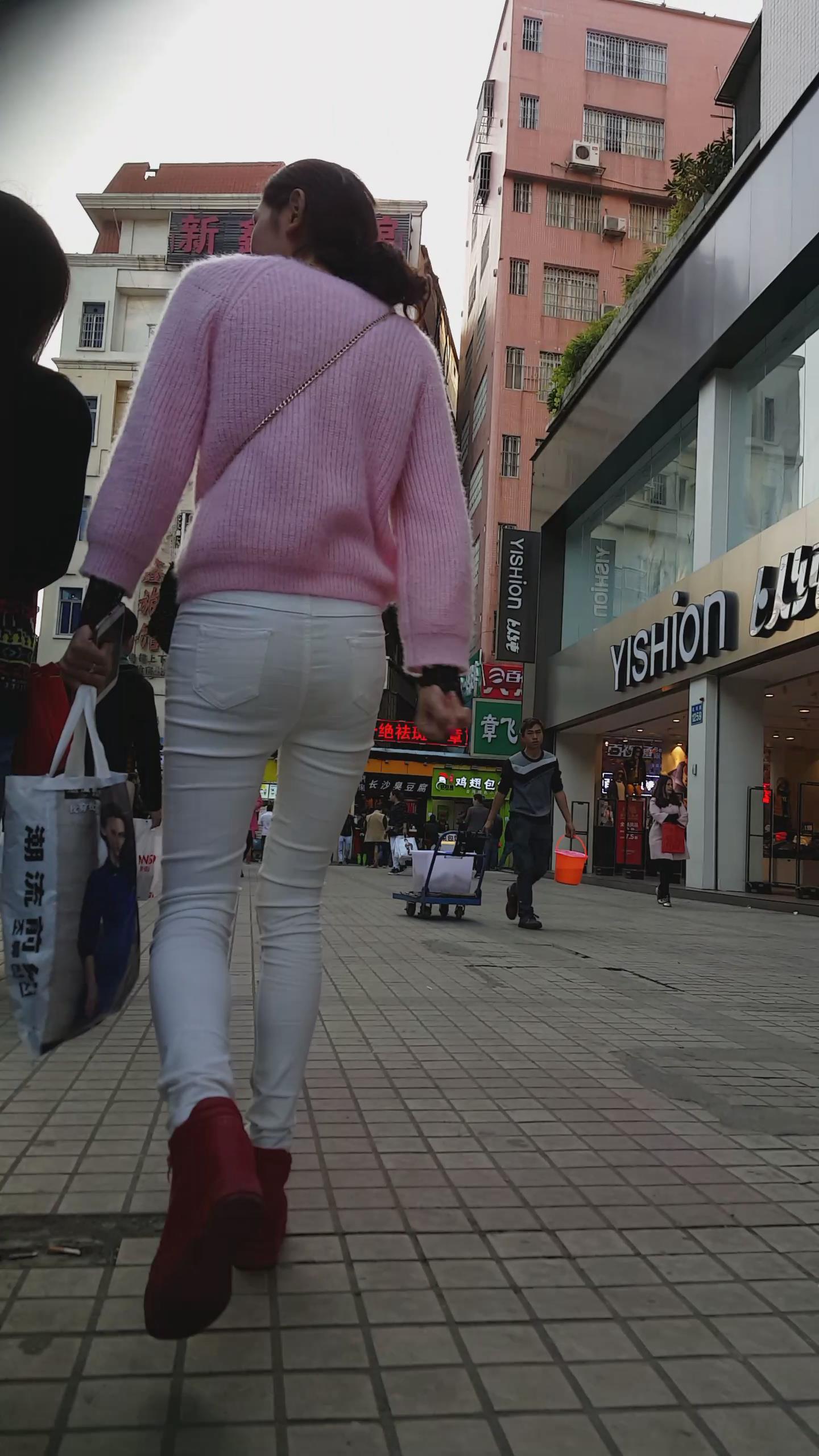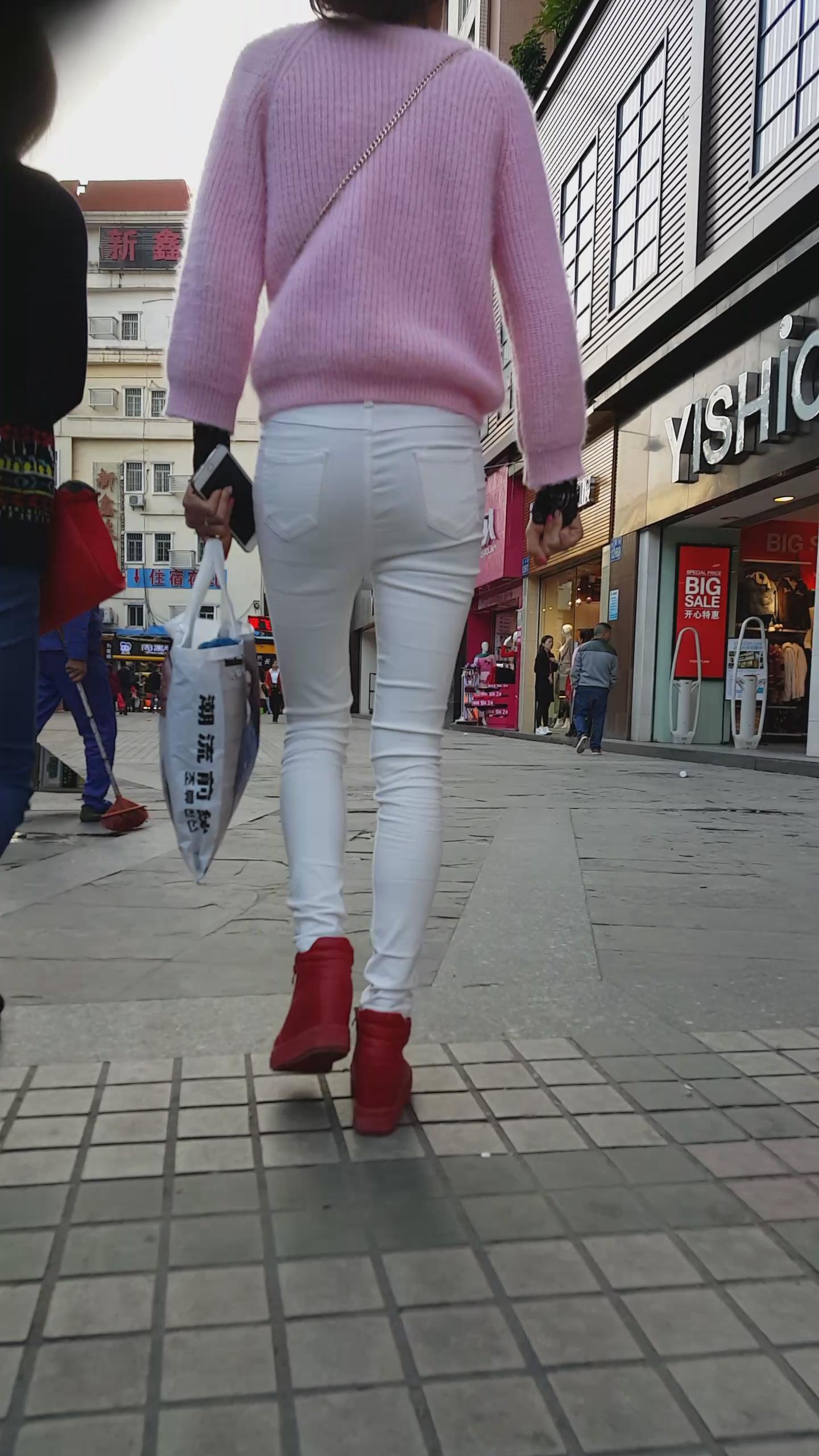 街拍粉衣白色紧身裤苗条美女 编号5943 |