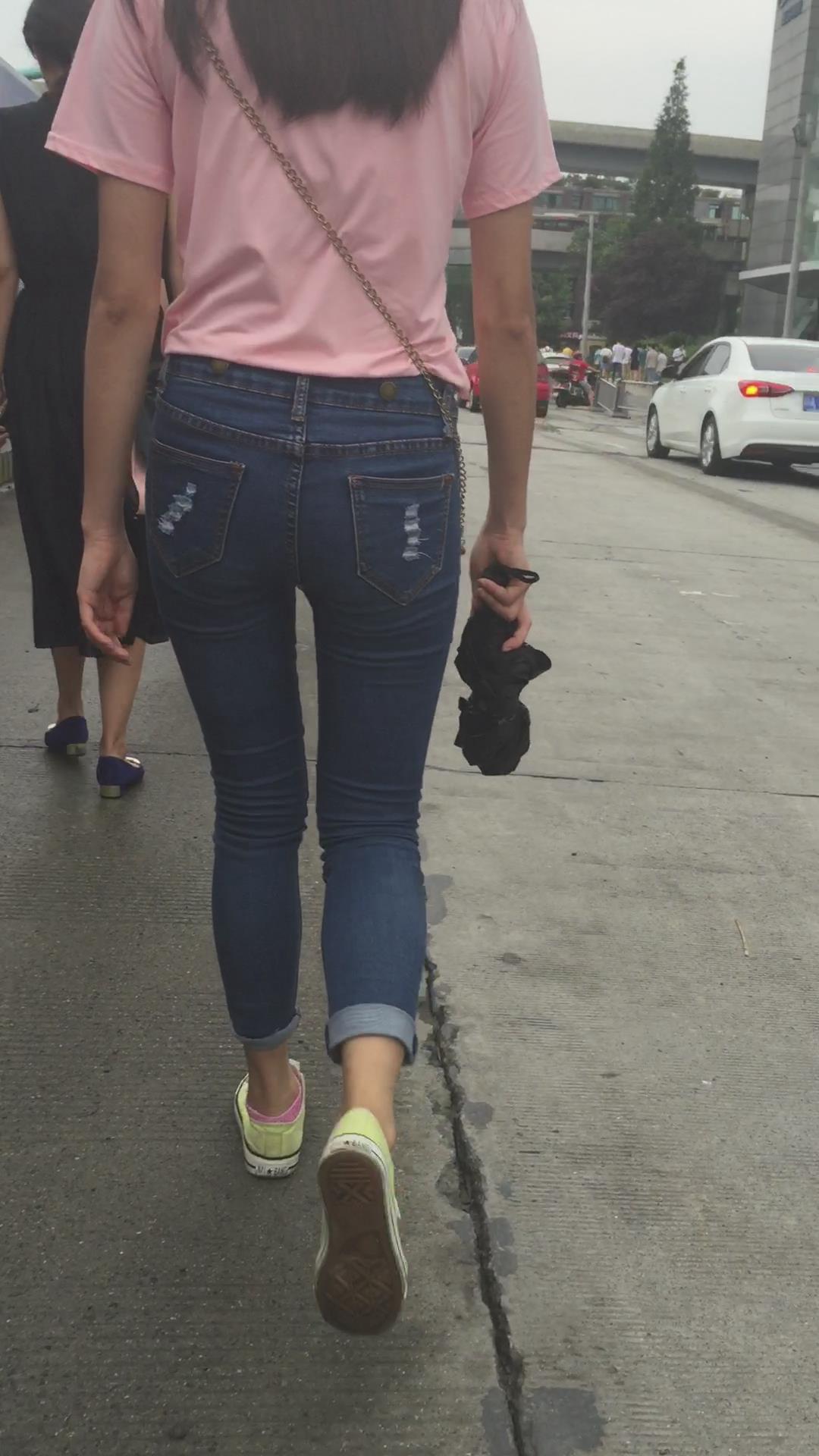 粉色T恤街拍紧身蓝色牛仔裤妹纸 编号6059 |