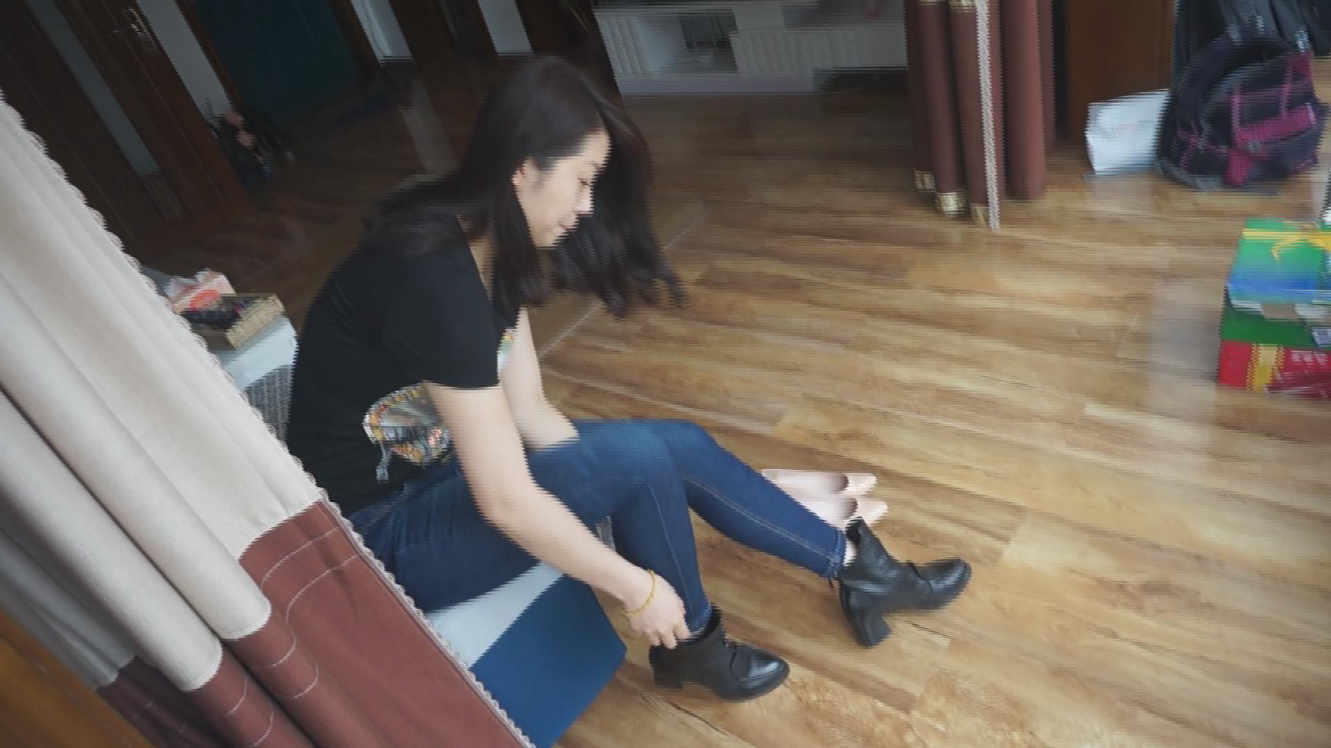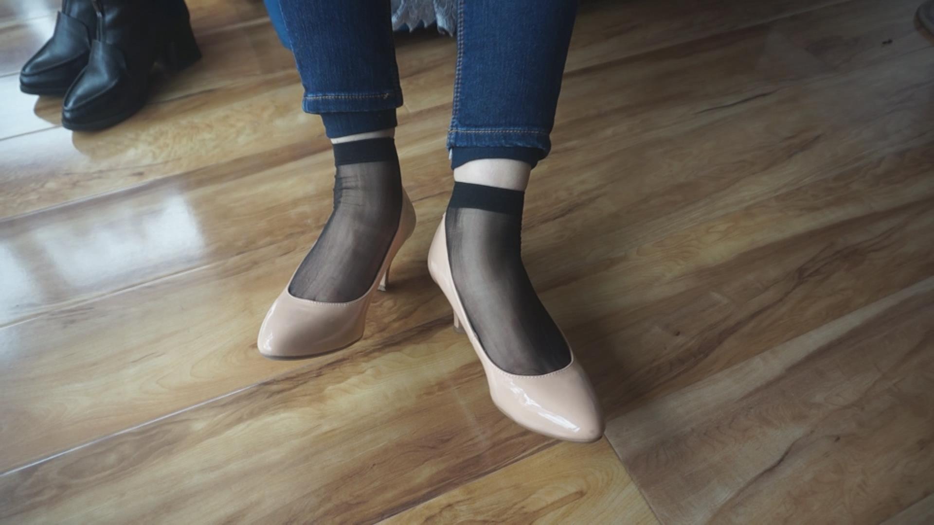 紧身蓝牛黑T恤米色高跟鞋丝袜美足姐姐 编号6437 |