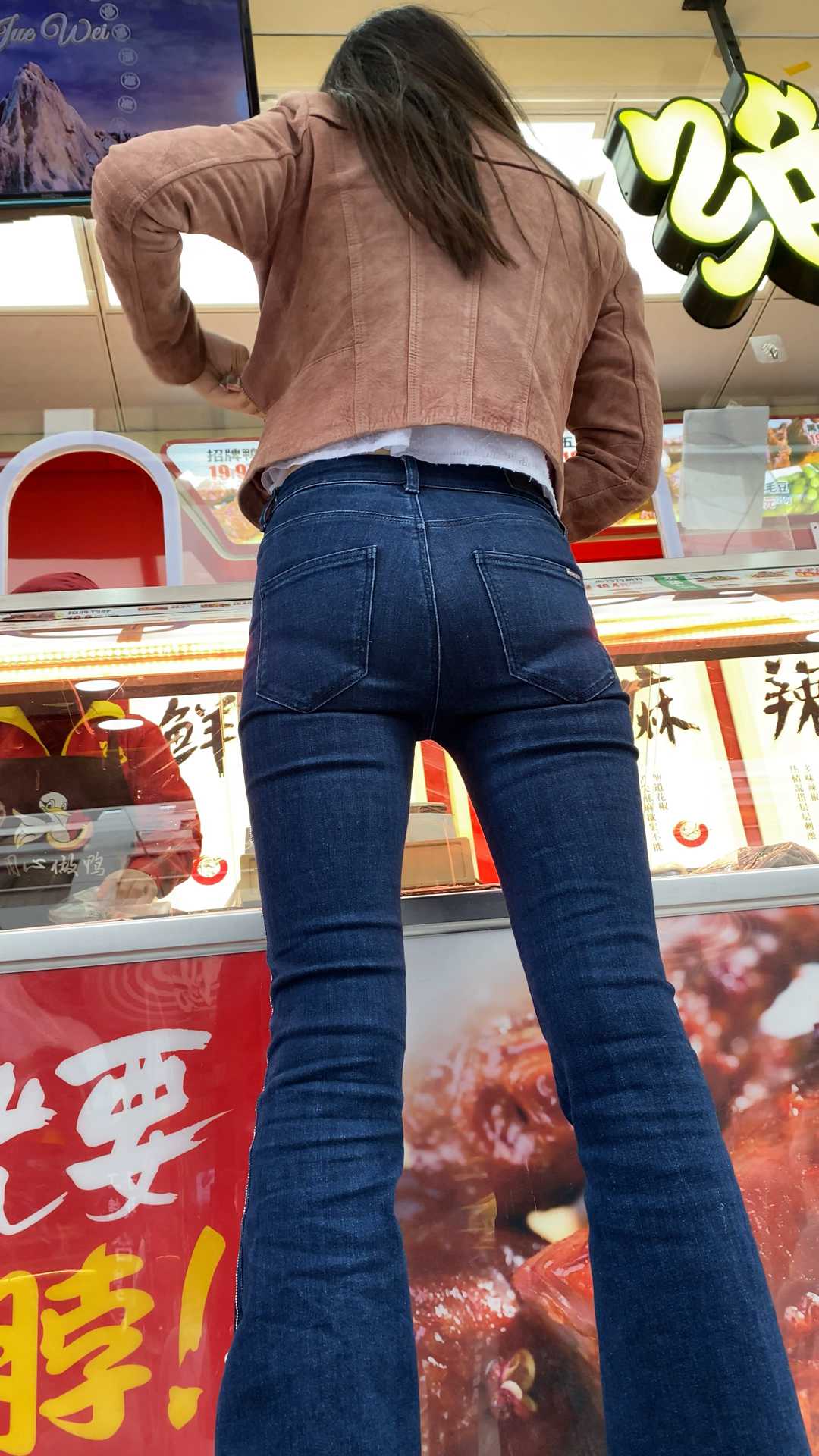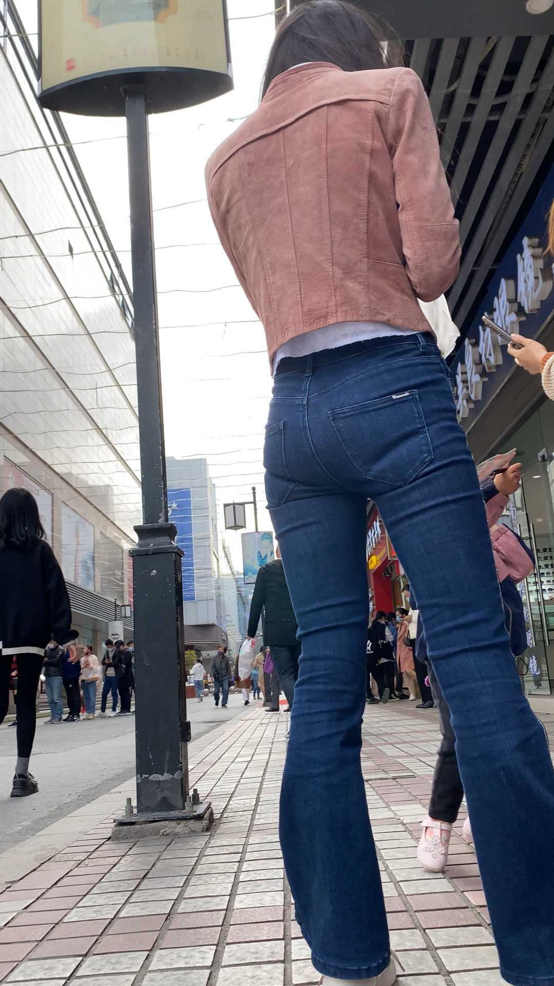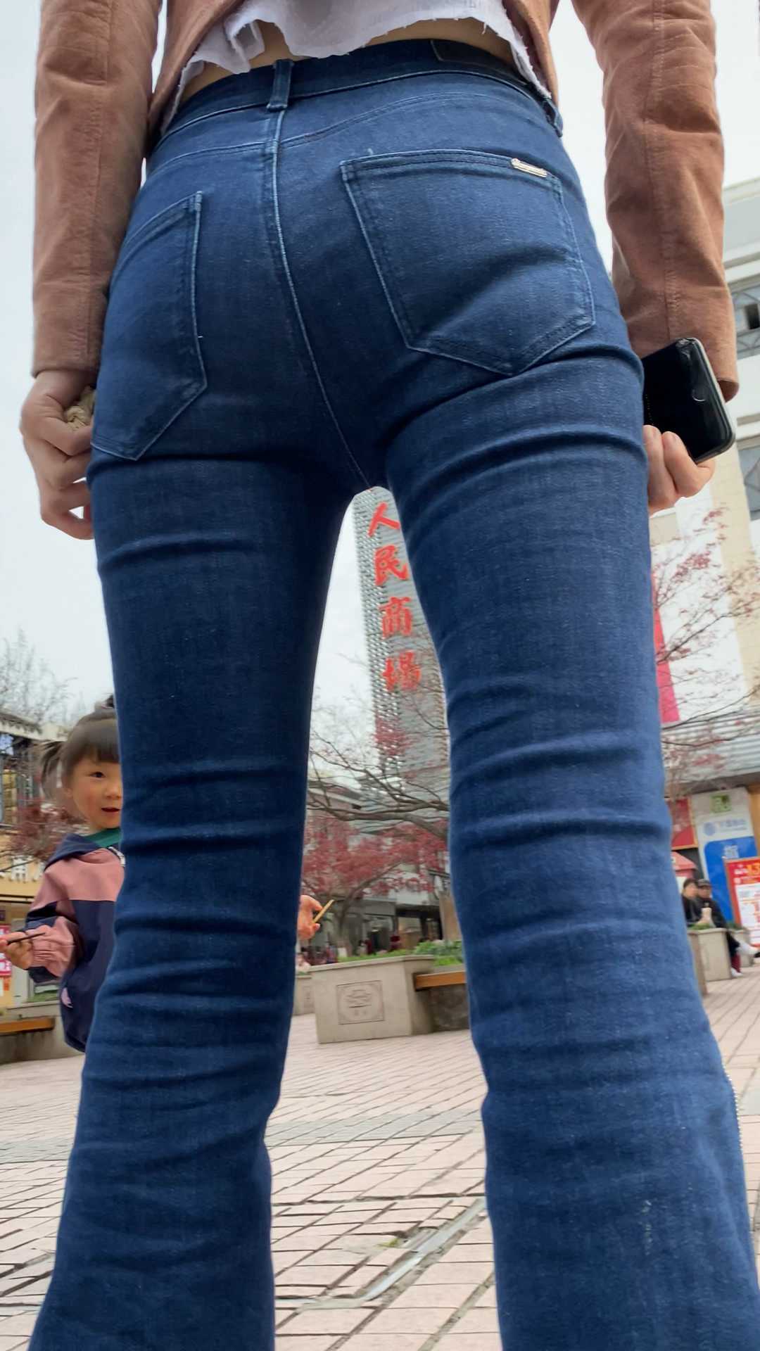 B1141喇叭牛仔紧臀紧内痕长发小姐姐