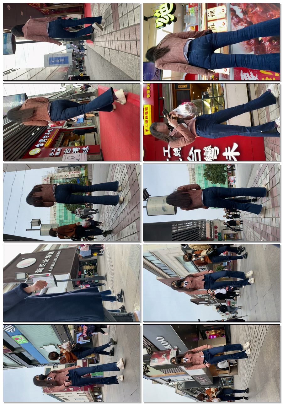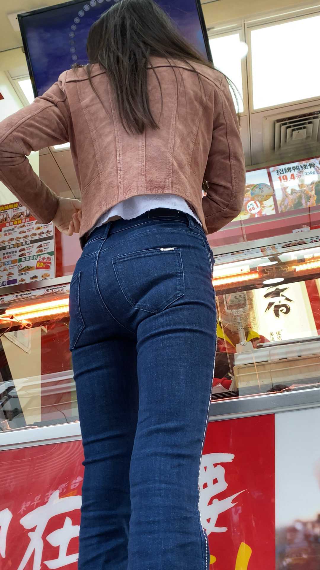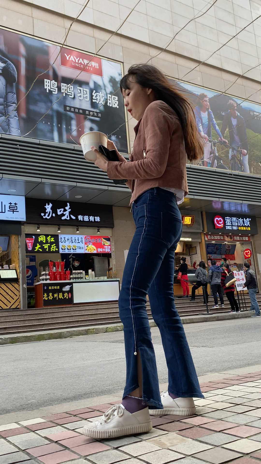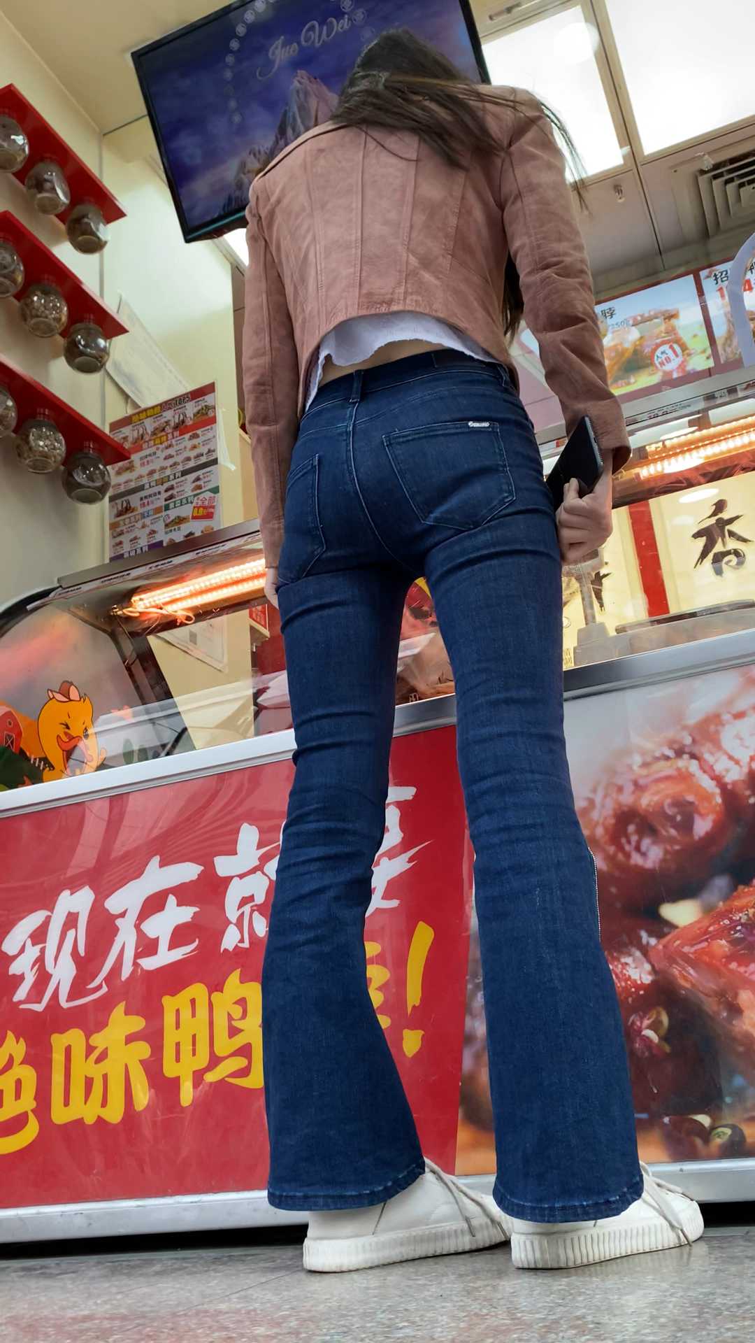 B1141喇叭牛仔紧臀紧内痕长发小姐姐