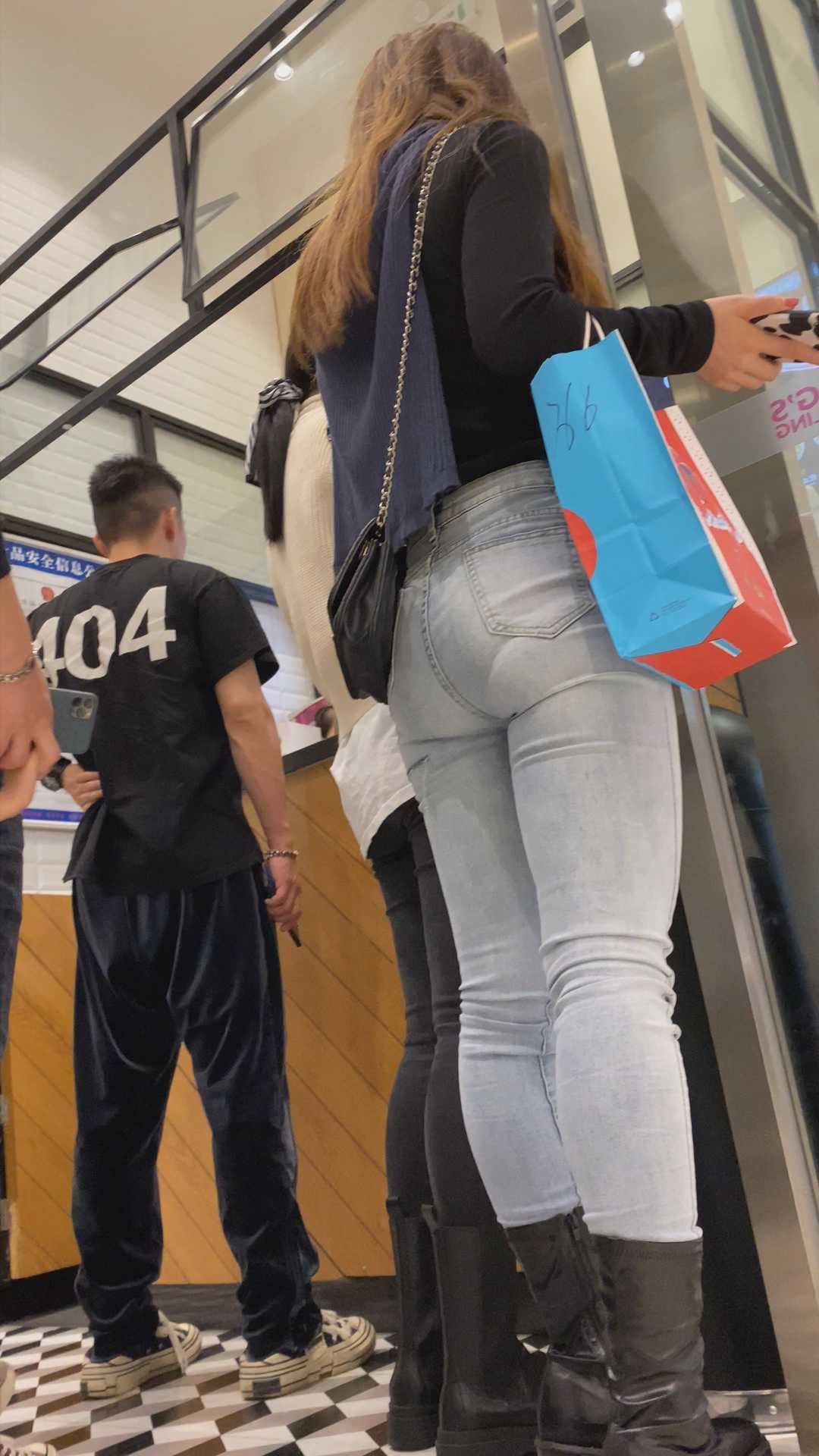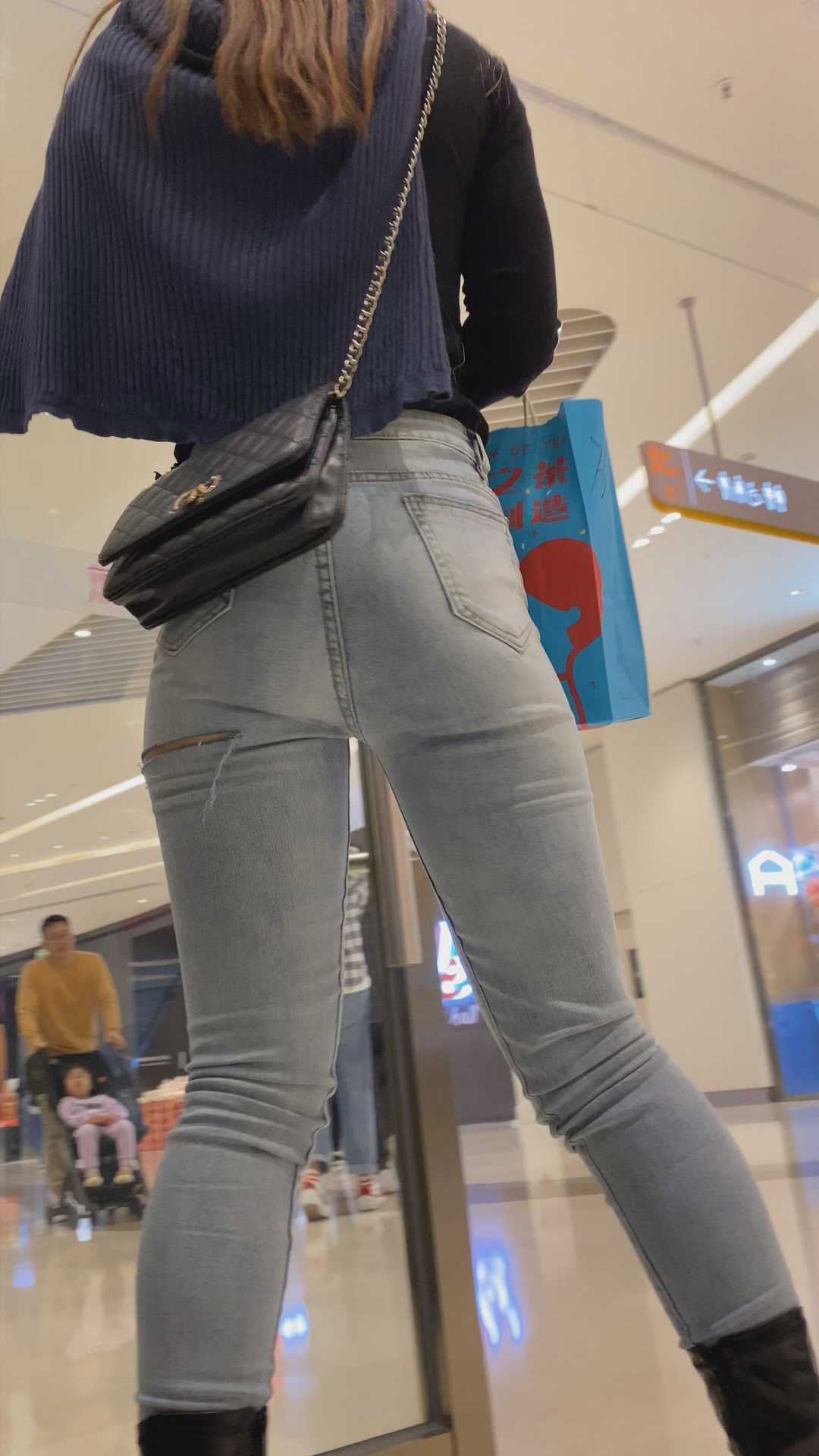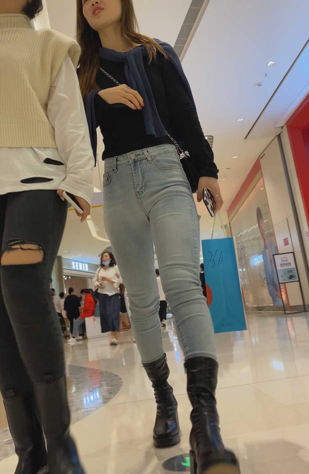 B1350超紧白牛仔透V内痕美女
