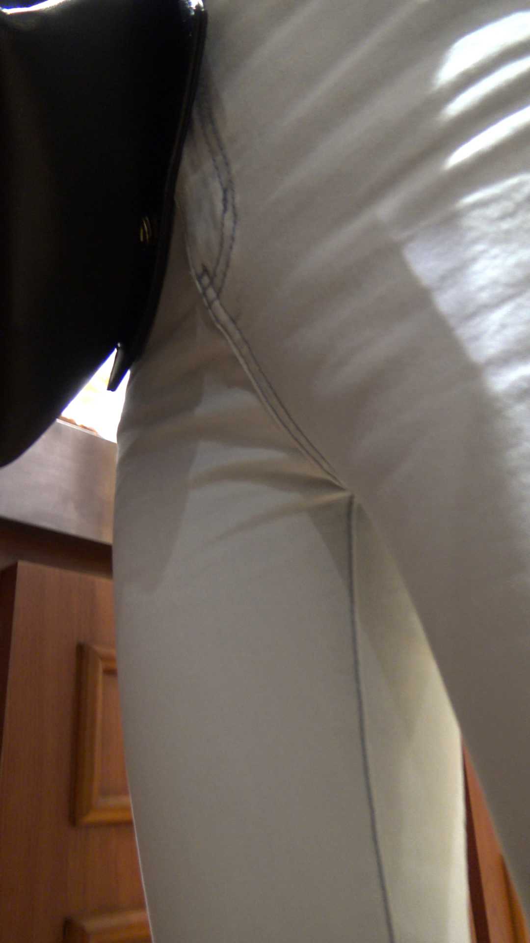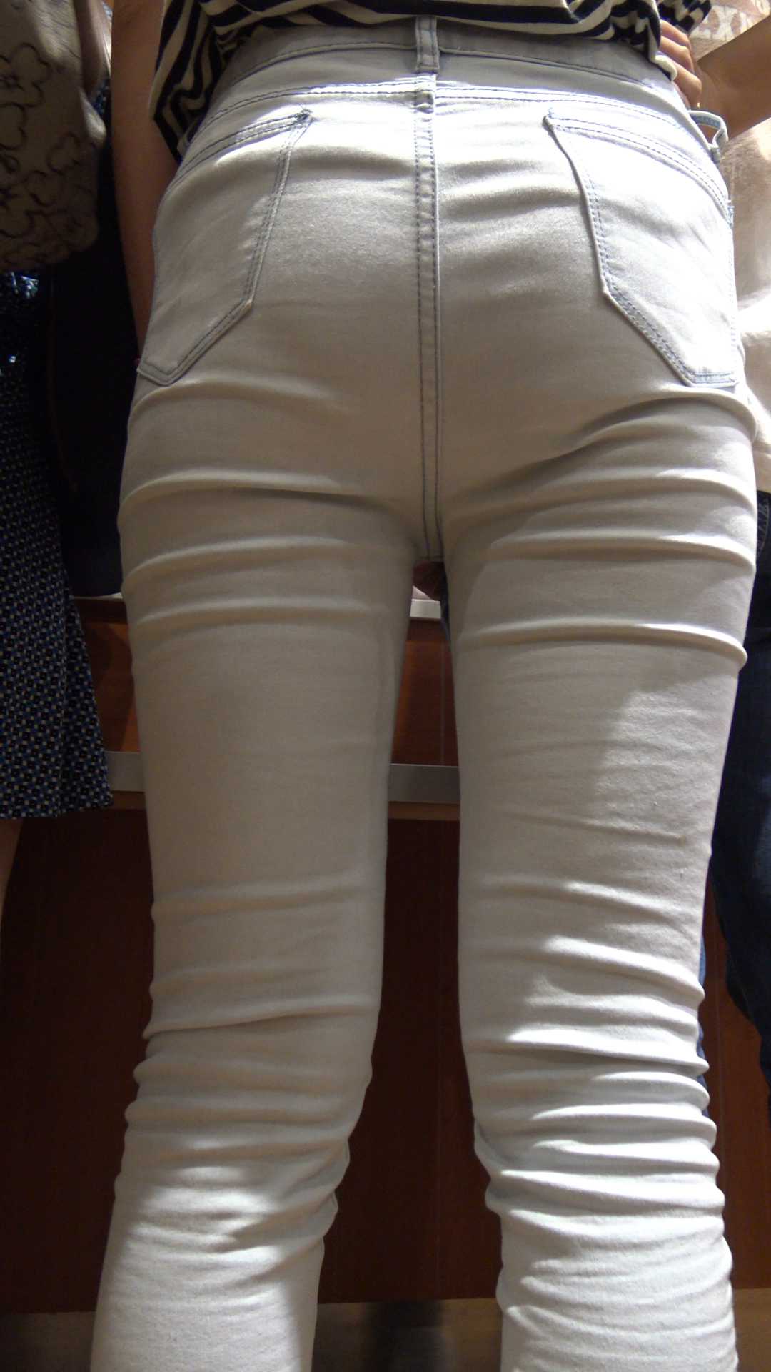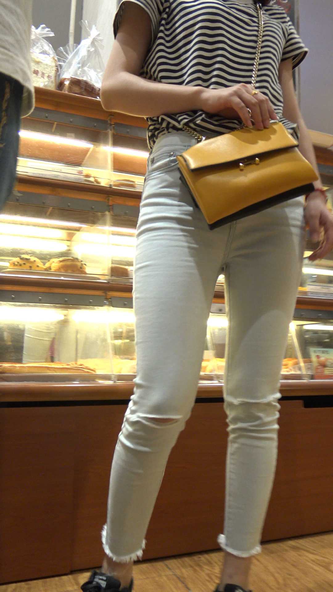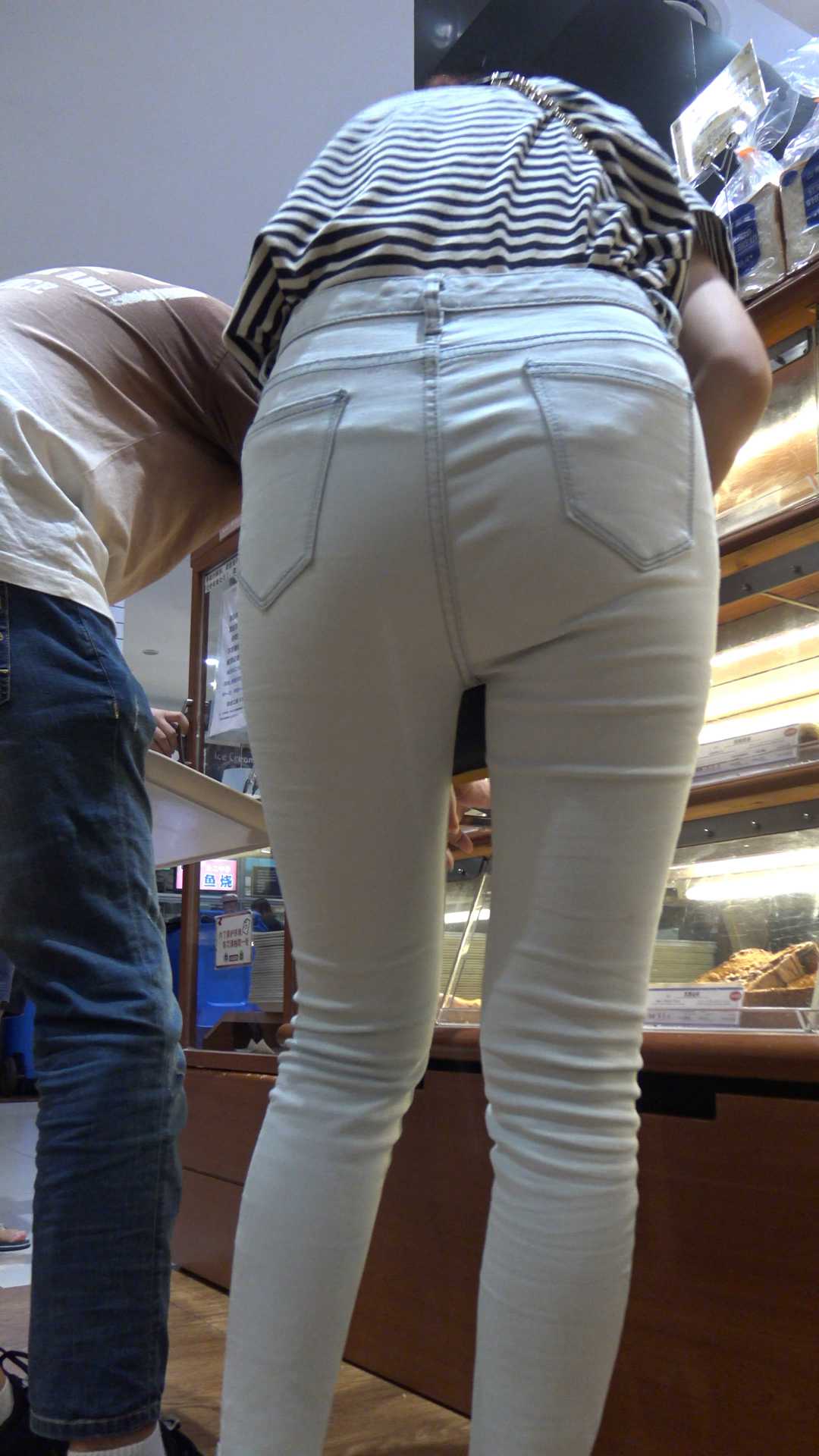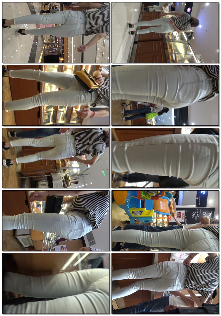 C414包臀白牛仔裤弯腰露翘臀