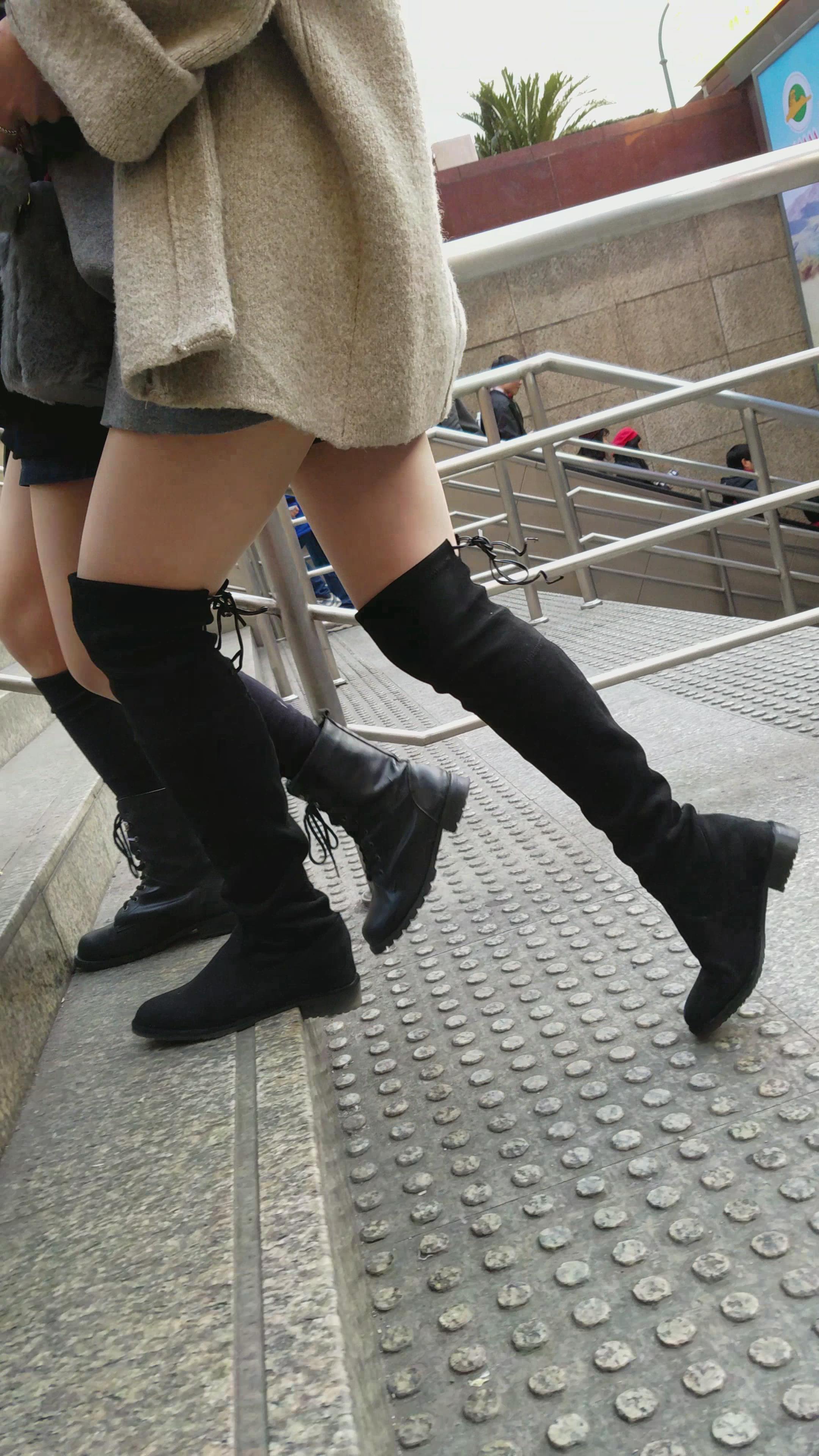 4k-街拍长筒靴肉色丝袜美颜俩姐妹花 编号3299
