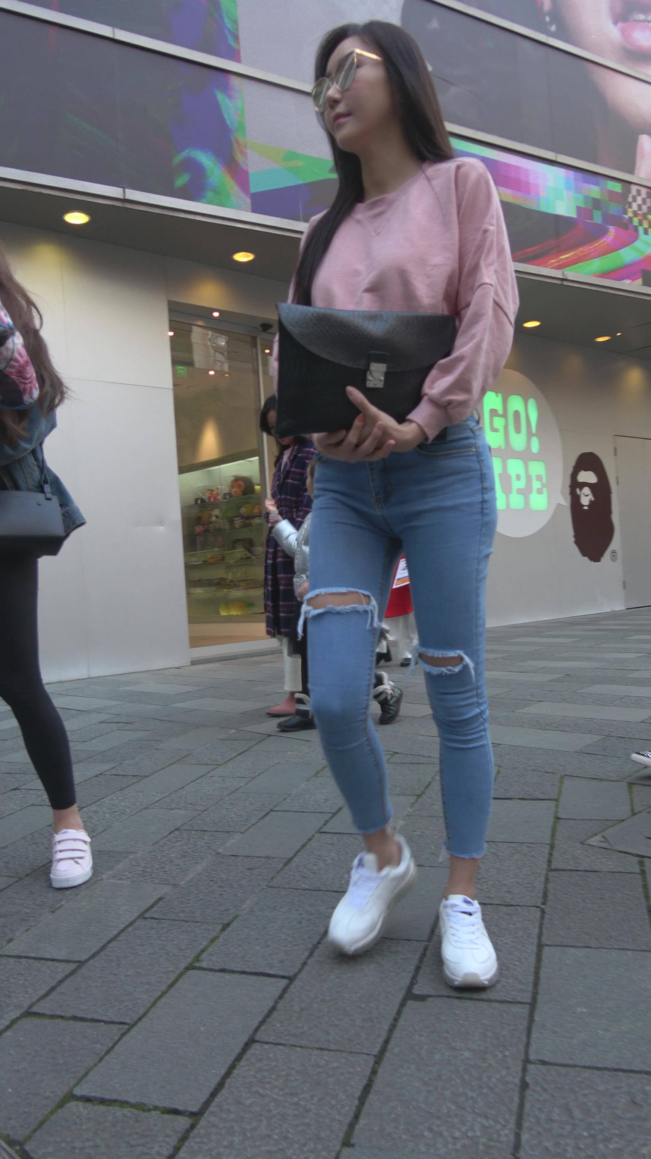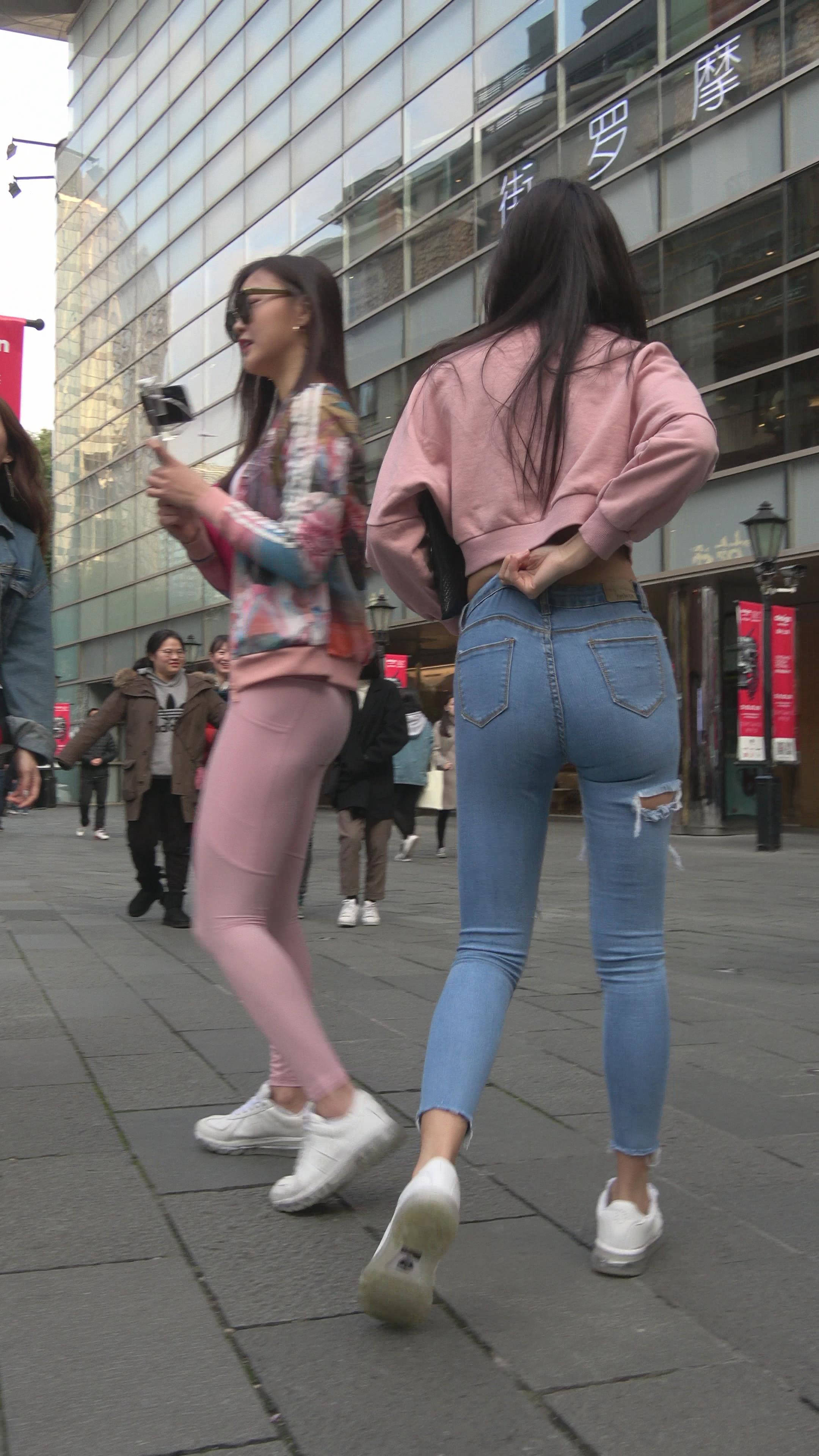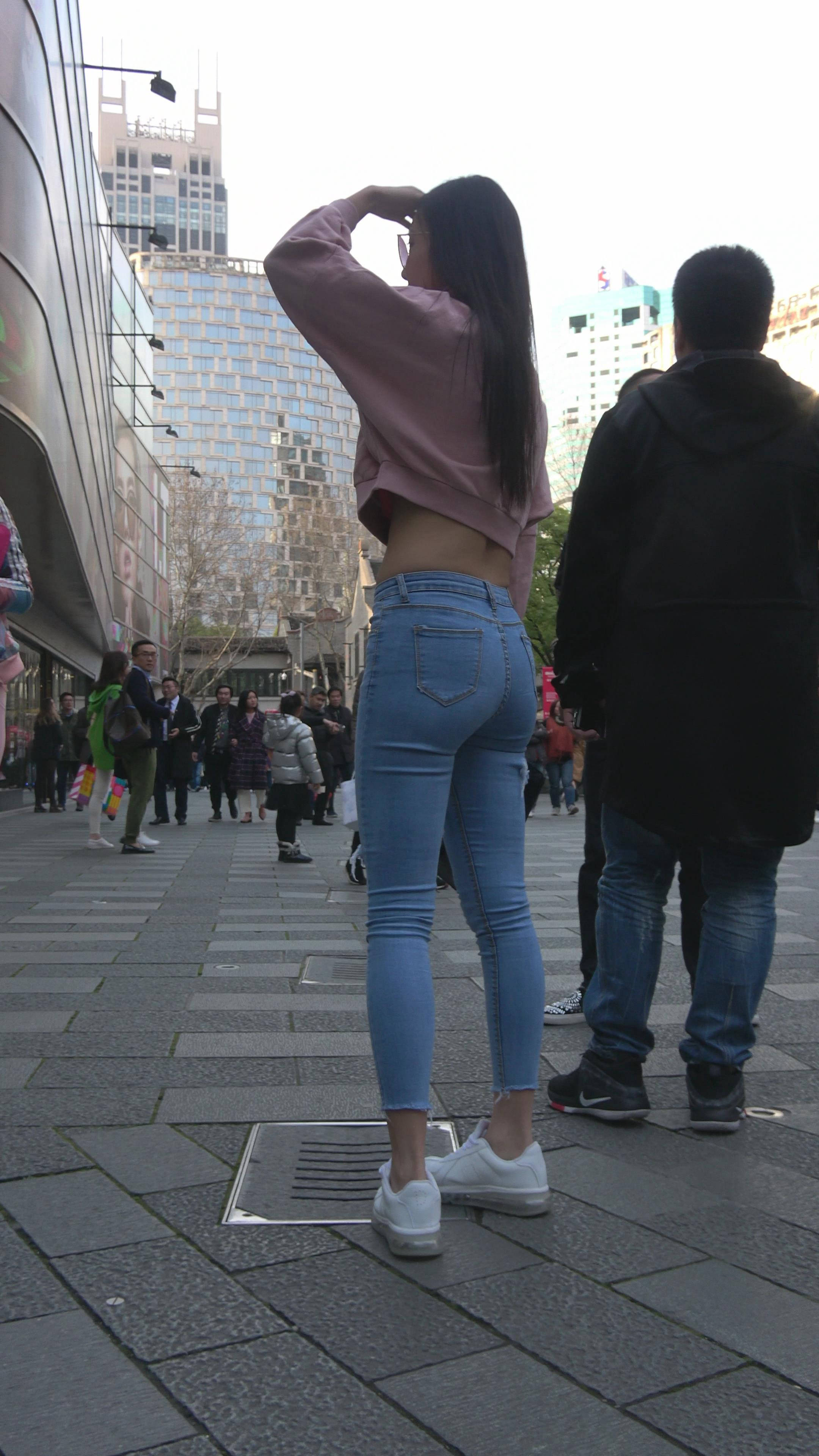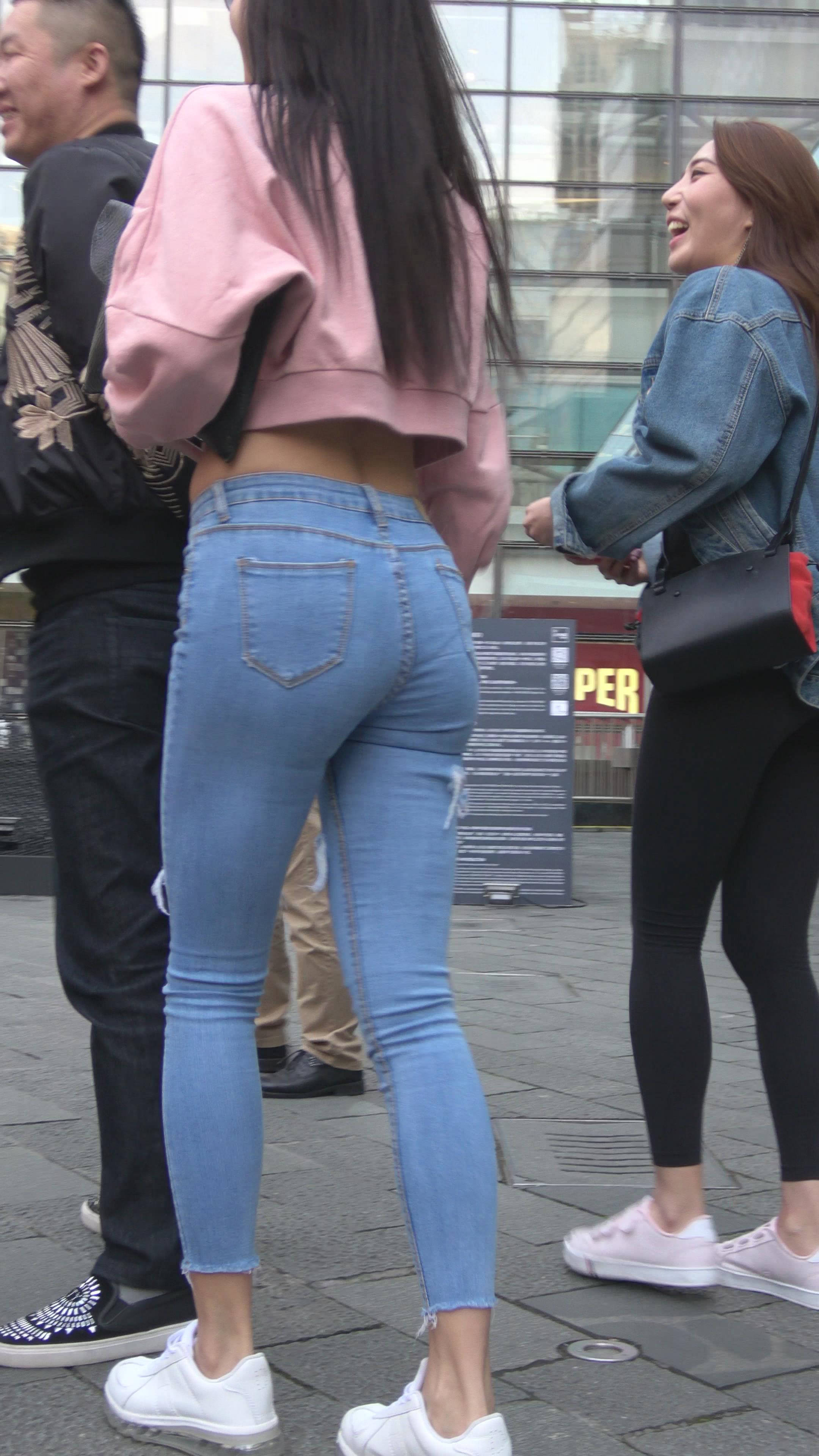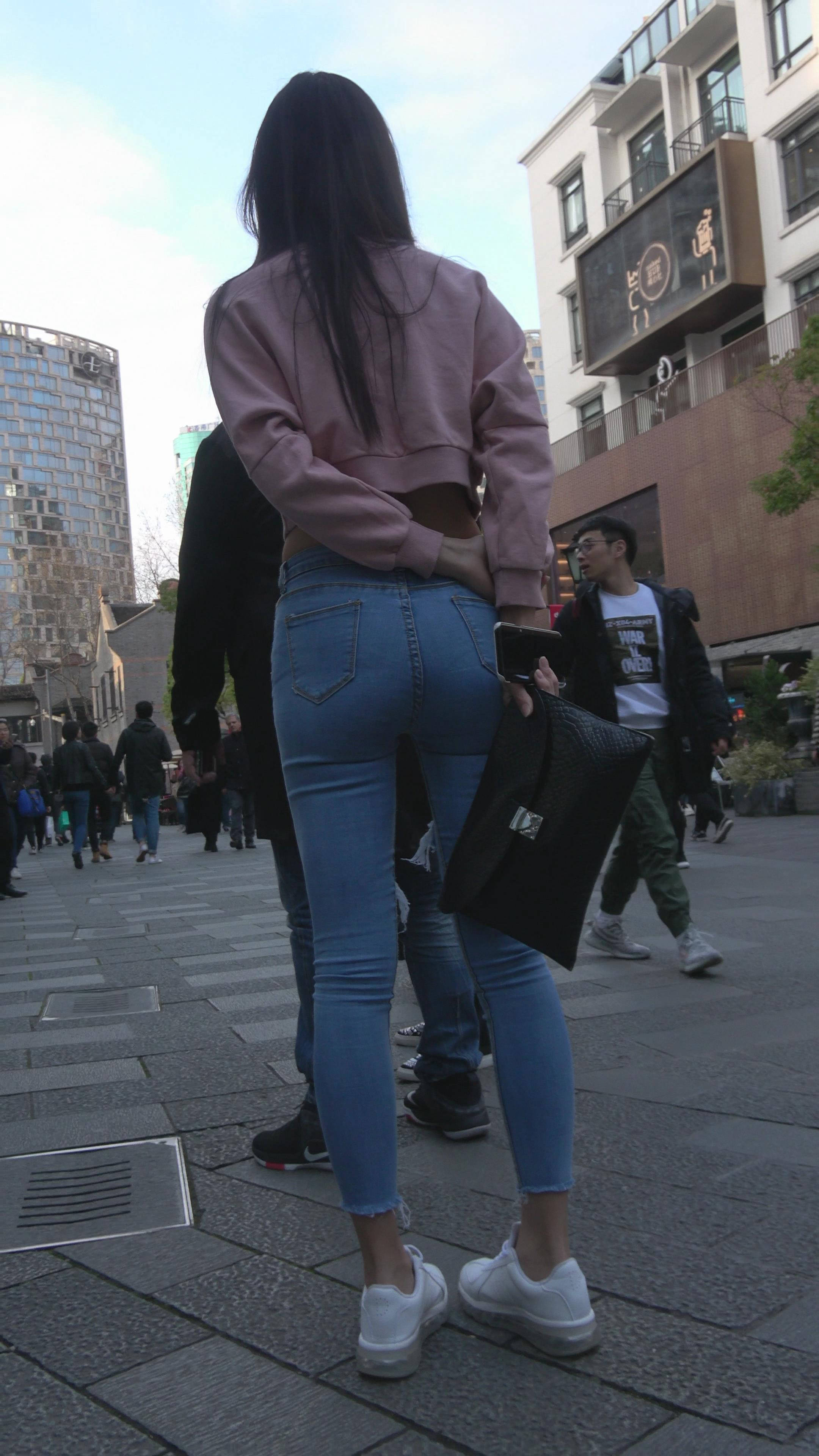 4K 超紧身牛仔裤粉色外套美女 编号7334