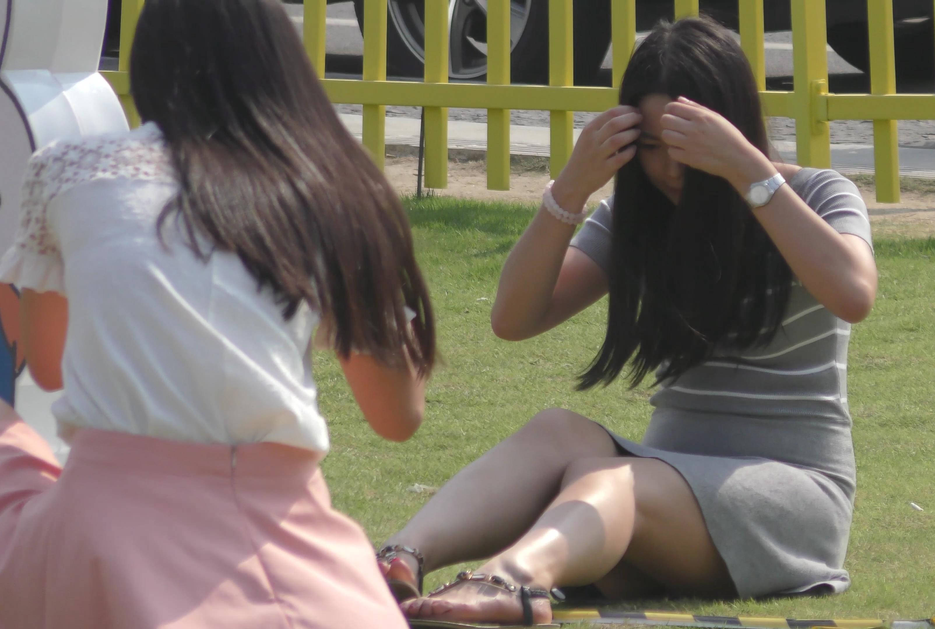 4k-公园草地上忙拍照的两位粉嫩少女,内内走光一点没发觉 编号7439