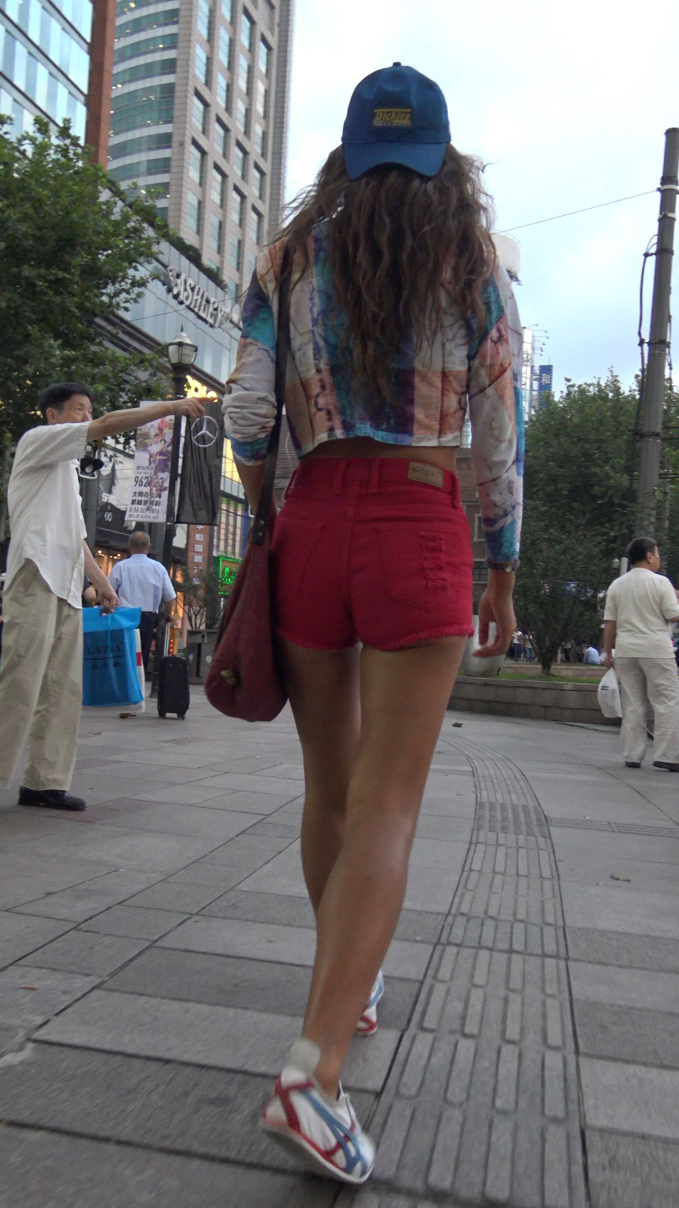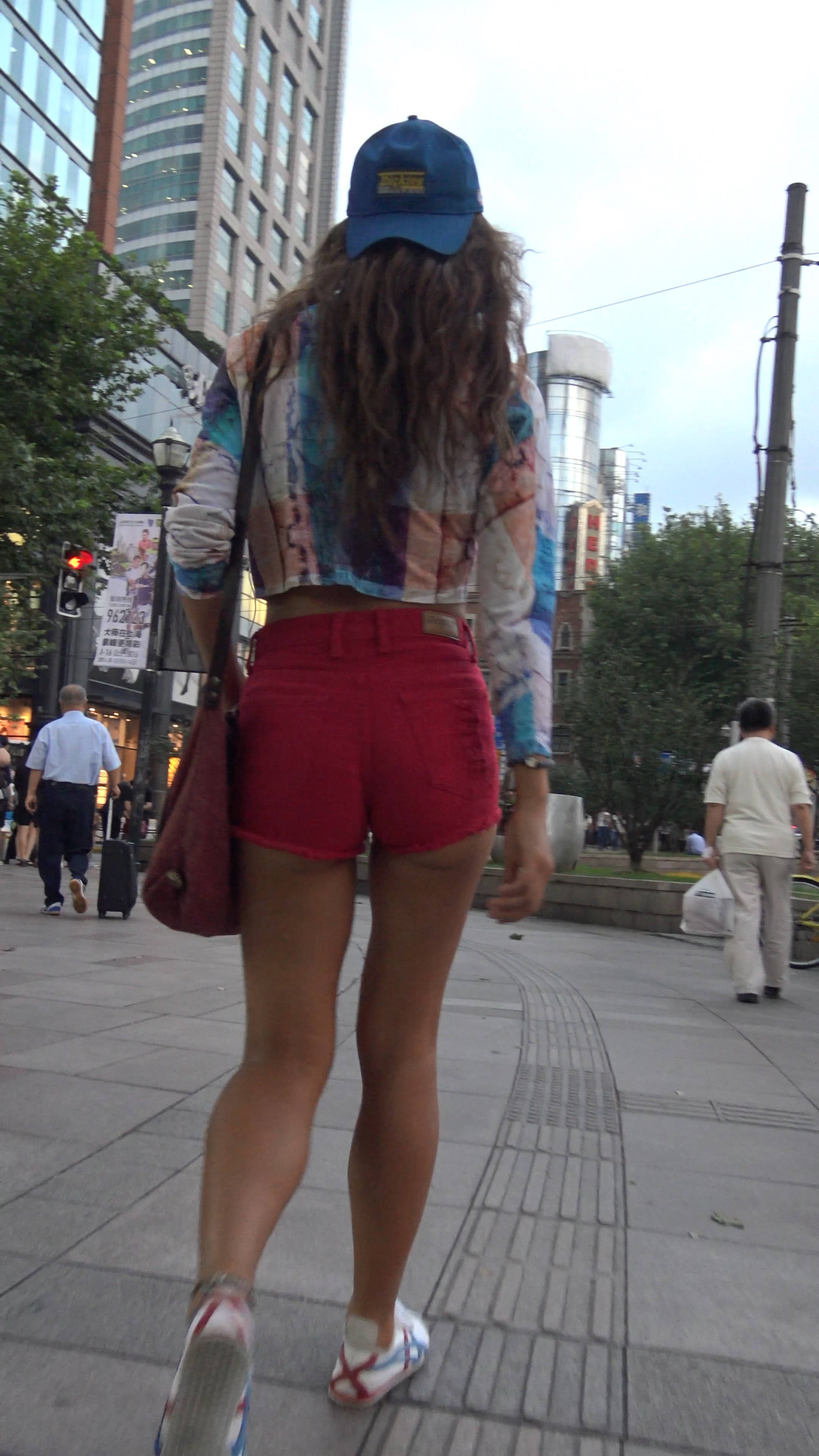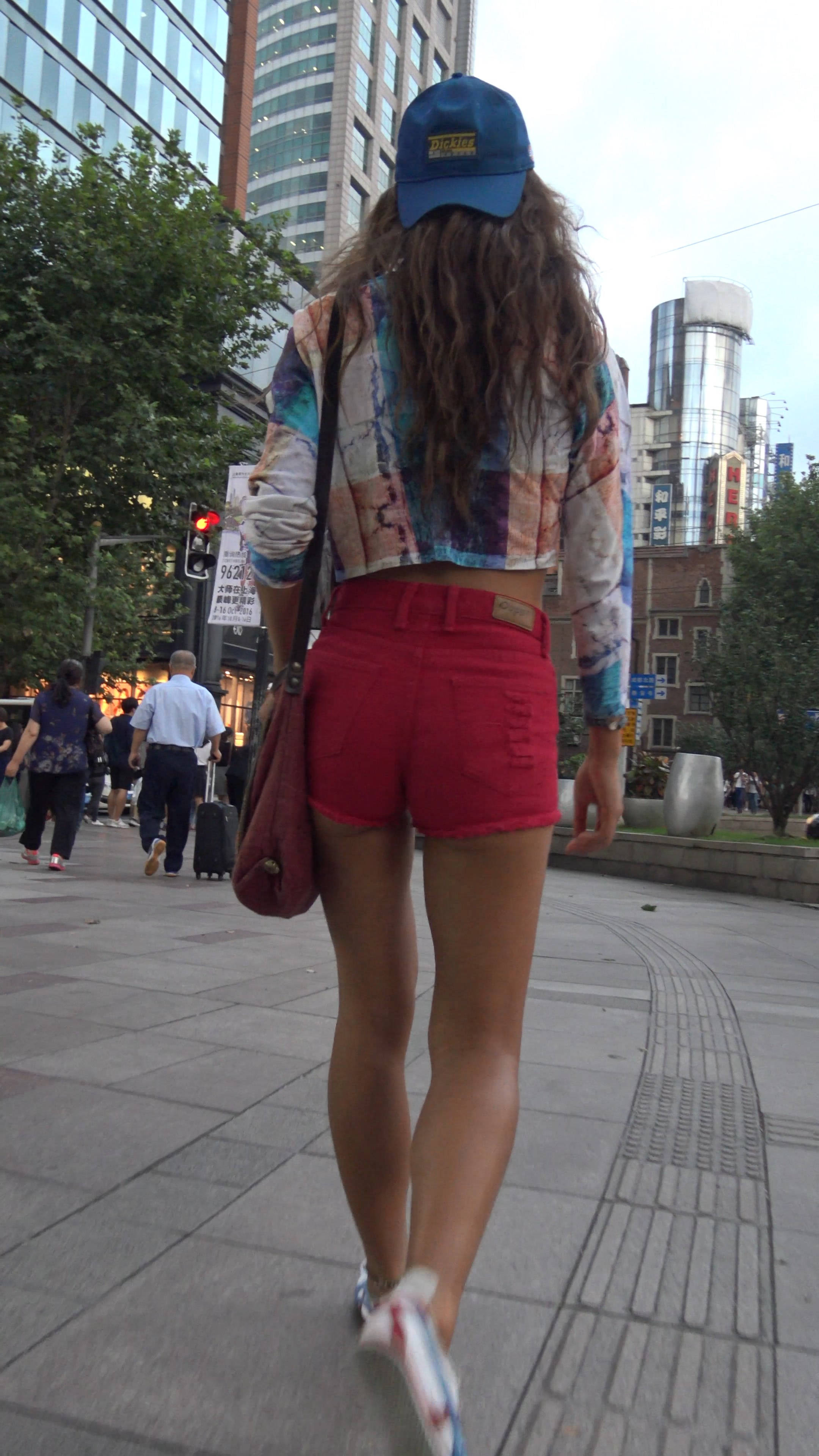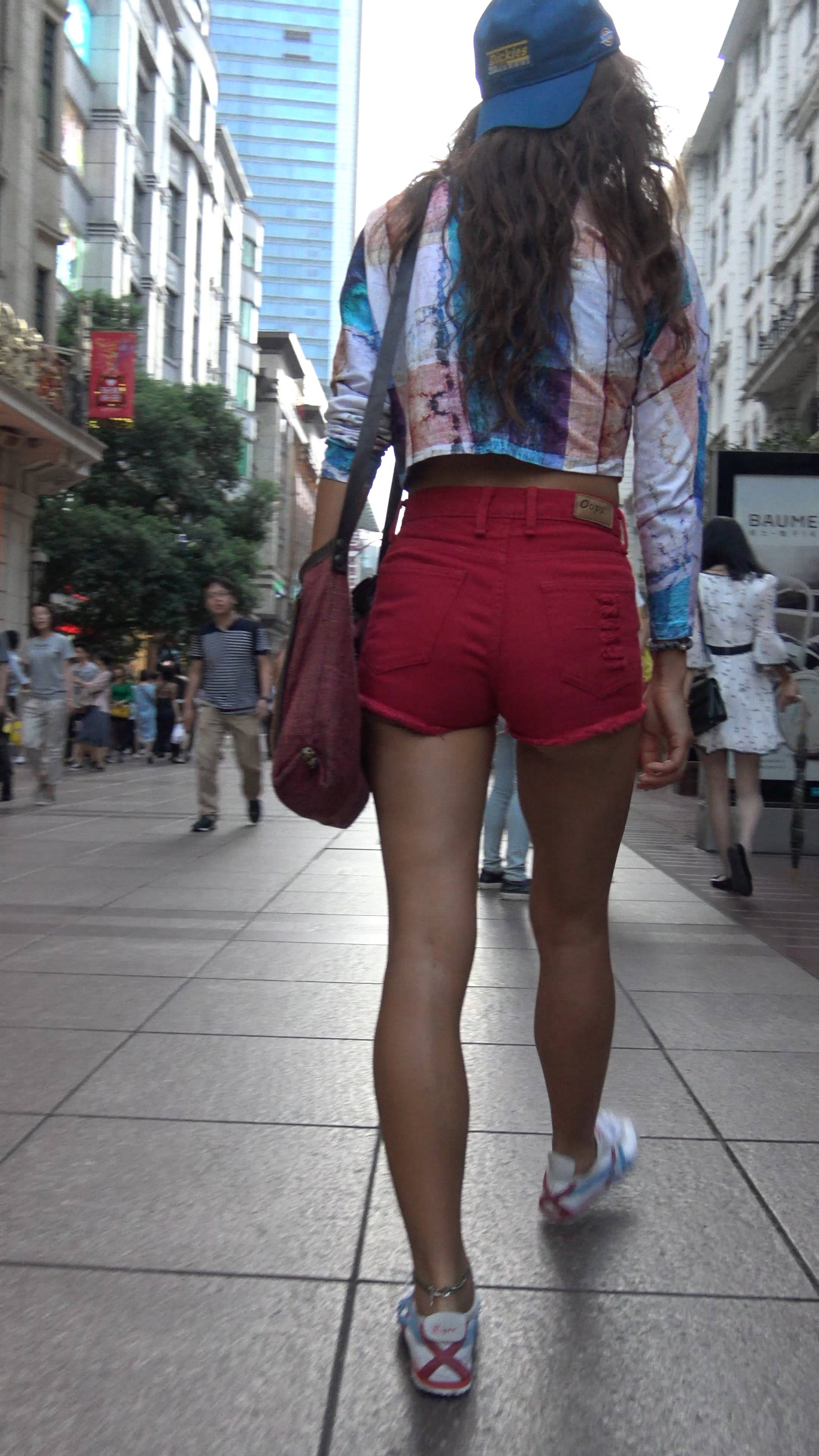 4k-街拍皮肤黝黑的红色高腰短热裤女孩 编号7542