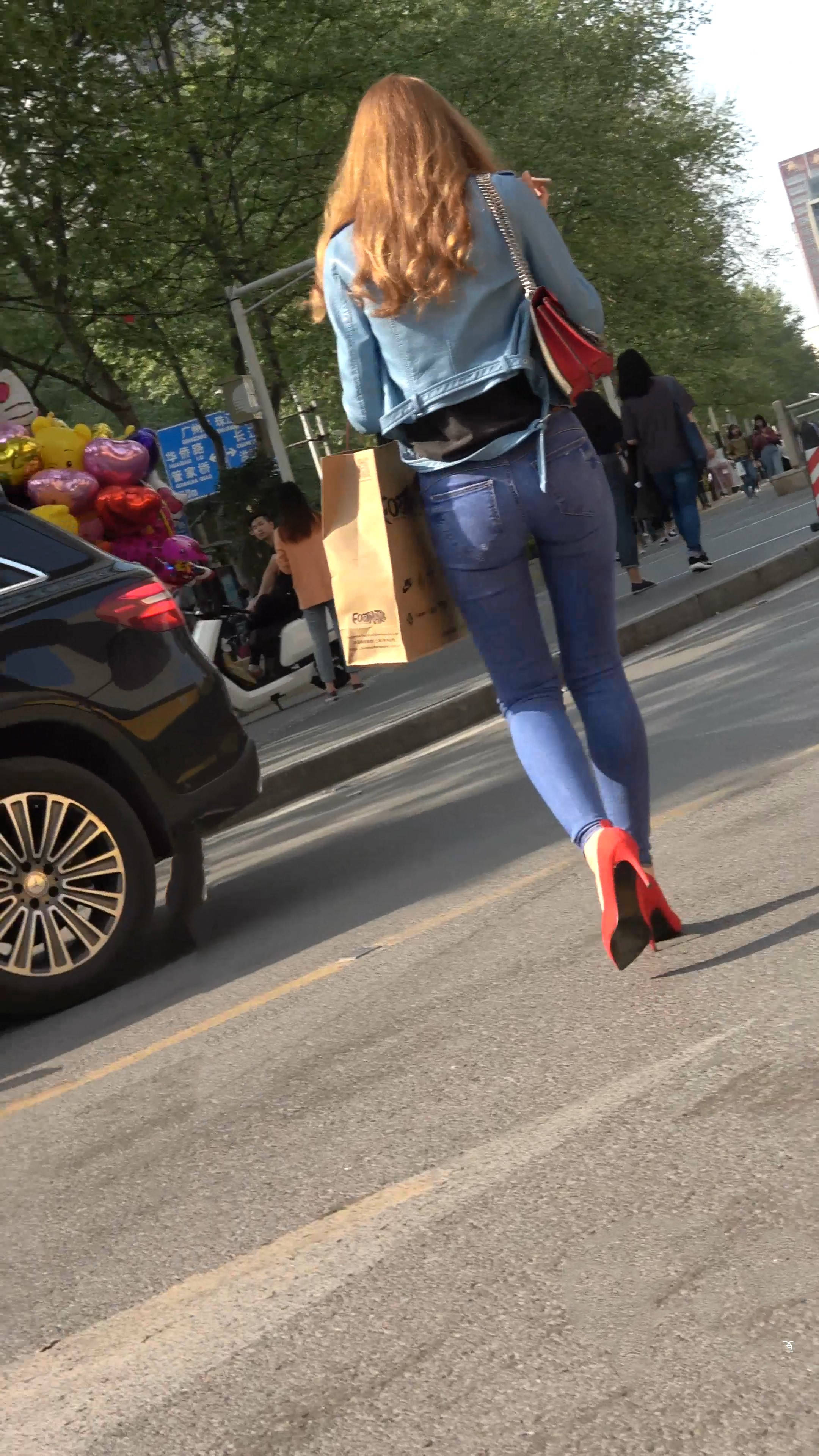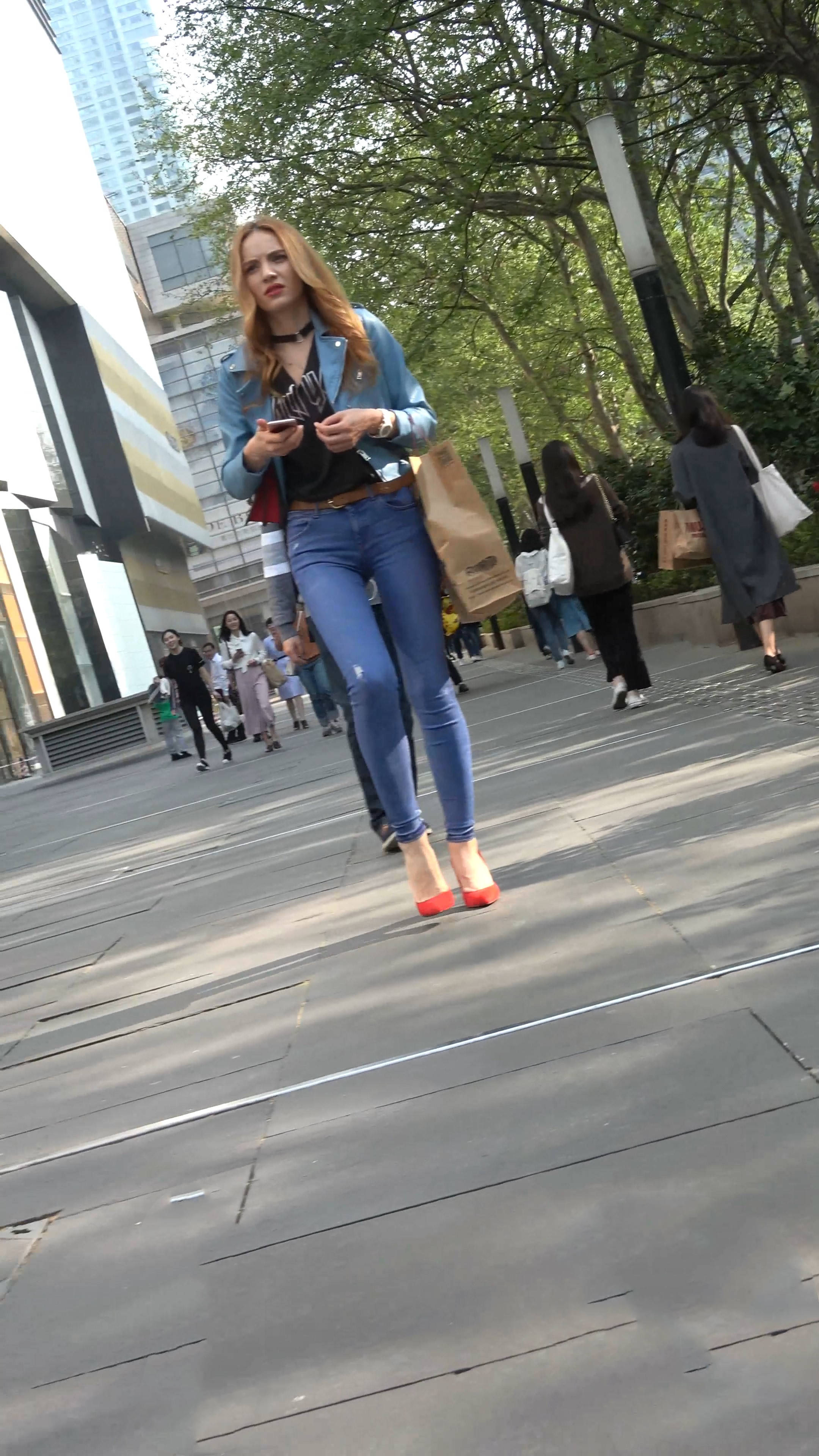 4k-街拍超紧身蓝牛红高跟鞋高挑美女(下) 编号7579