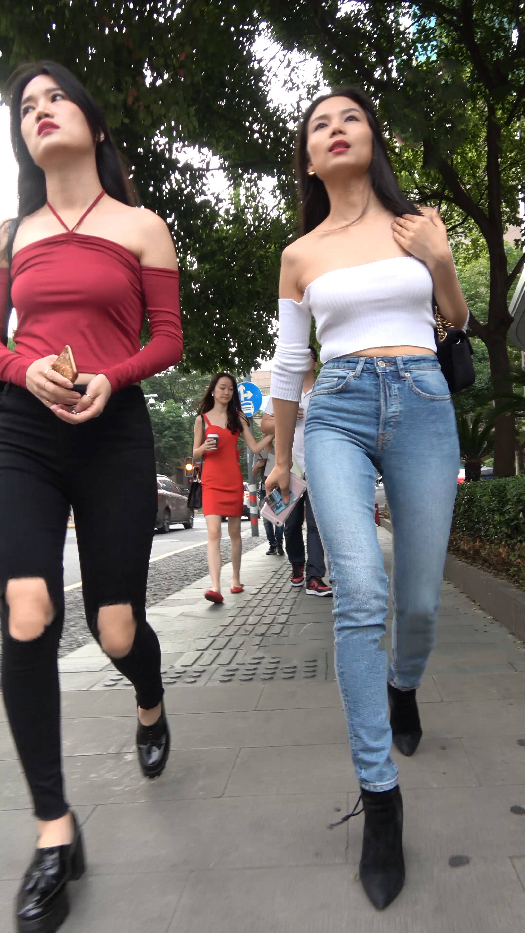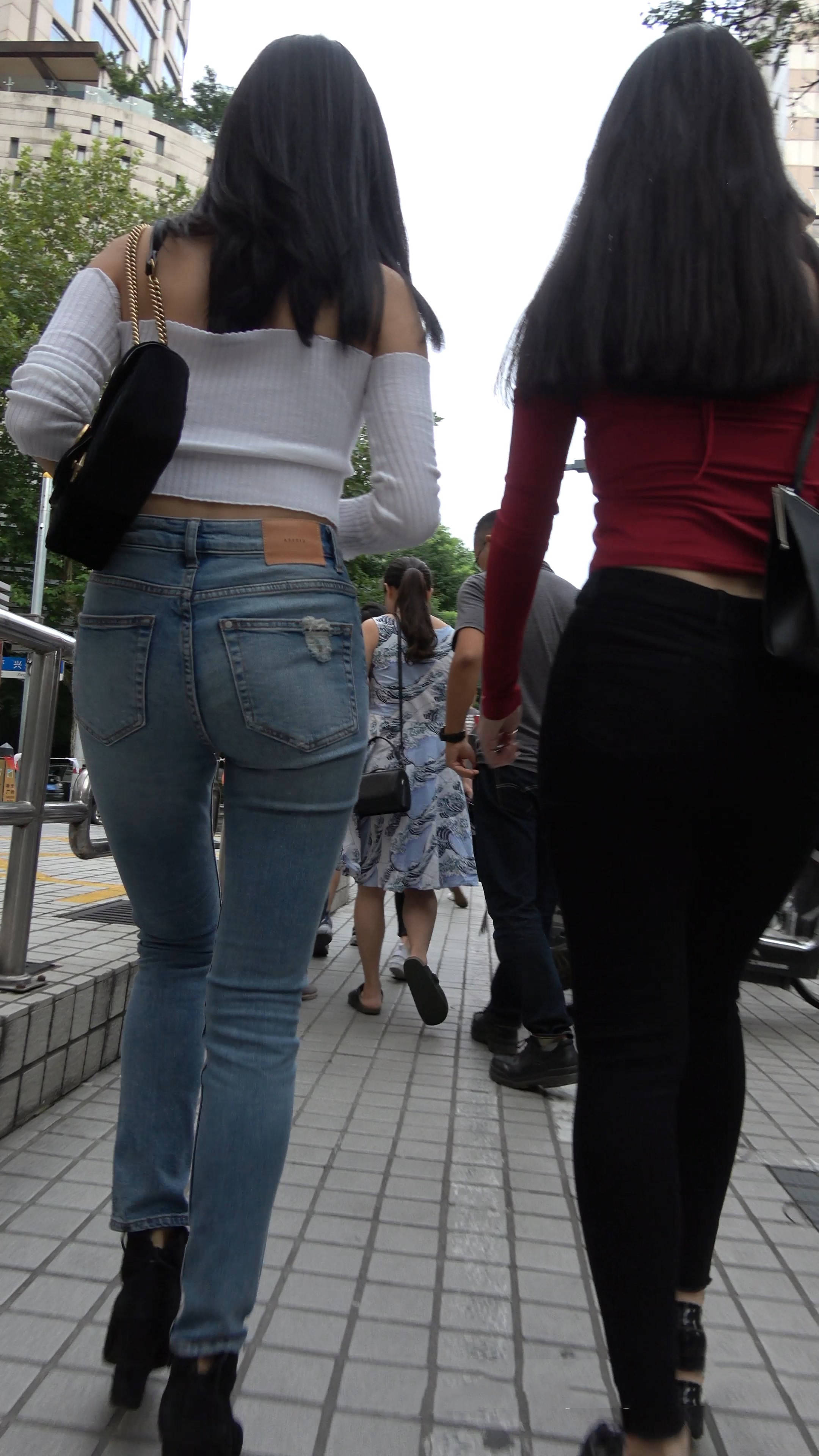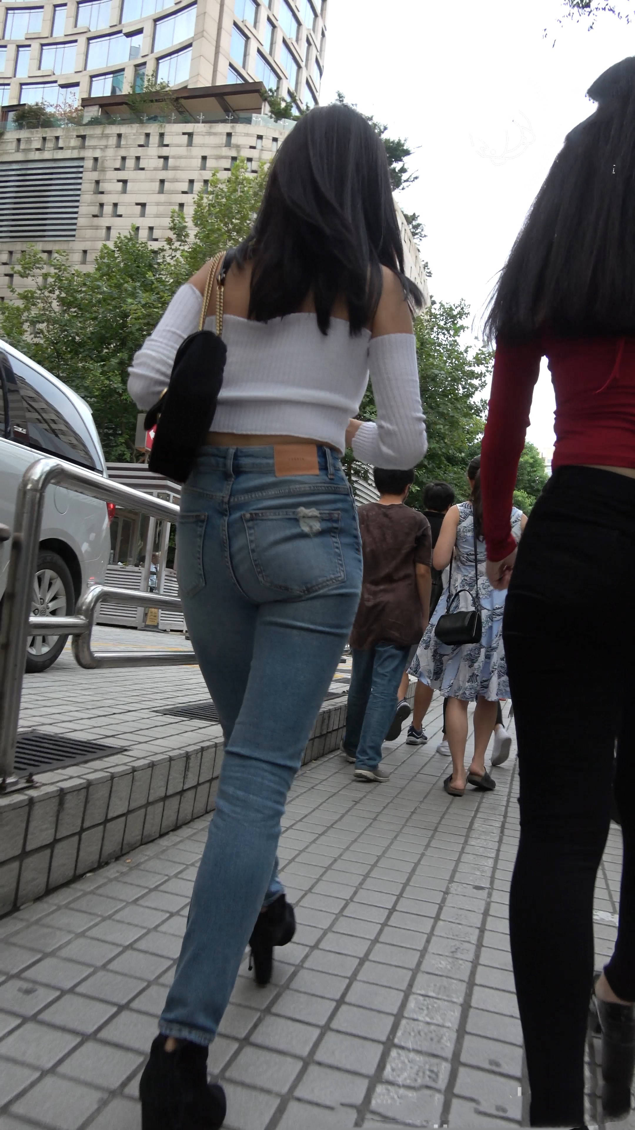 4k超清街拍一字抹胸蓝色紧牛美女 编号7685