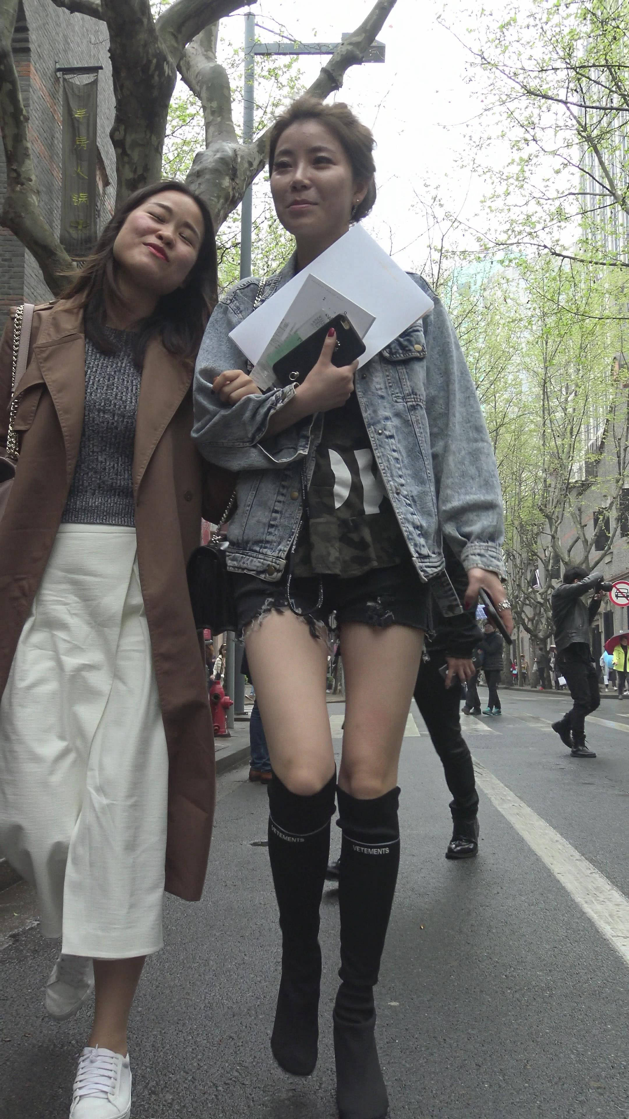 4K - 牛仔外套超短裤高挑街拍性感美女 编号7719