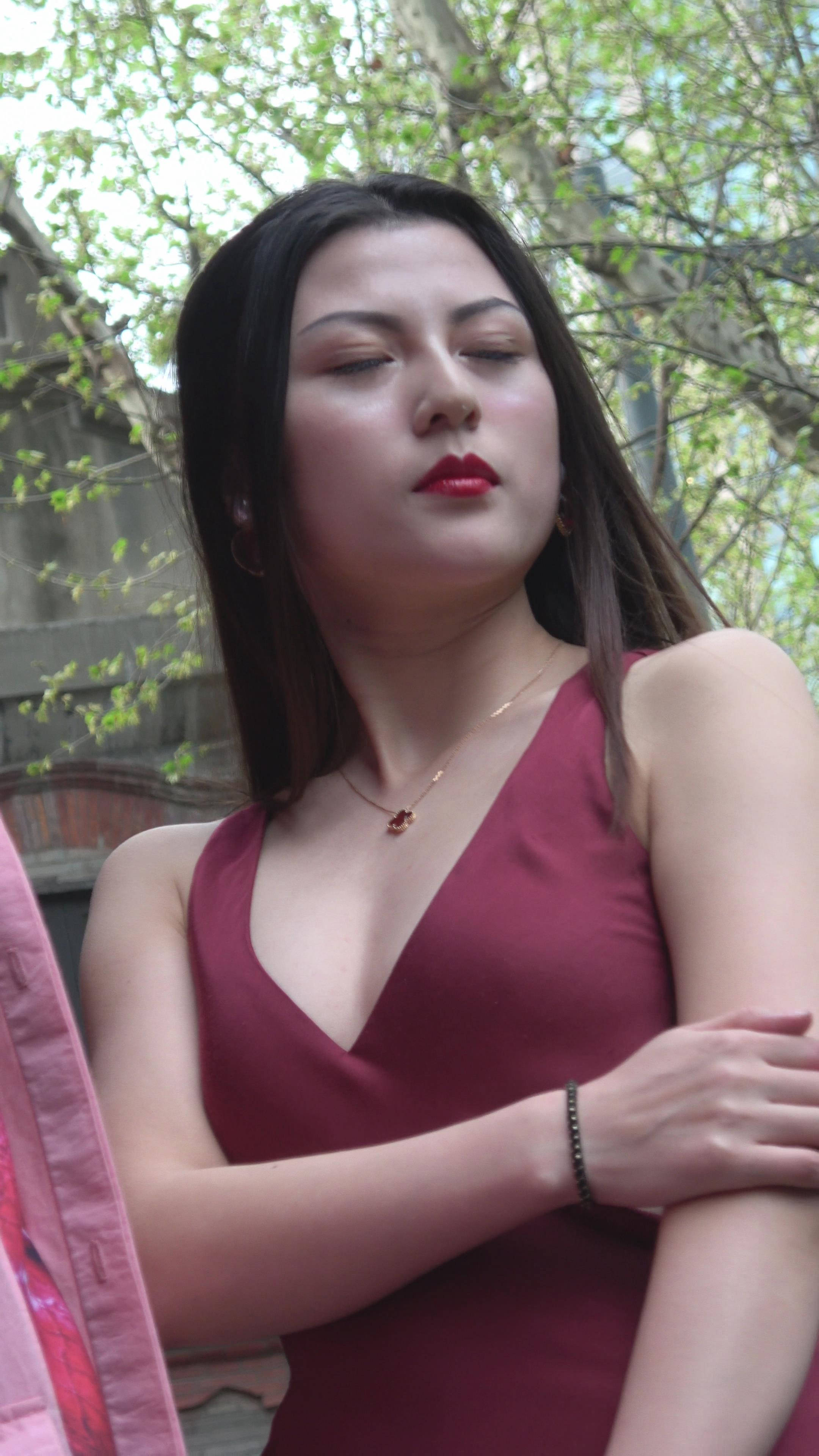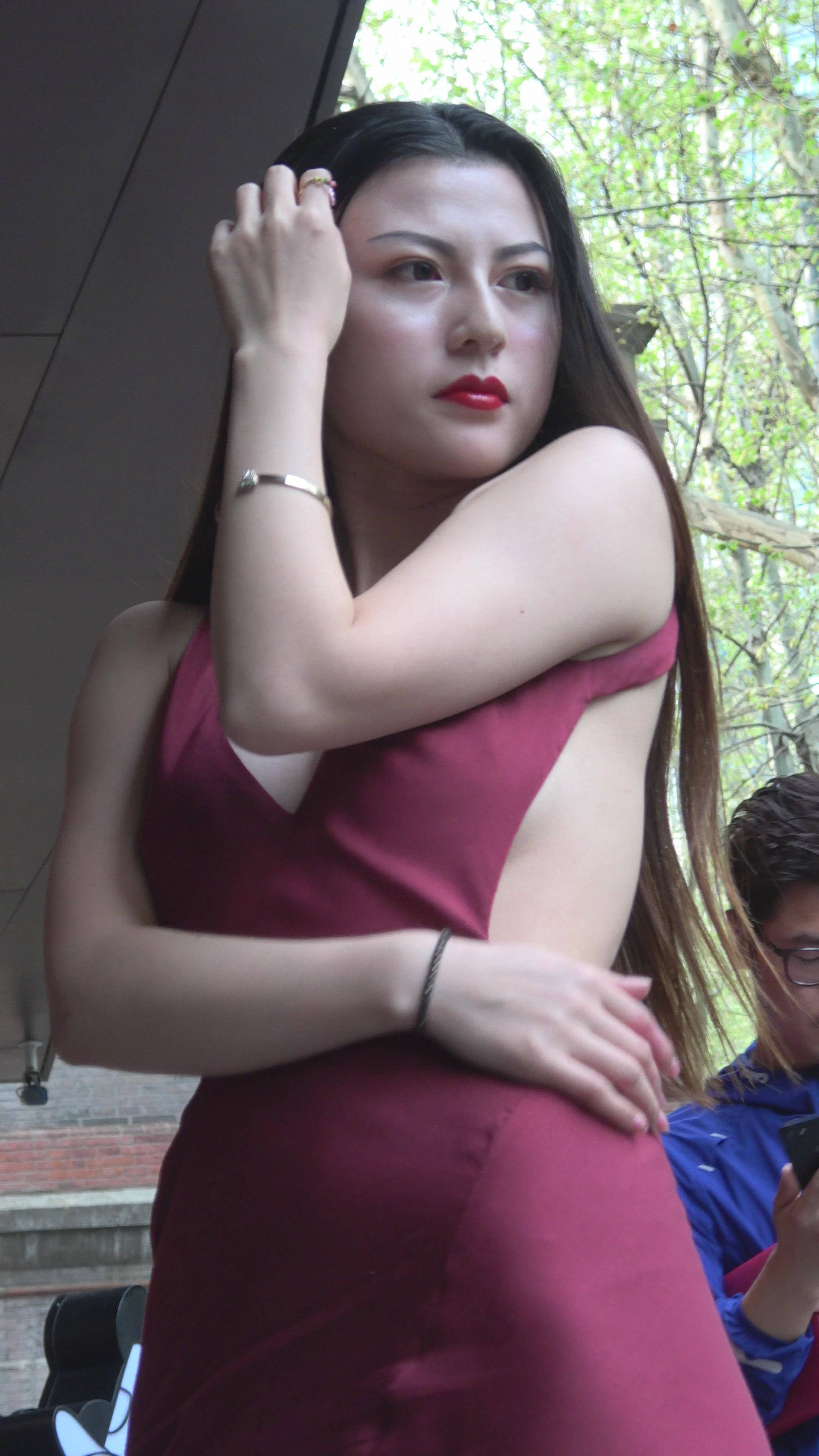 4K - 深V红裙街拍高跟性感美女摆拍 编号7759