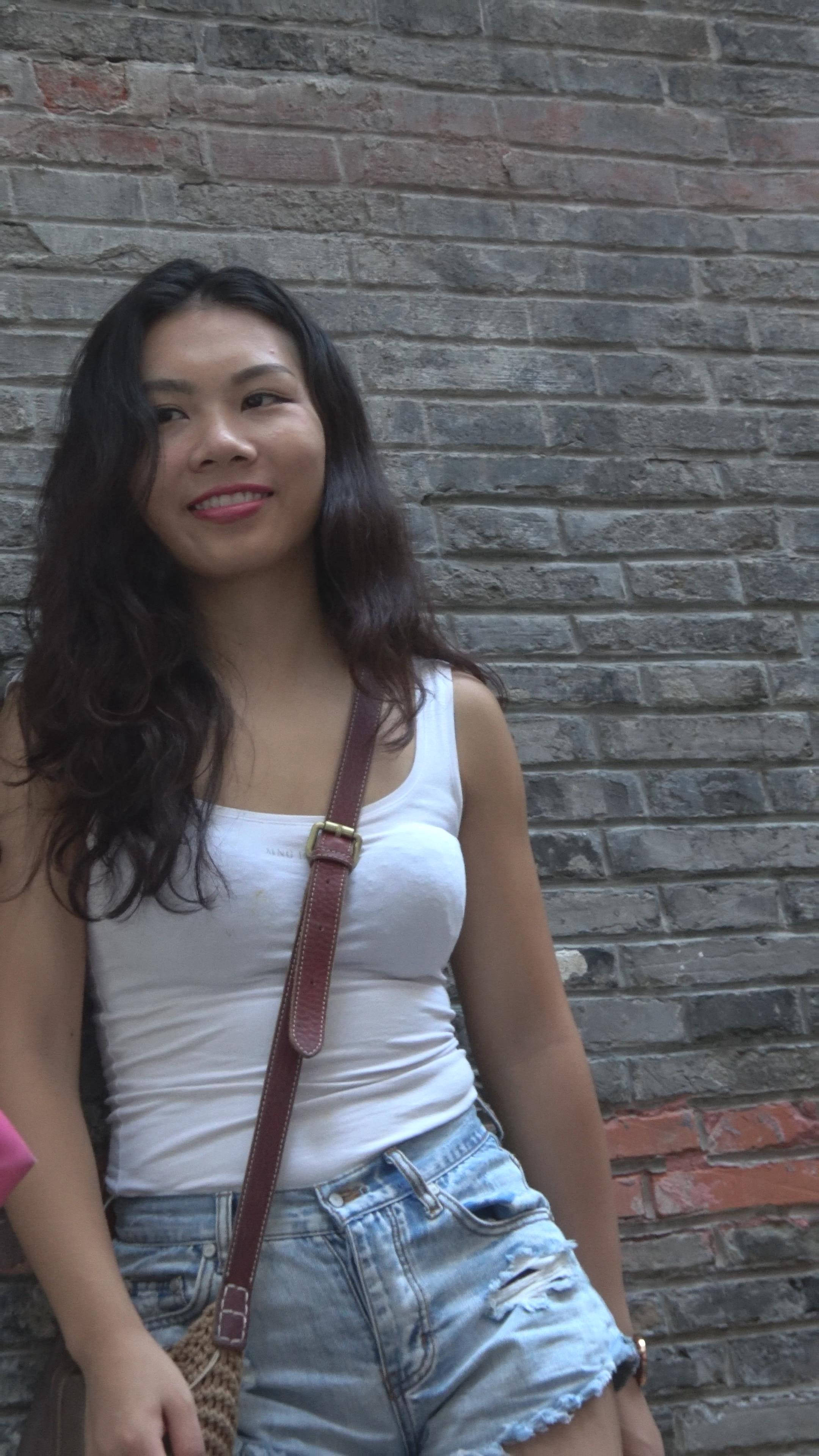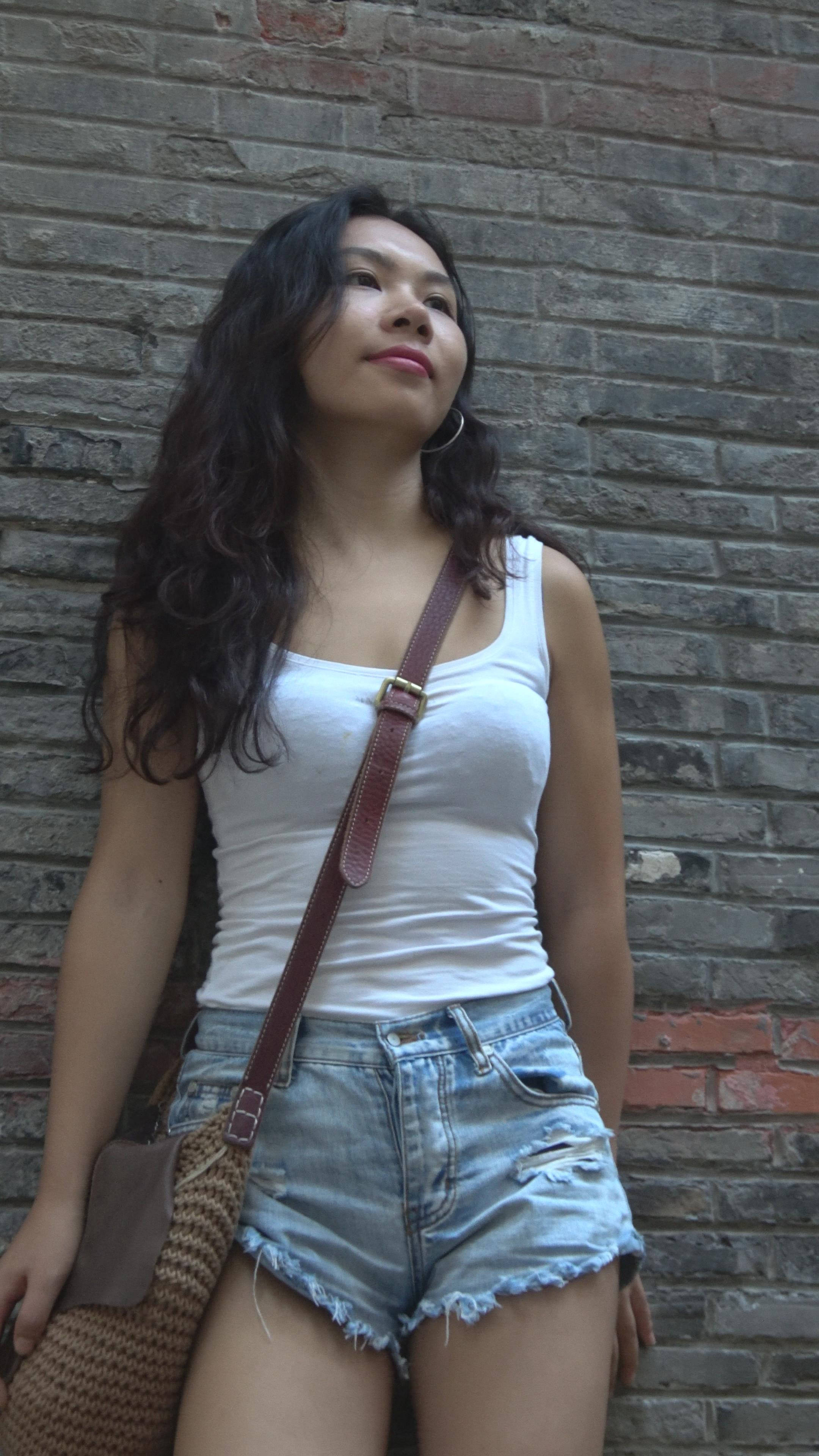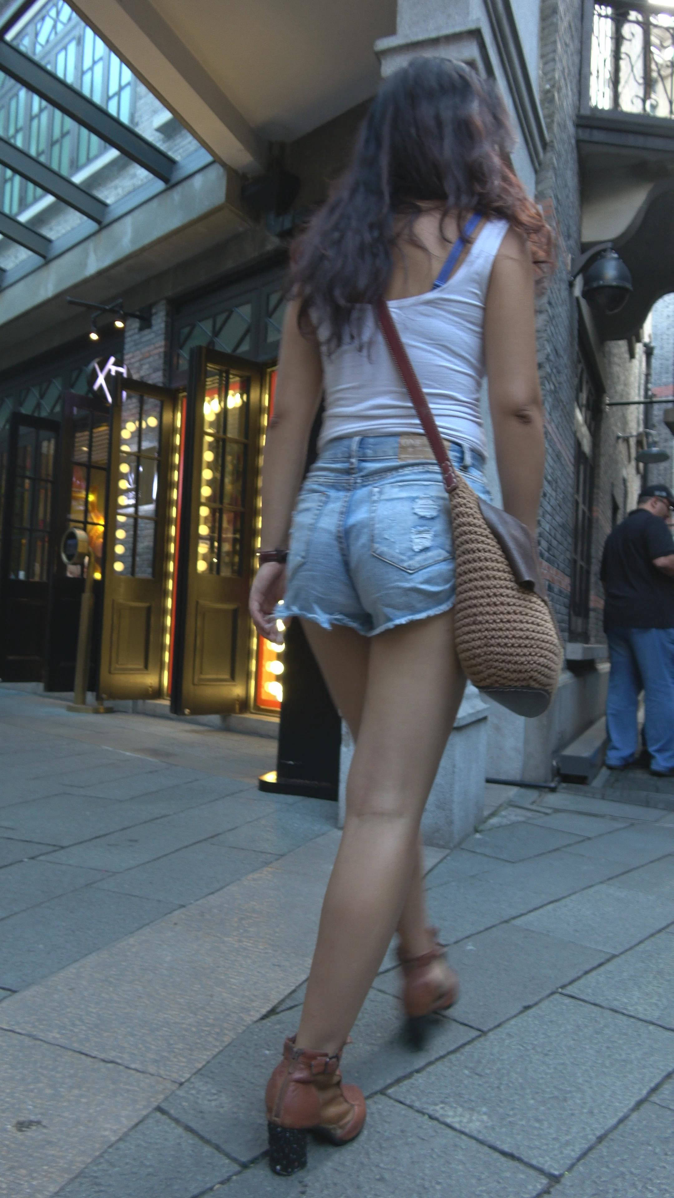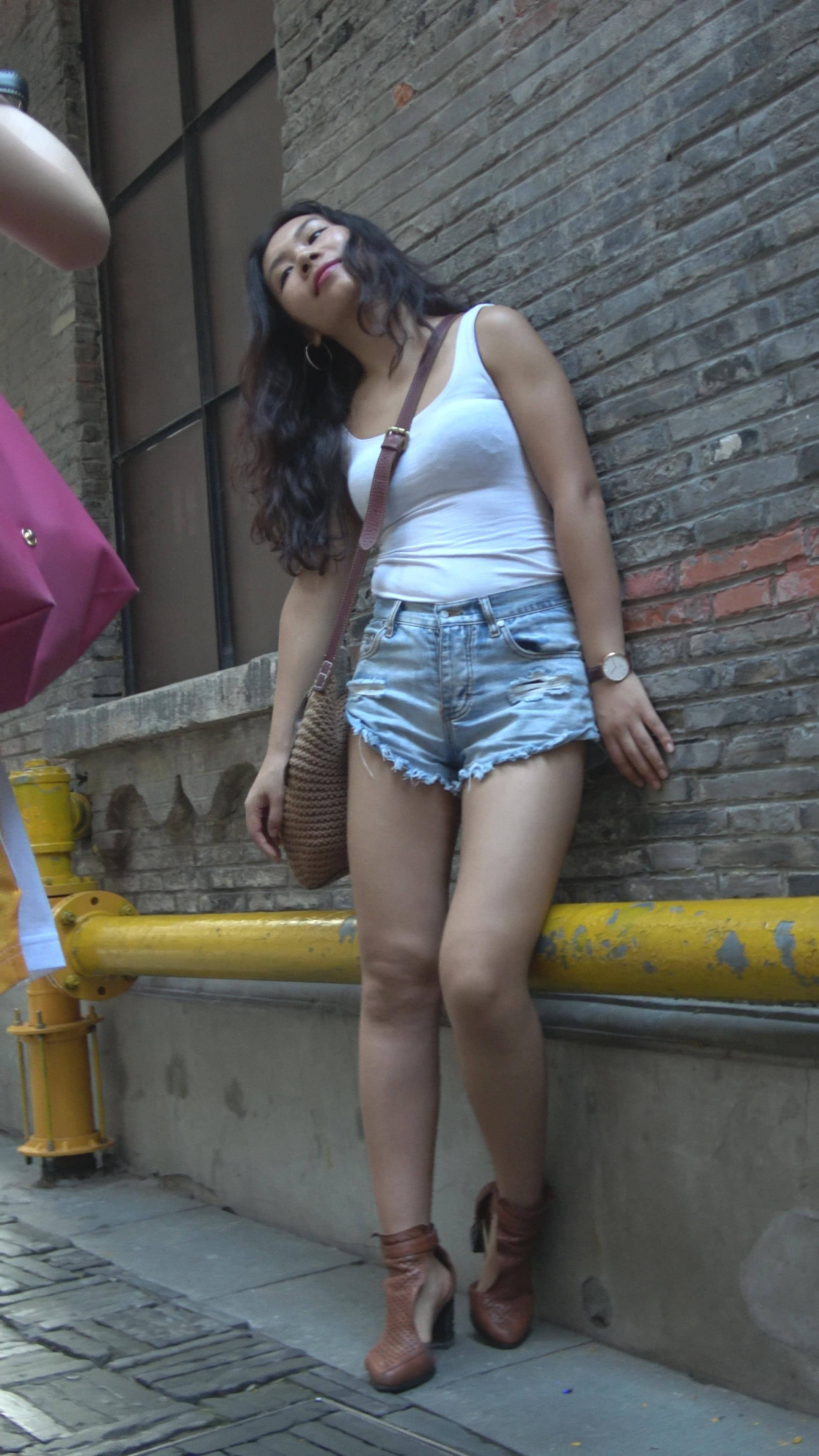 紧身背心高腰牛仔热裤街拍美女摆拍 编号7797