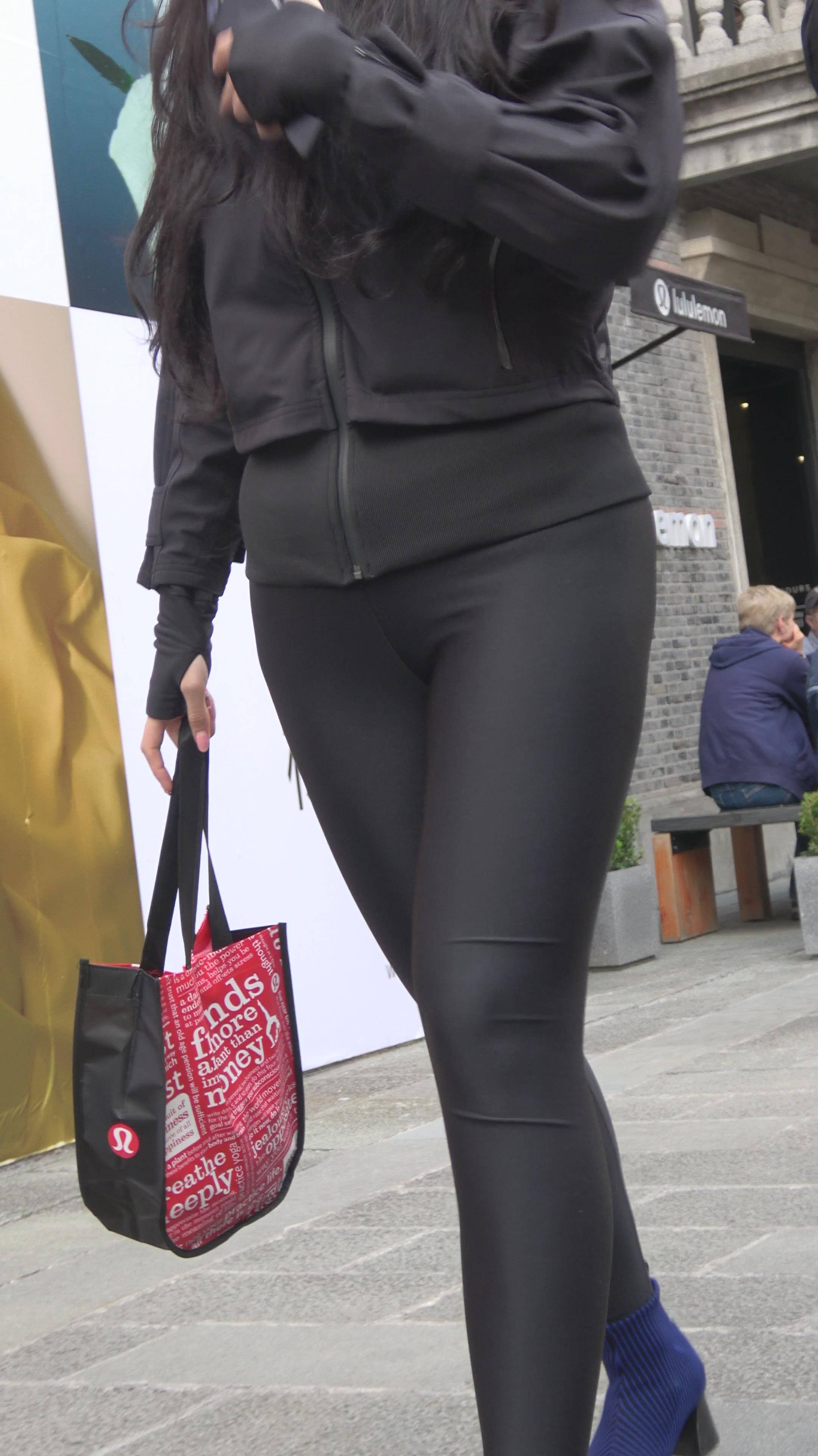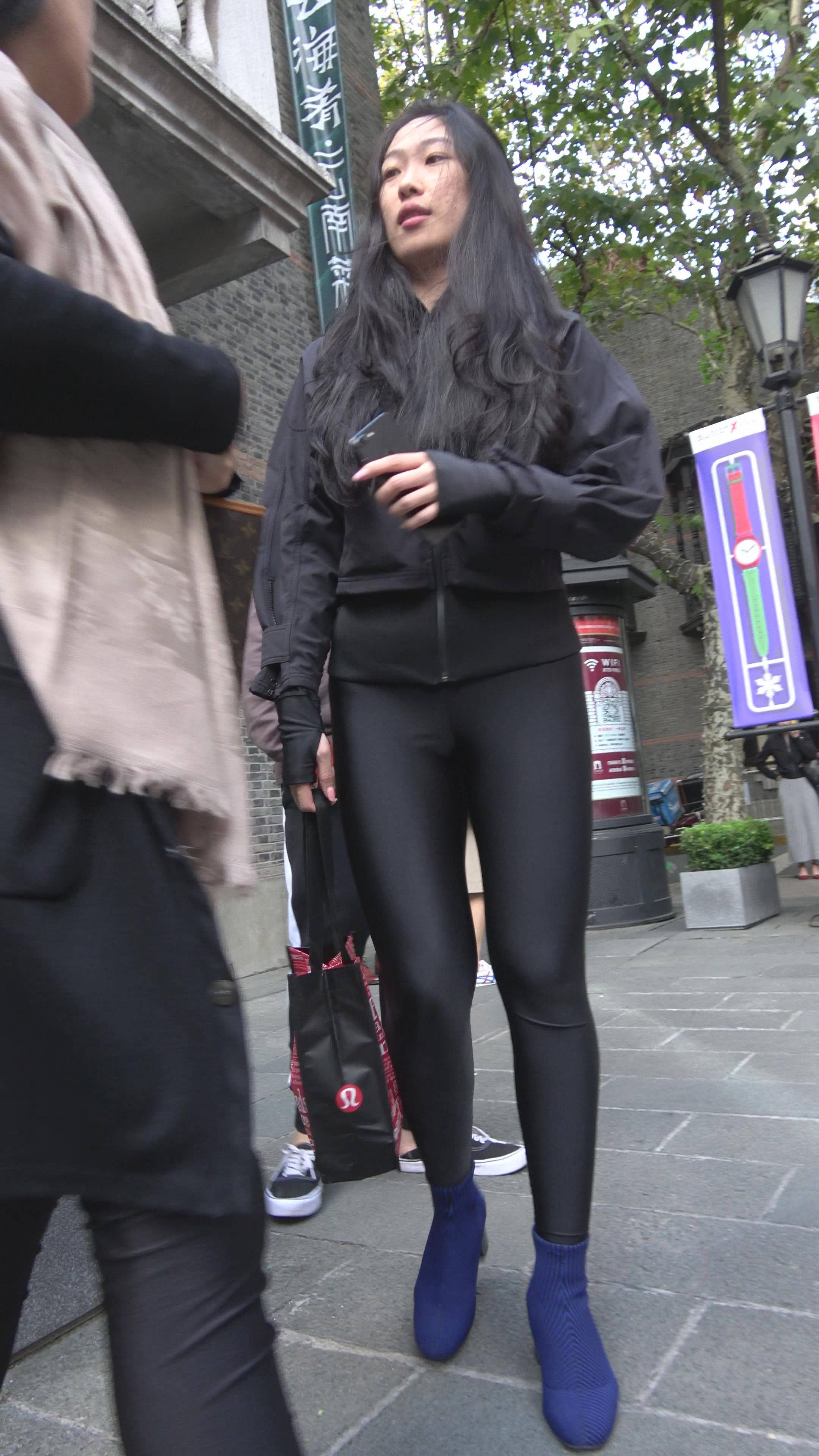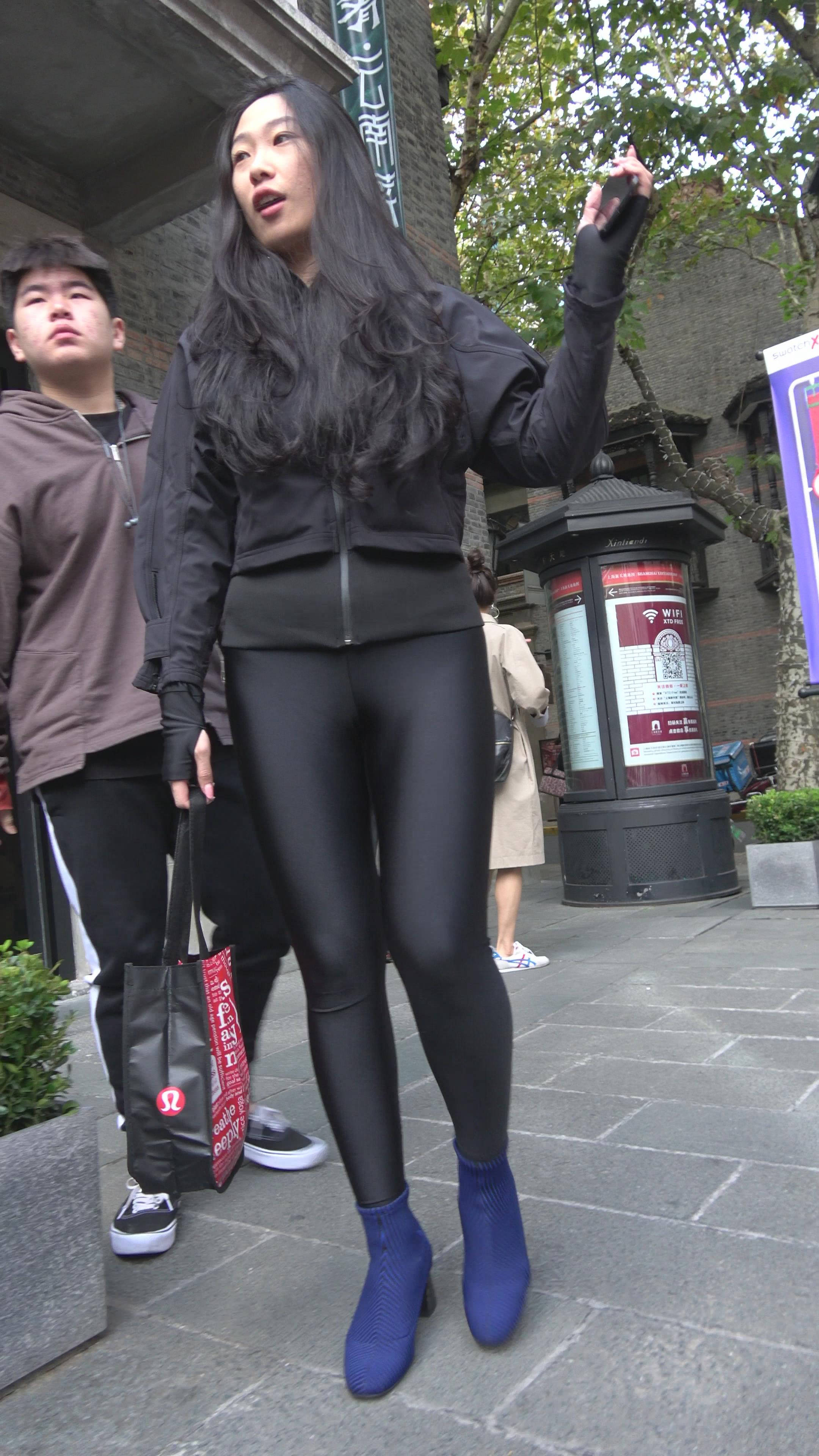 黑色系风格紧身裤蓝色高跟鞋街拍美女 编号7800