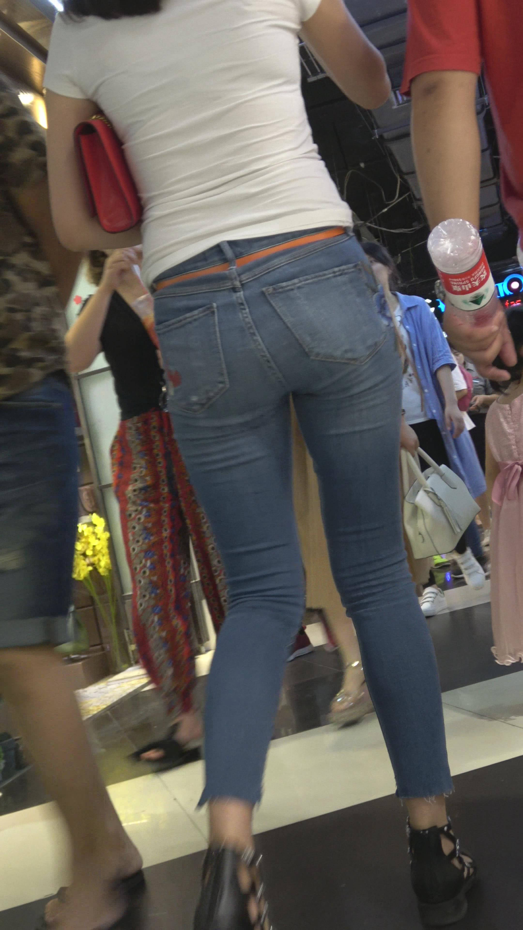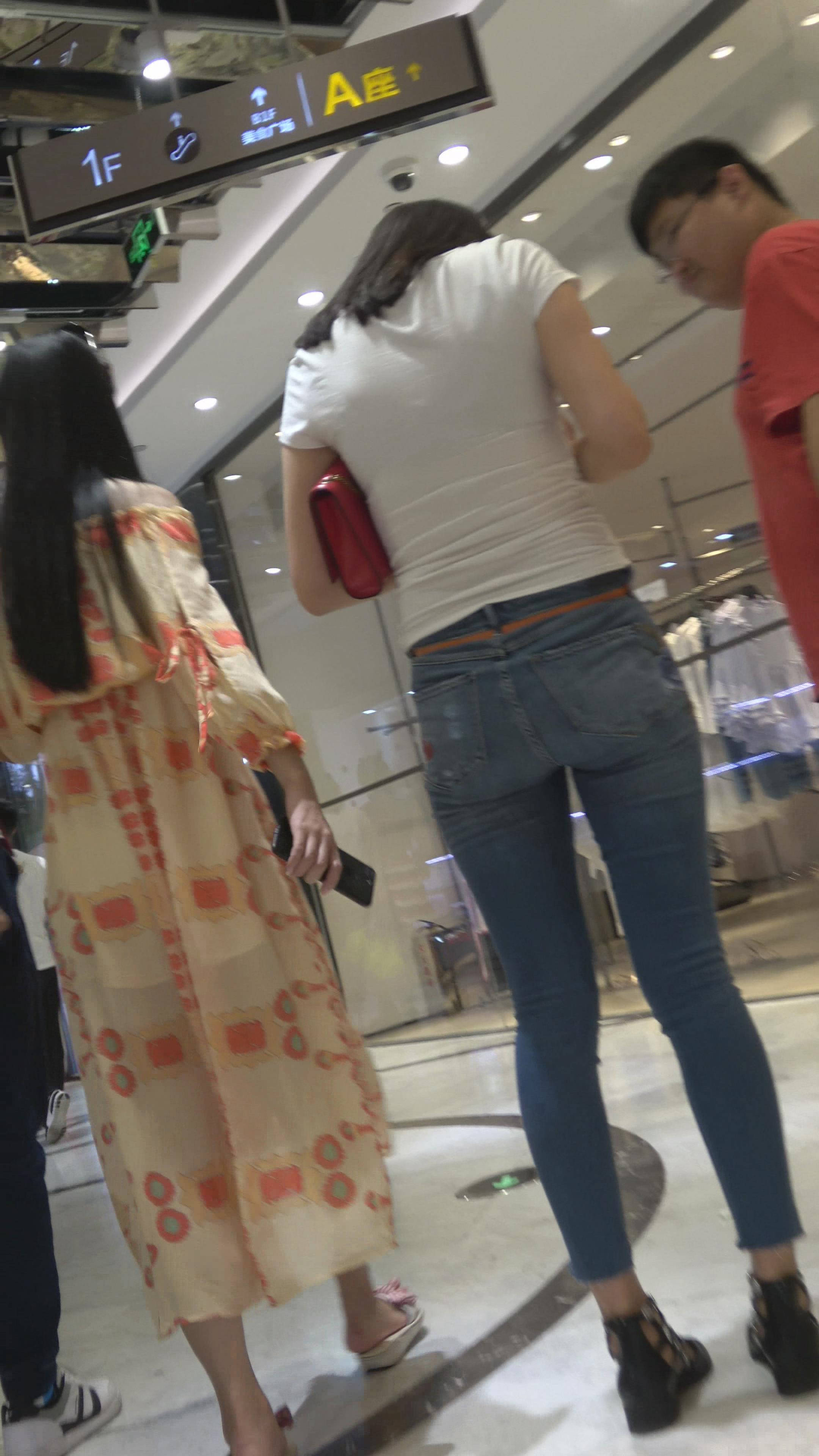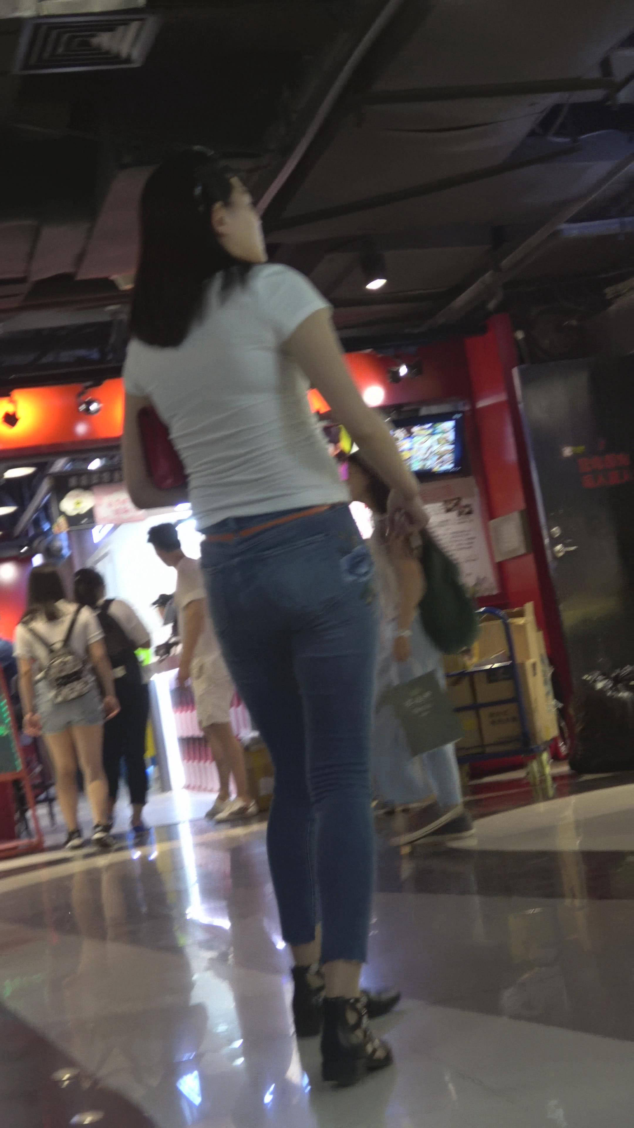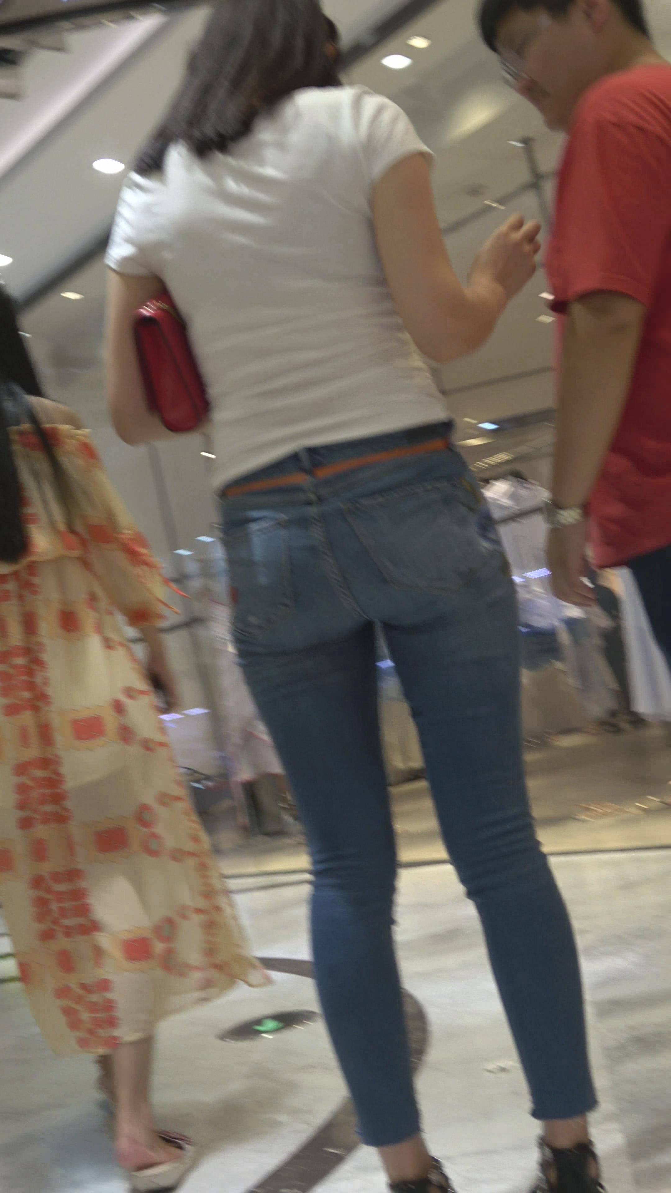 4K - 白色T恤牛仔裤街拍紧身美女 编号7824