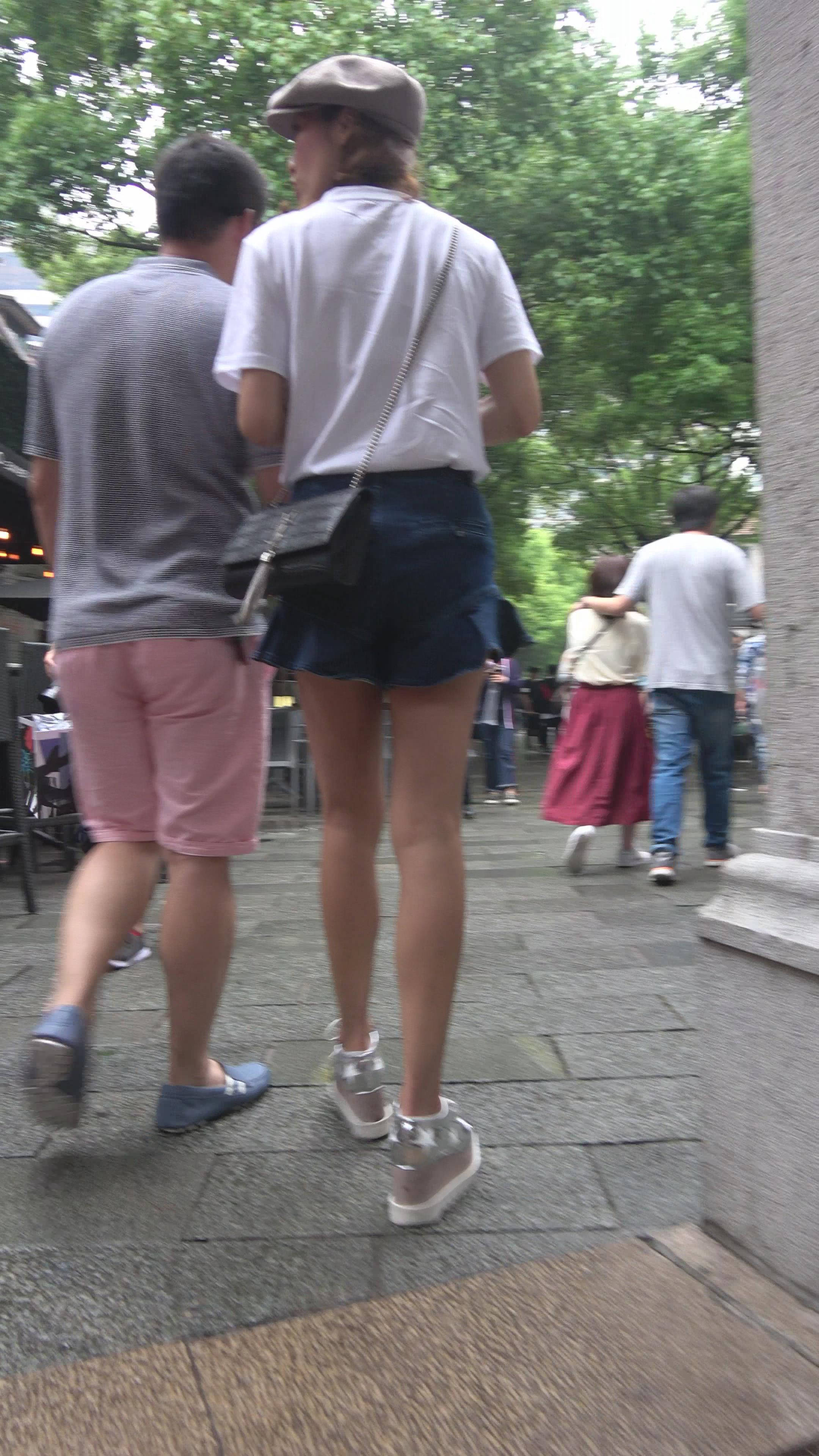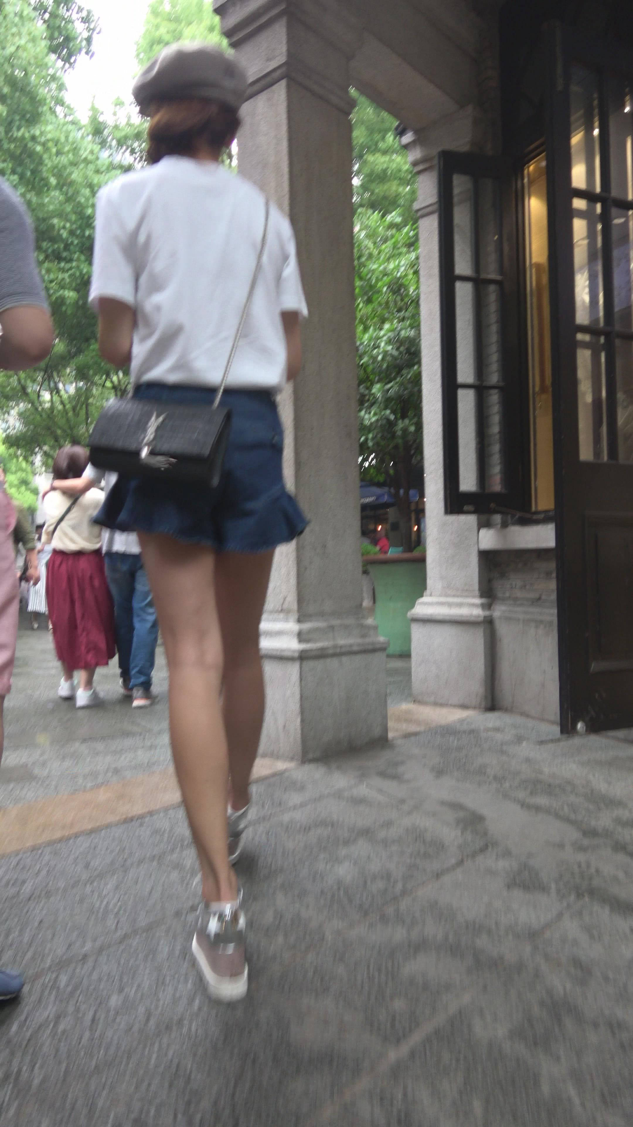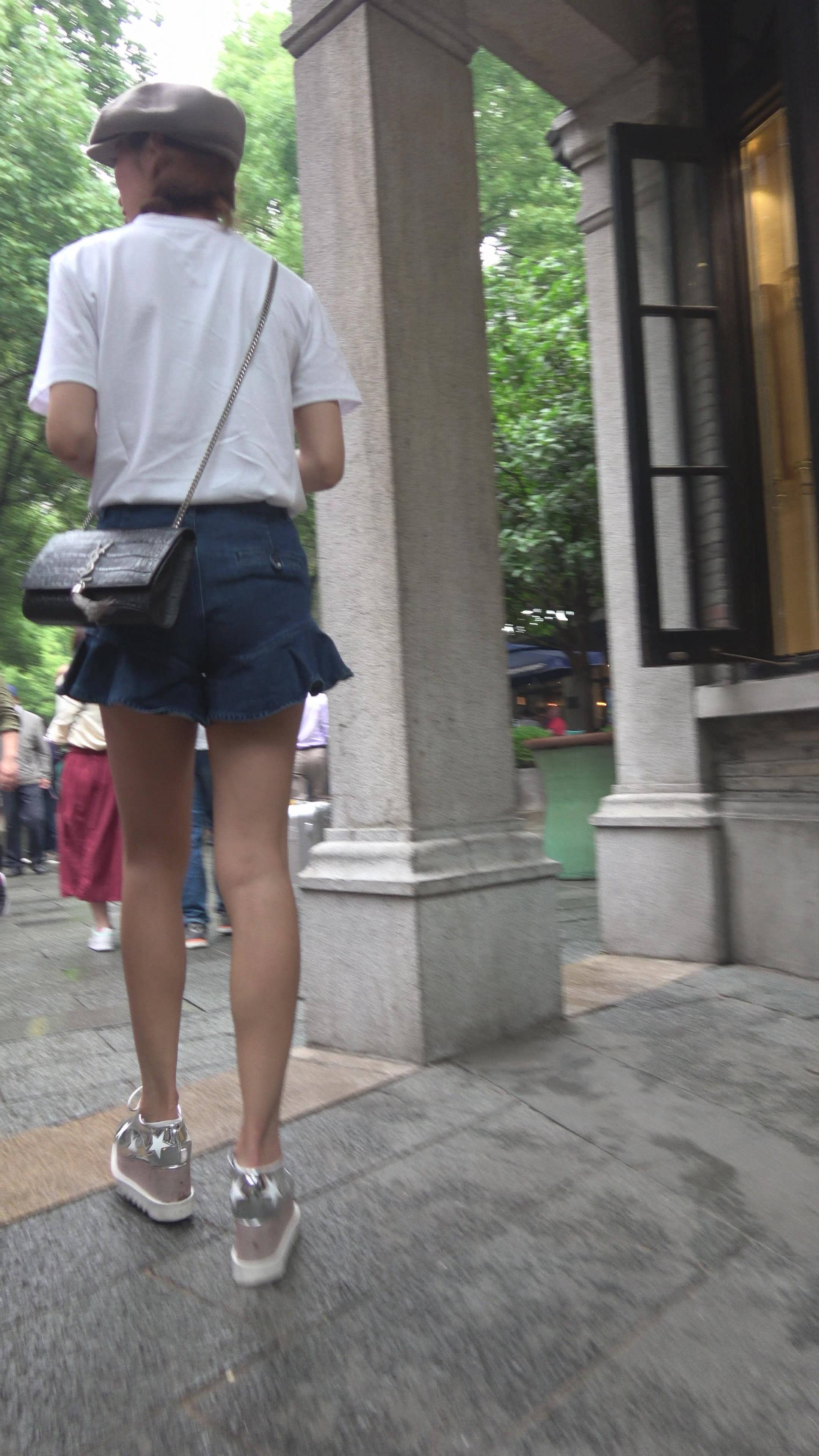 4K 街拍身材苗条的白T恤牛仔短裙美女 编号7875