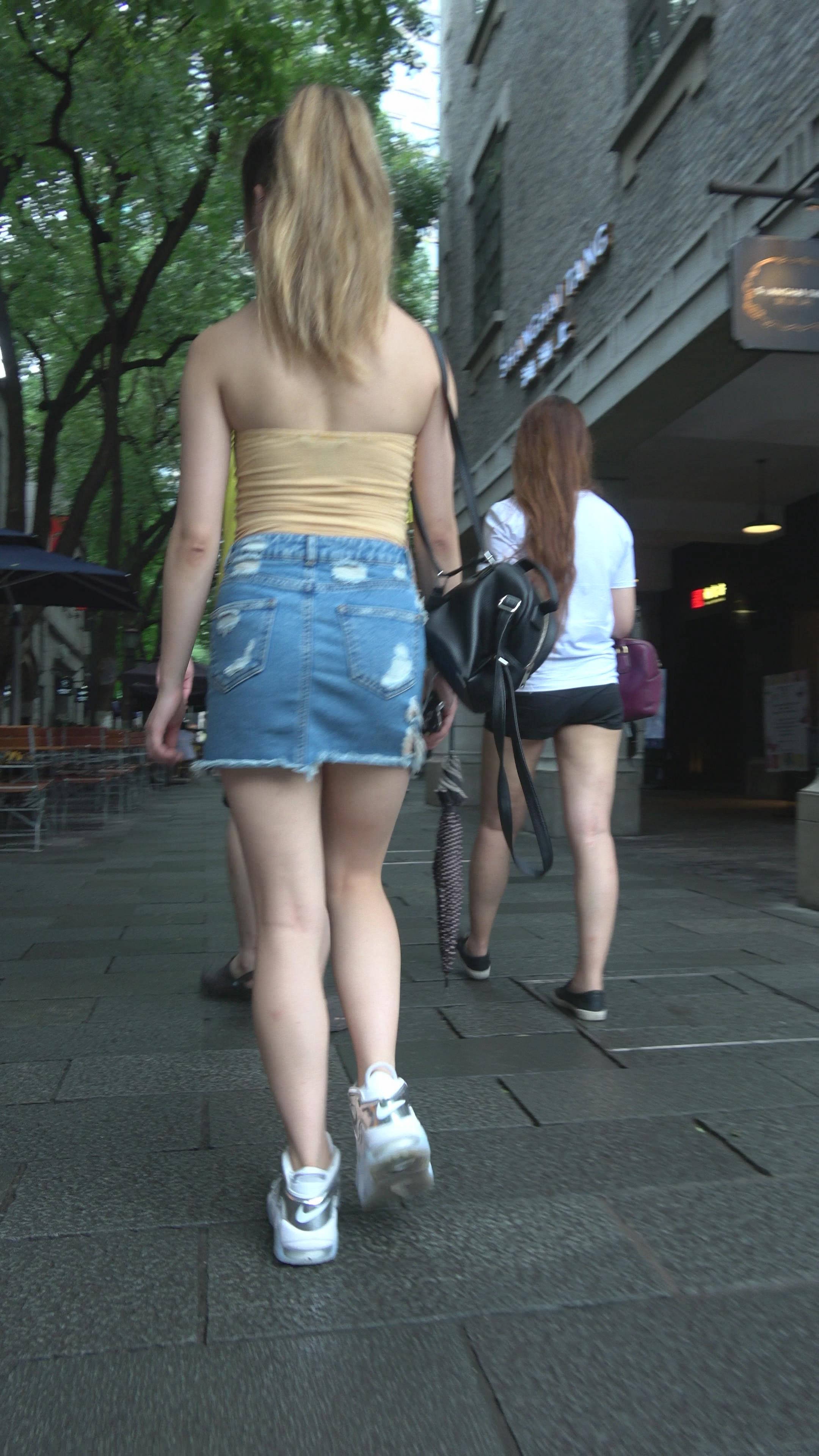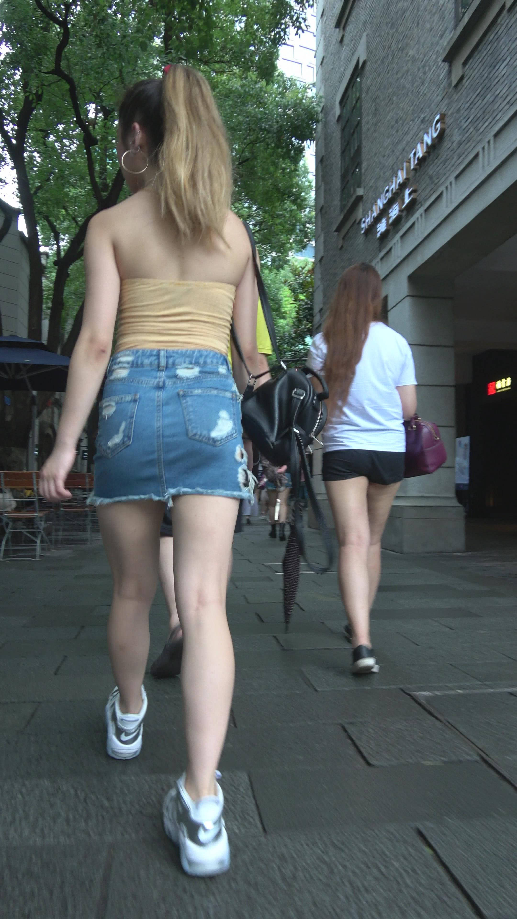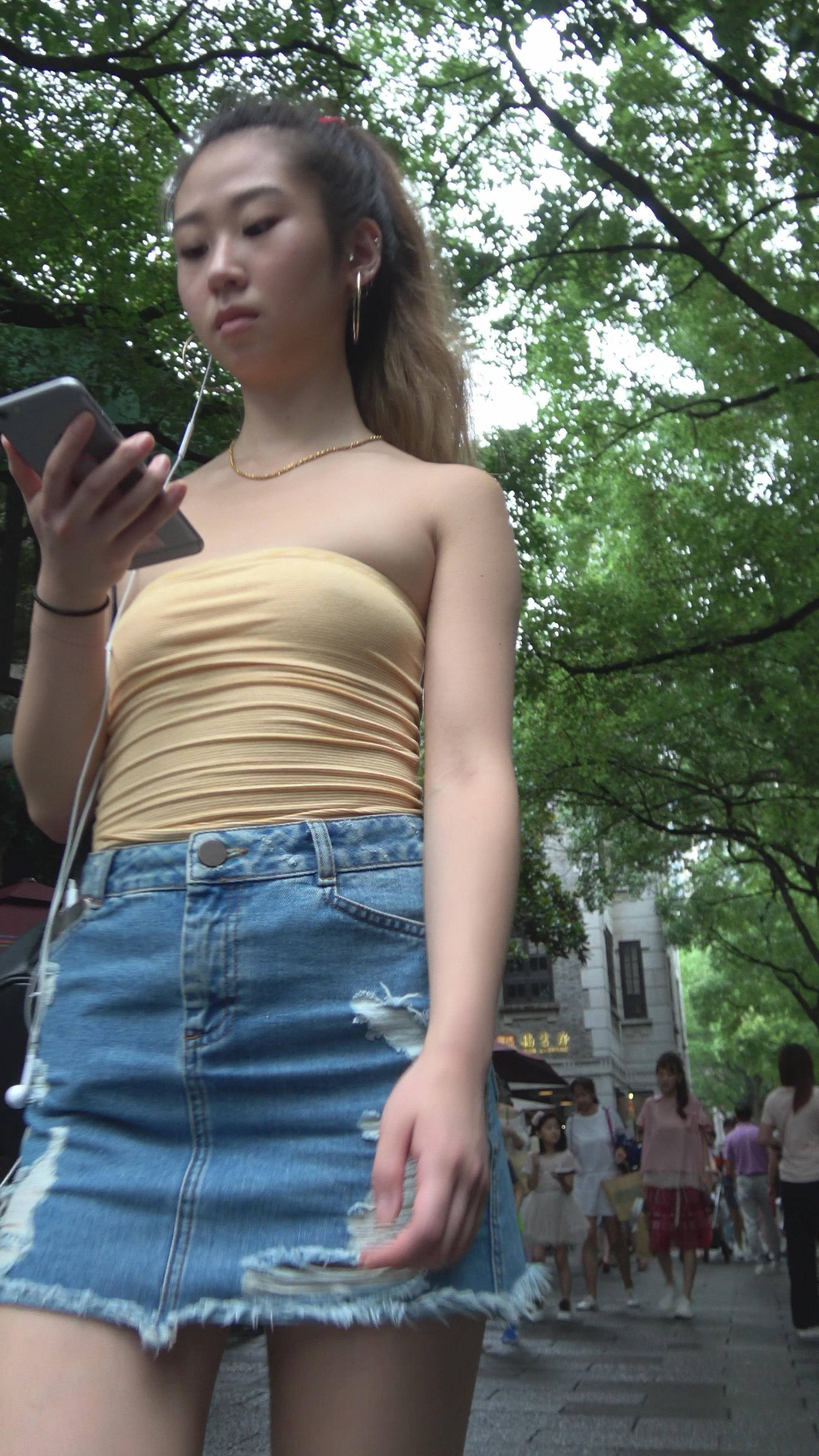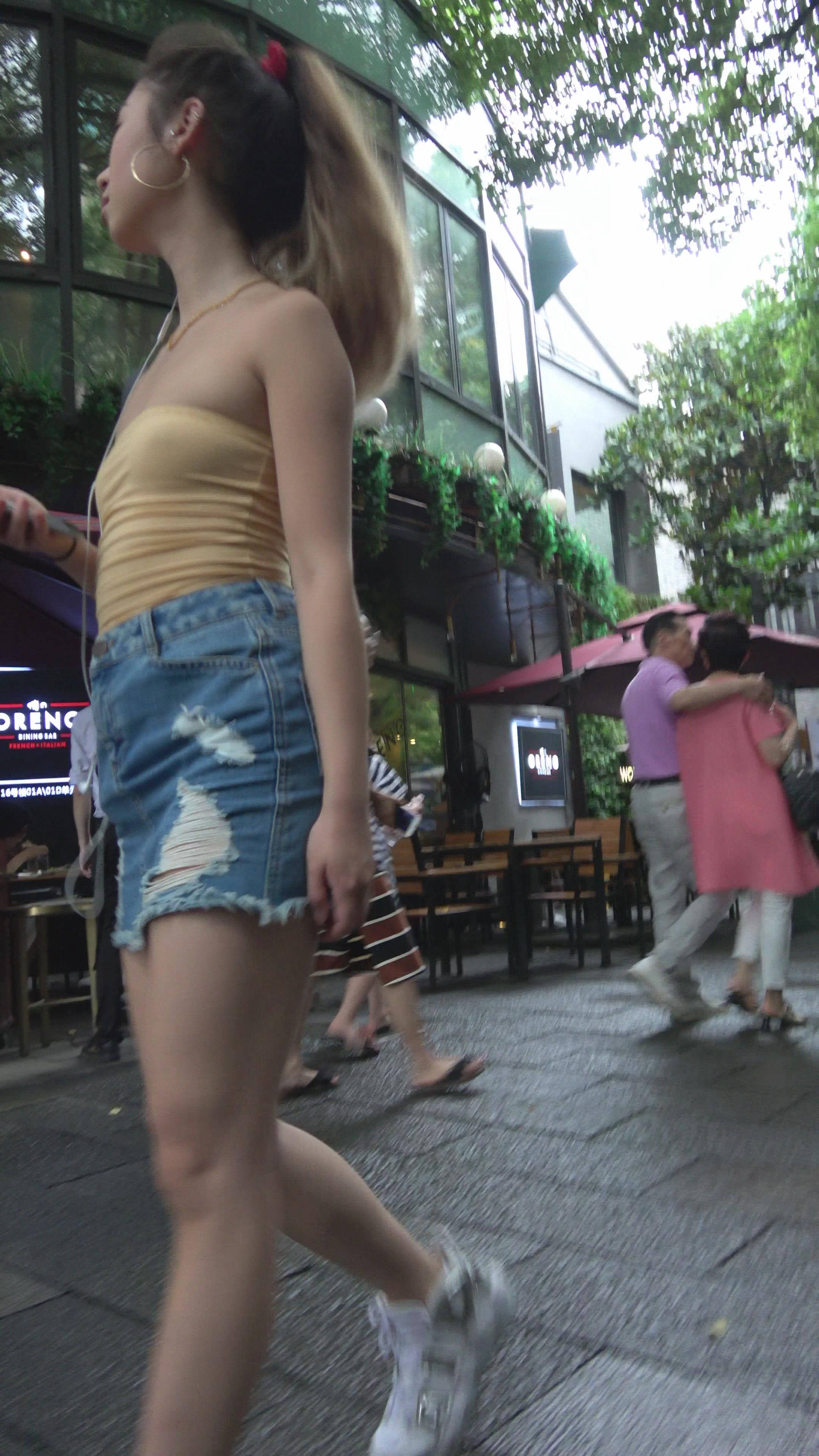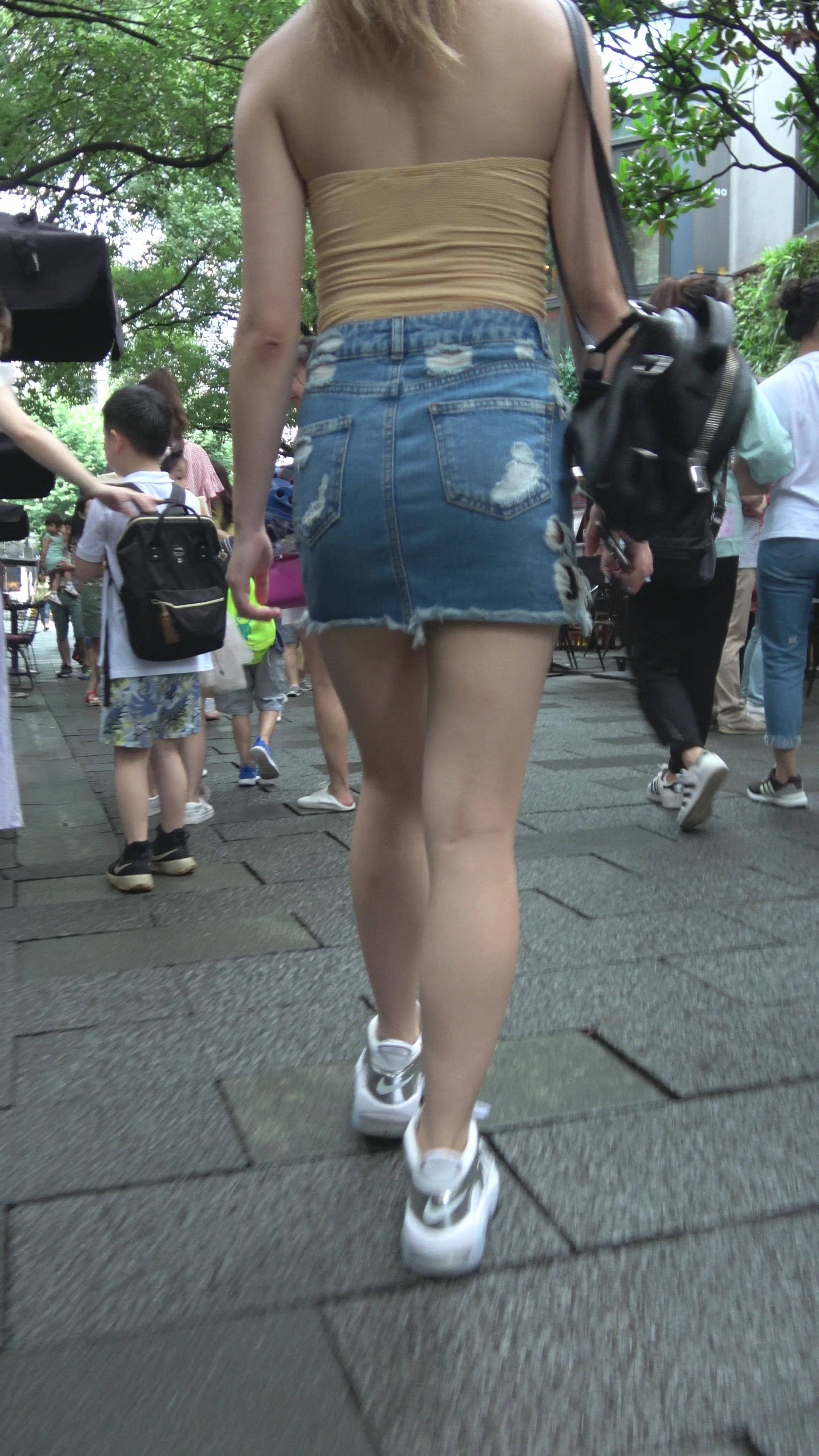 4K 黄色小抹胸牛仔裙街拍美腿美女 编号7899
