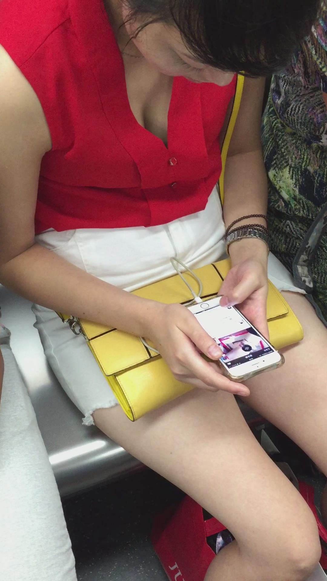 地铁上事业线很深的红衣女孩,很丰满 编号5186