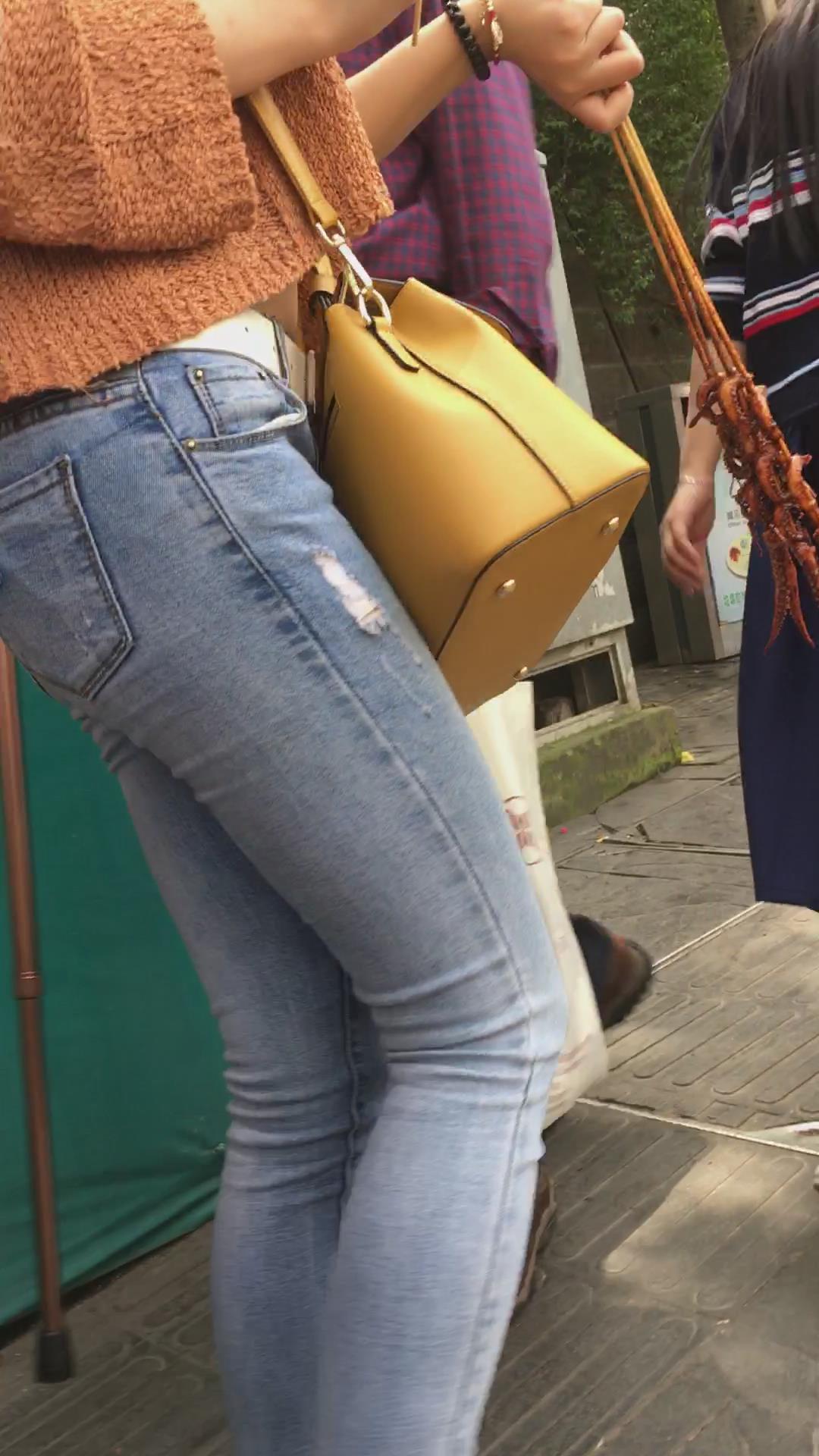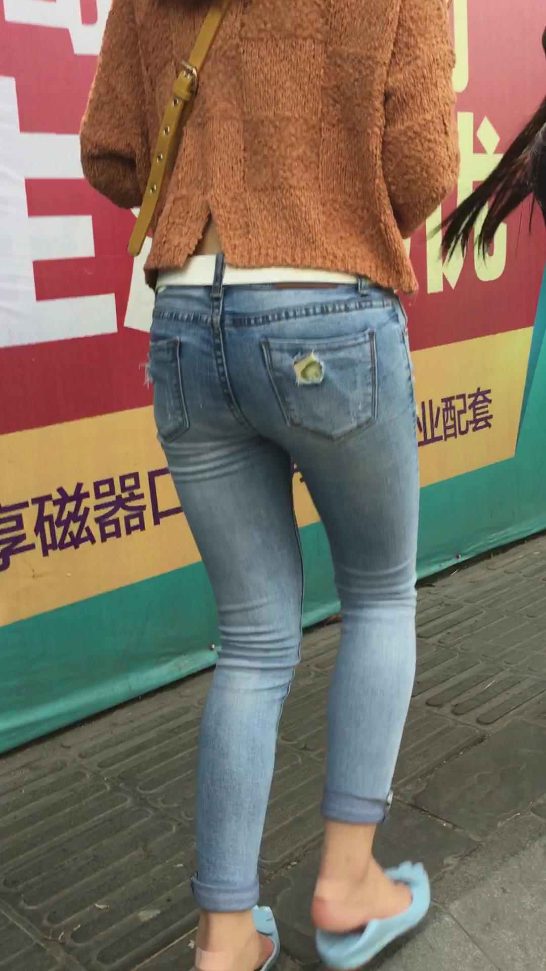 街拍蓝色紧身牛仔裤小美女 编号5233