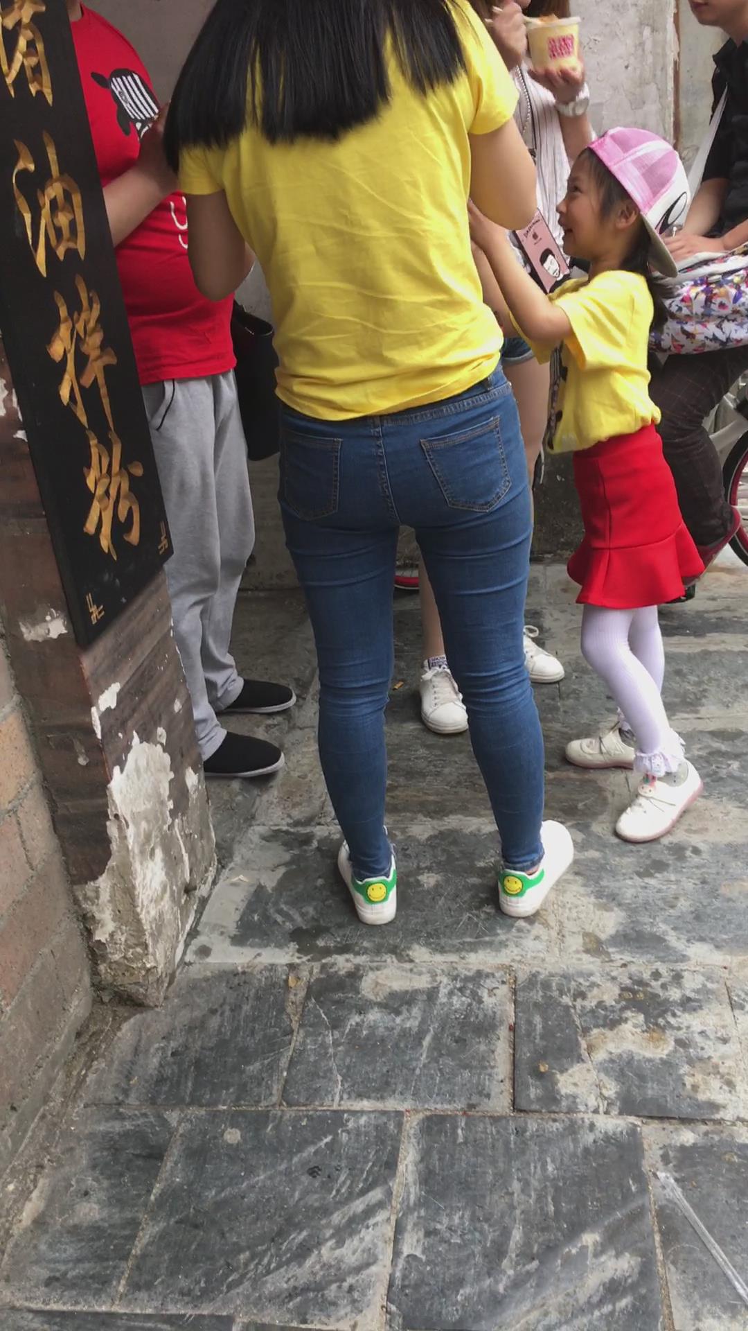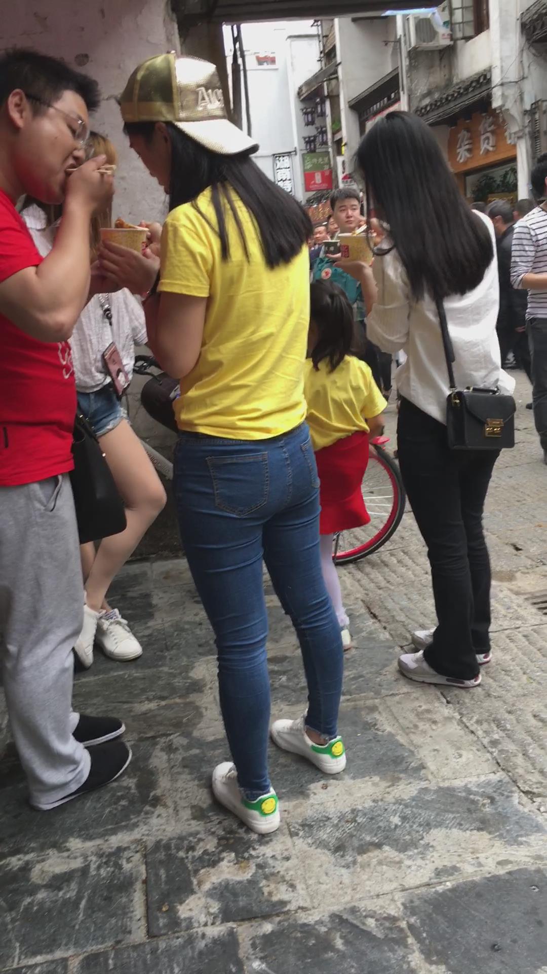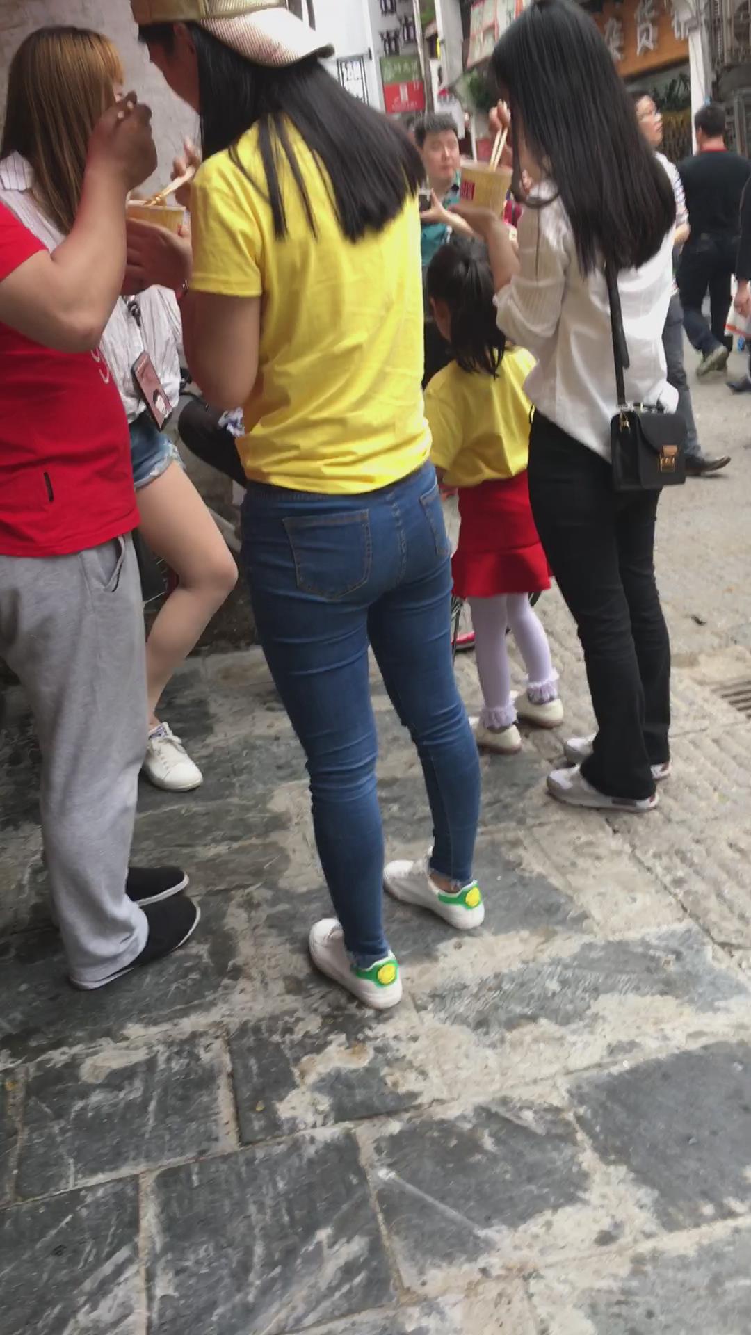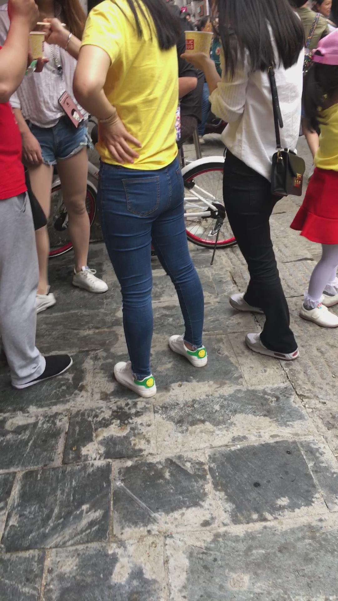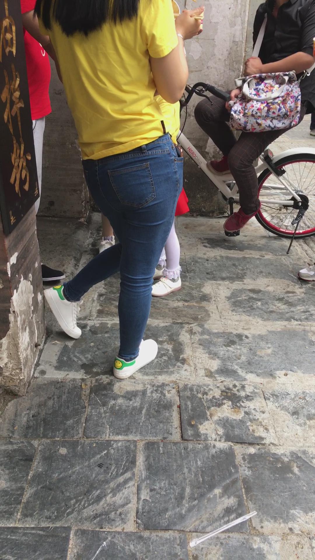 街拍黄T恤紧身牛仔裤美女 编号5272