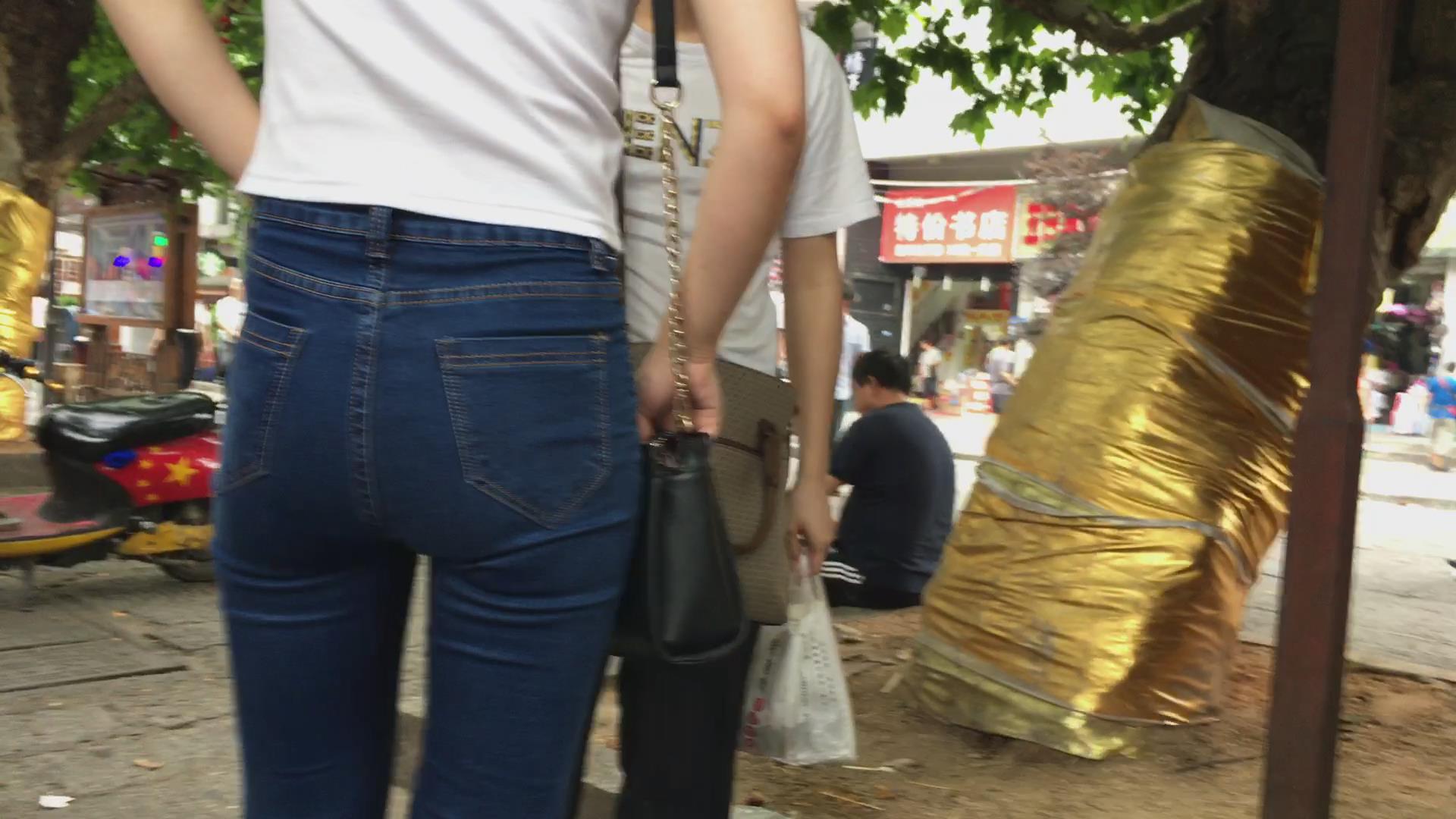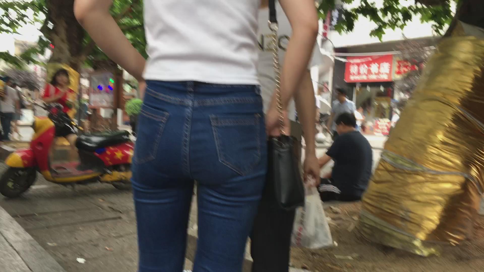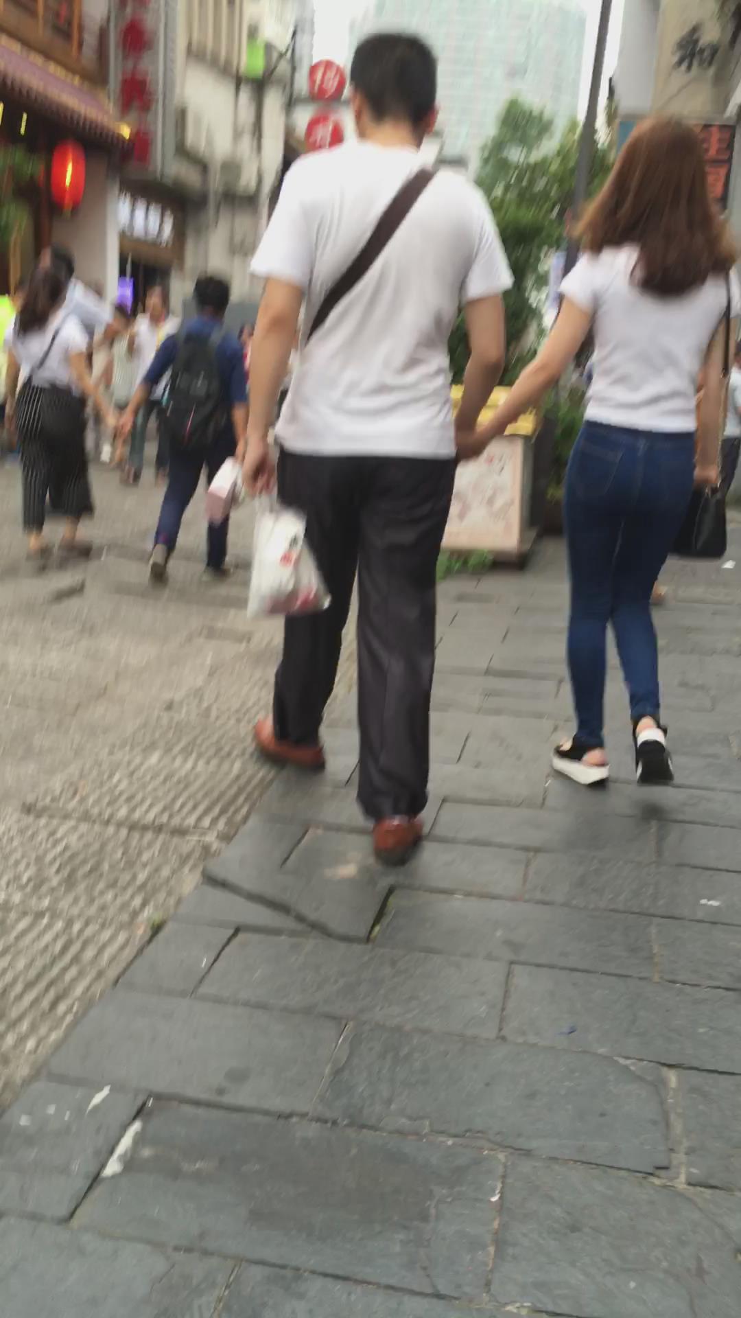 蓝色紧身牛仔裤小美女跟男友逛街 编号6117