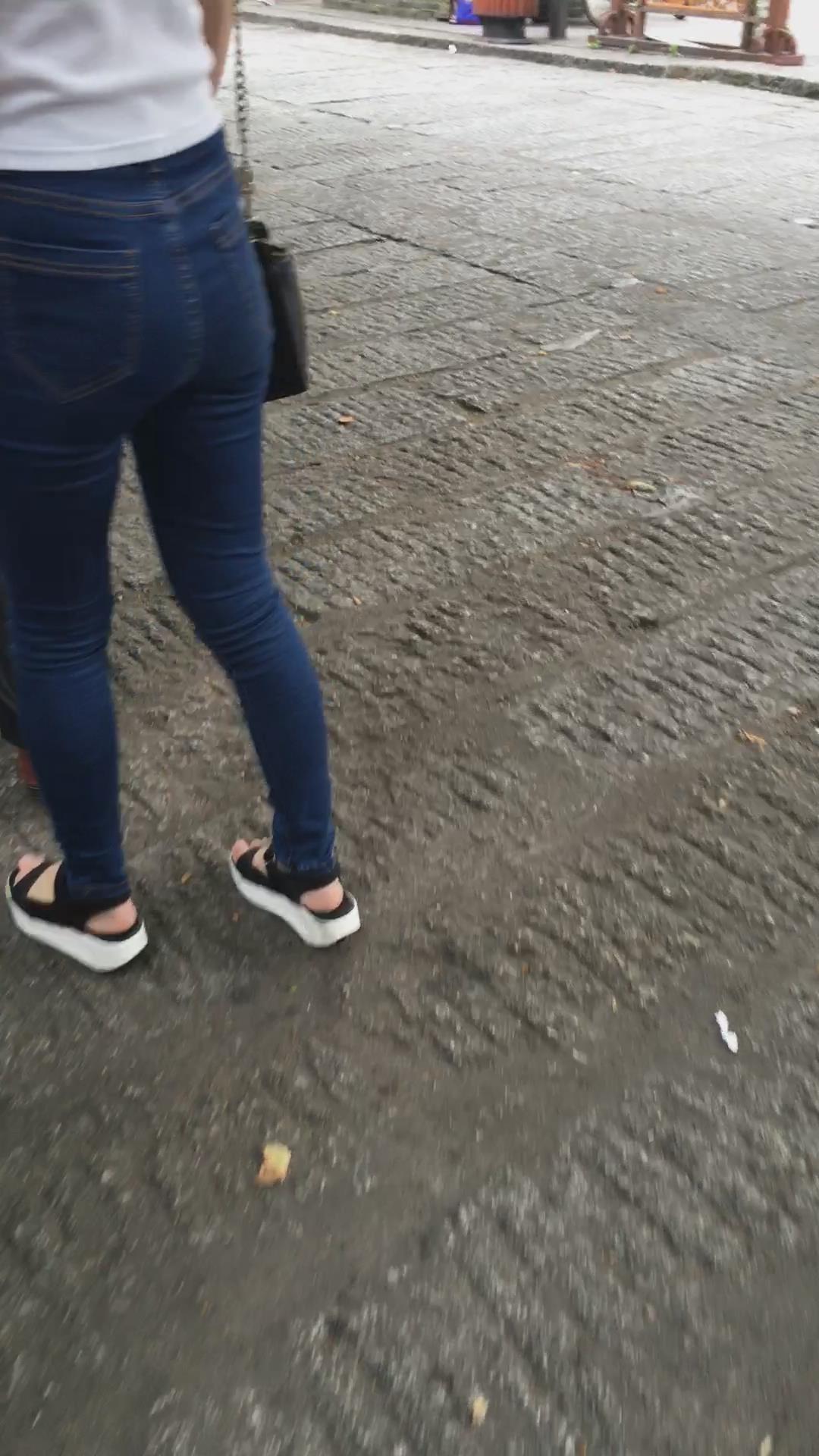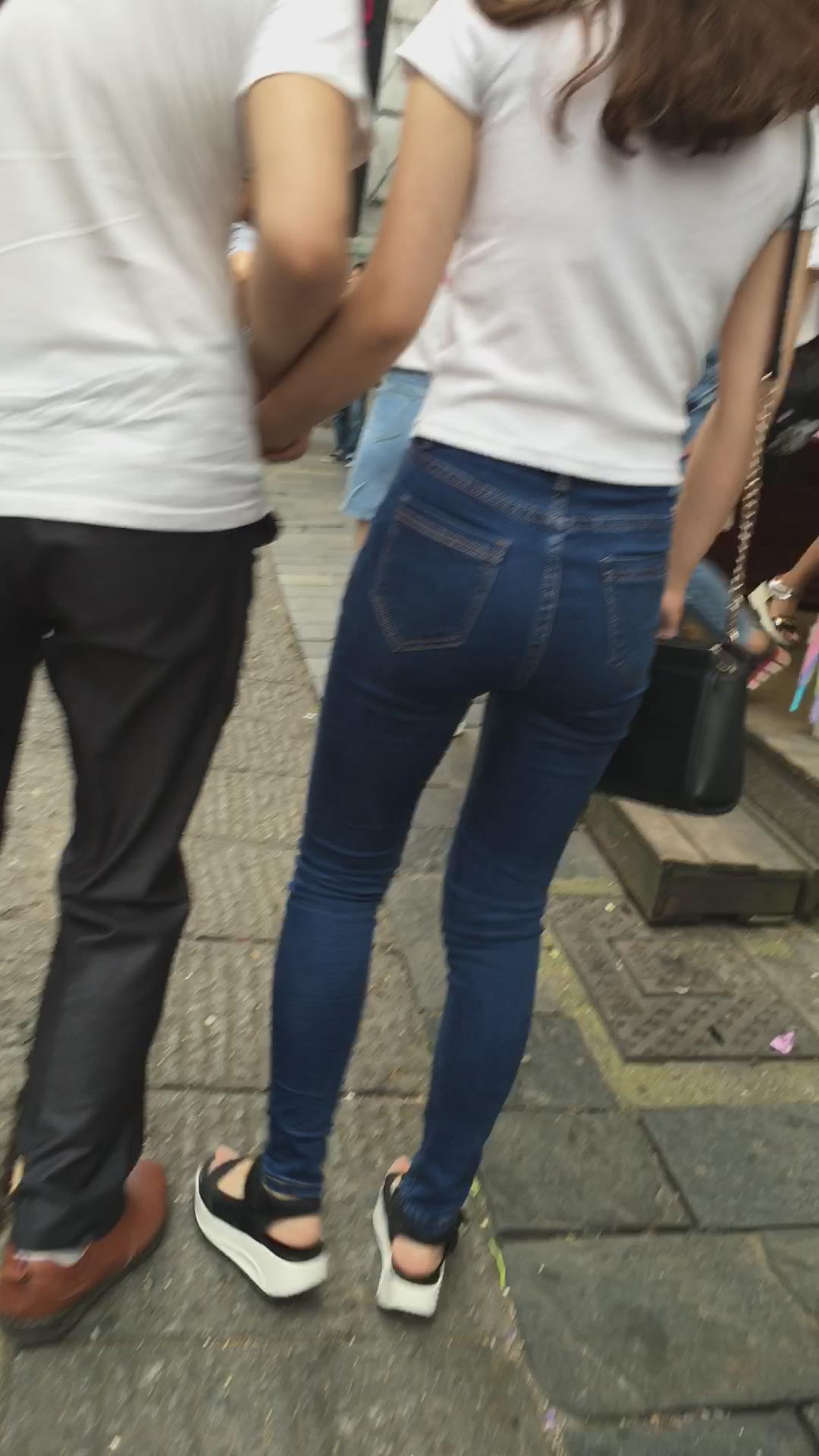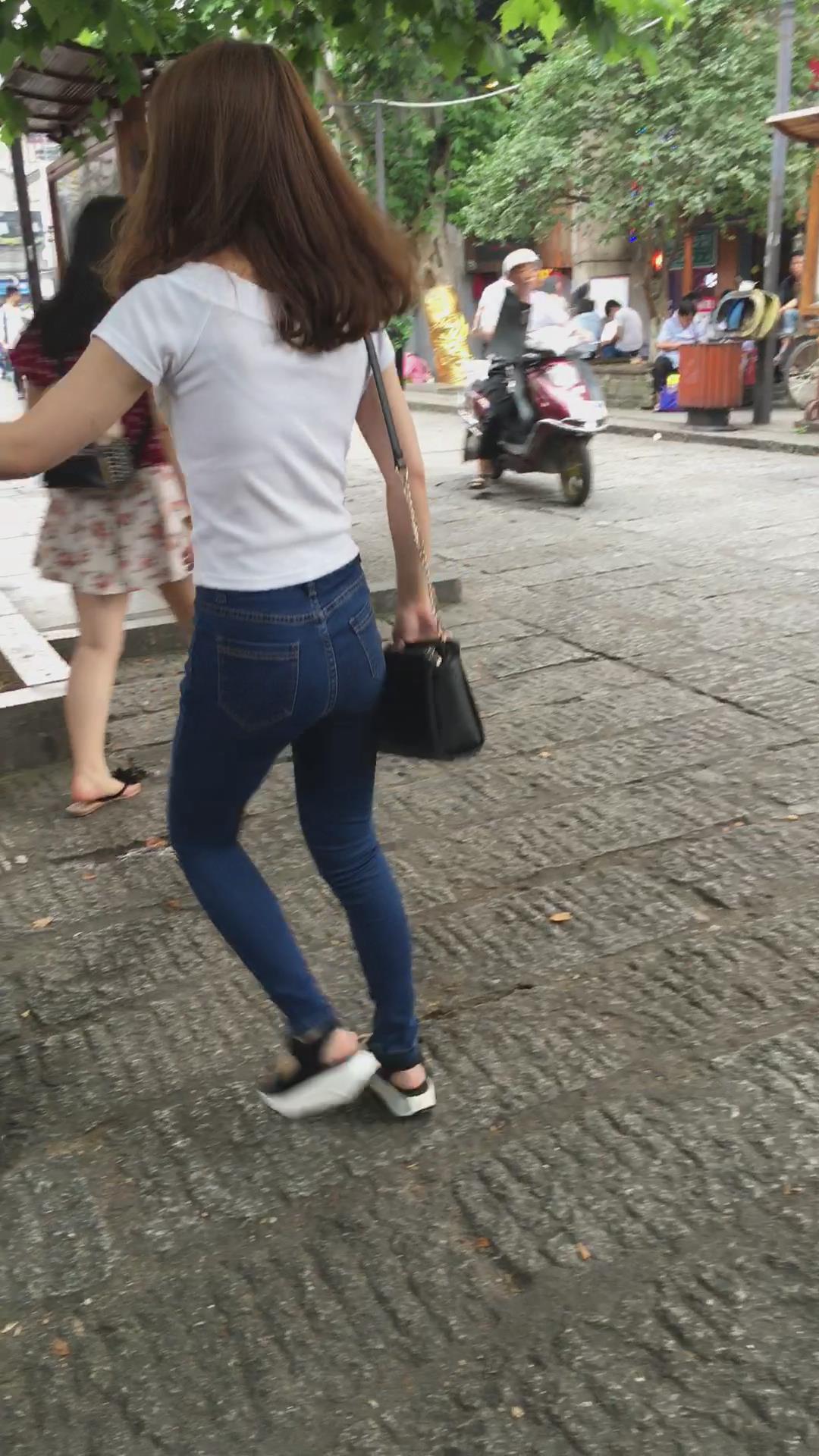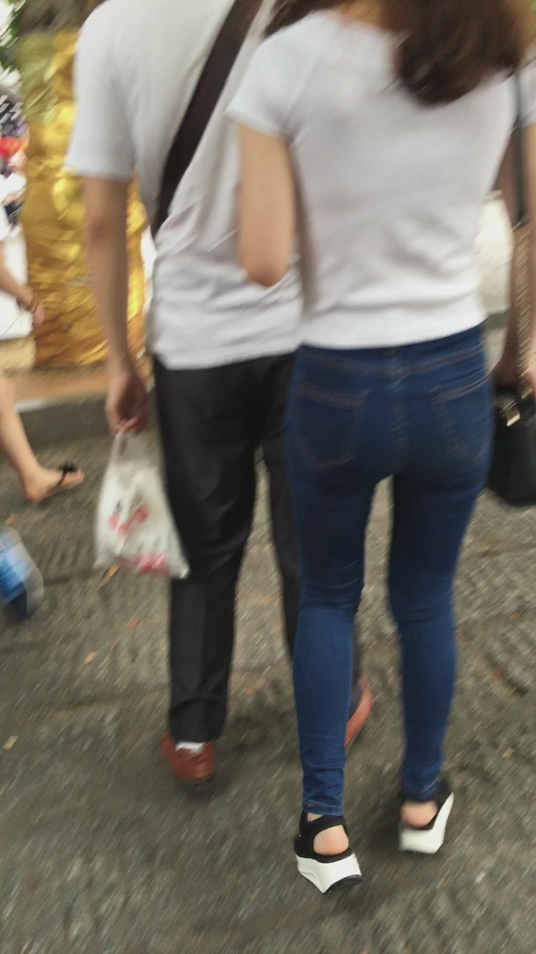 蓝色紧身牛仔裤小美女跟男友逛街 编号6117