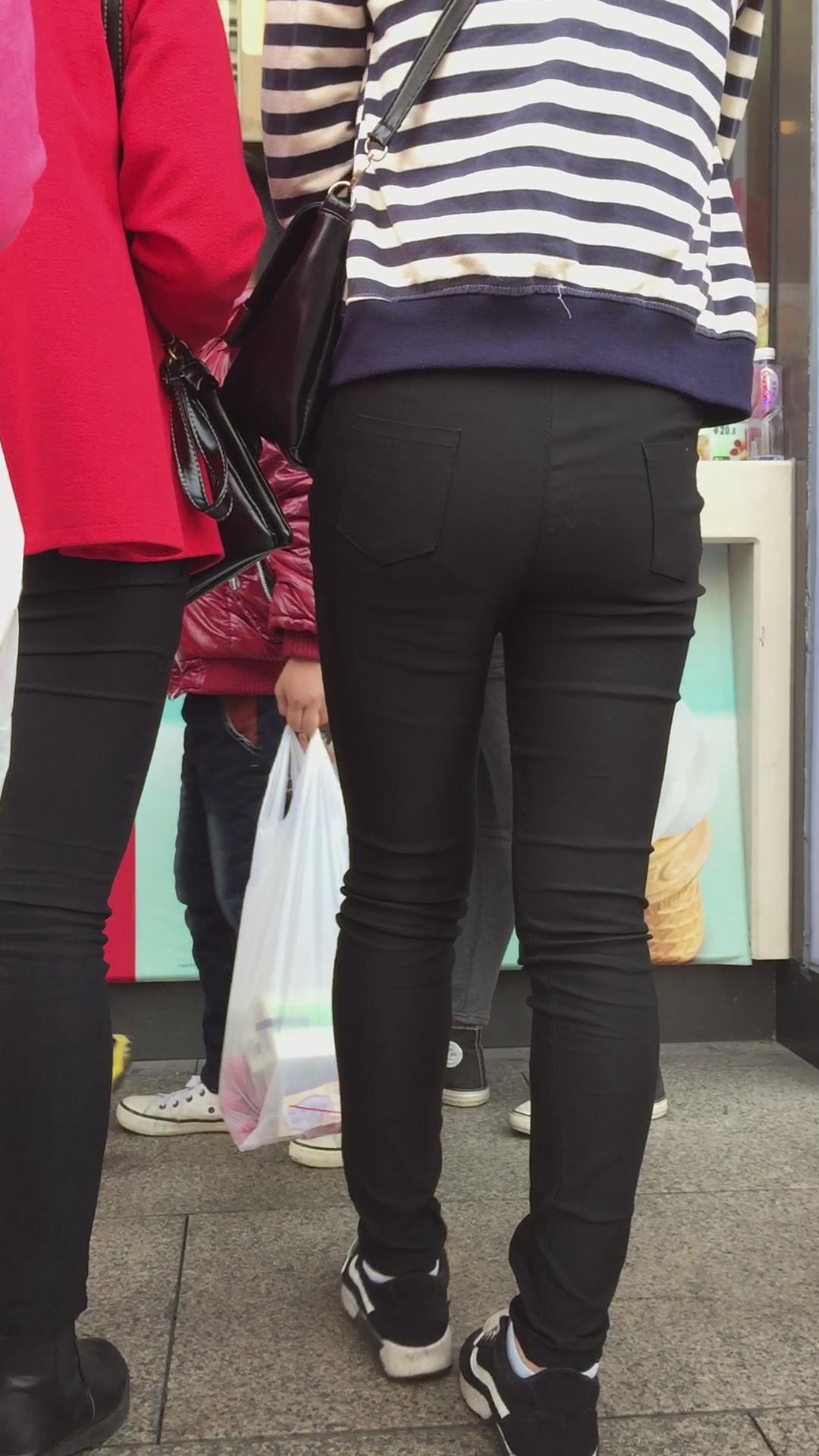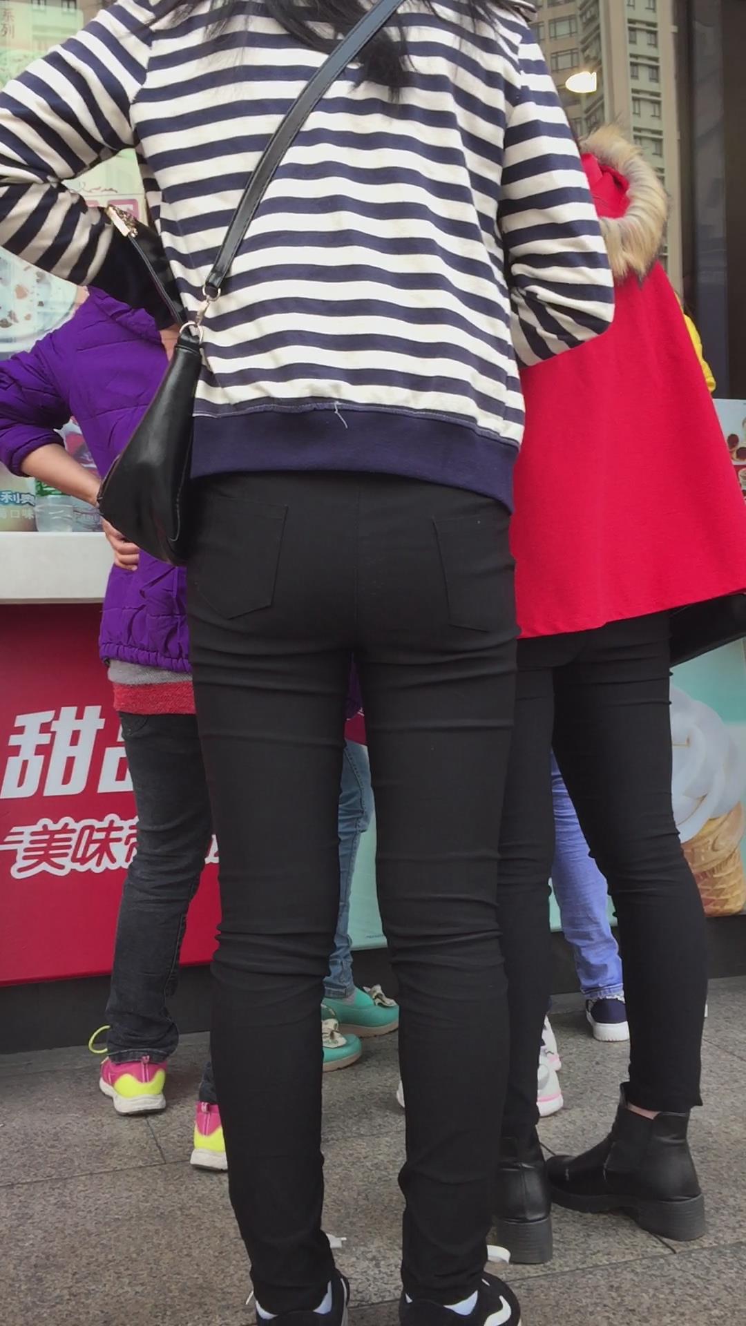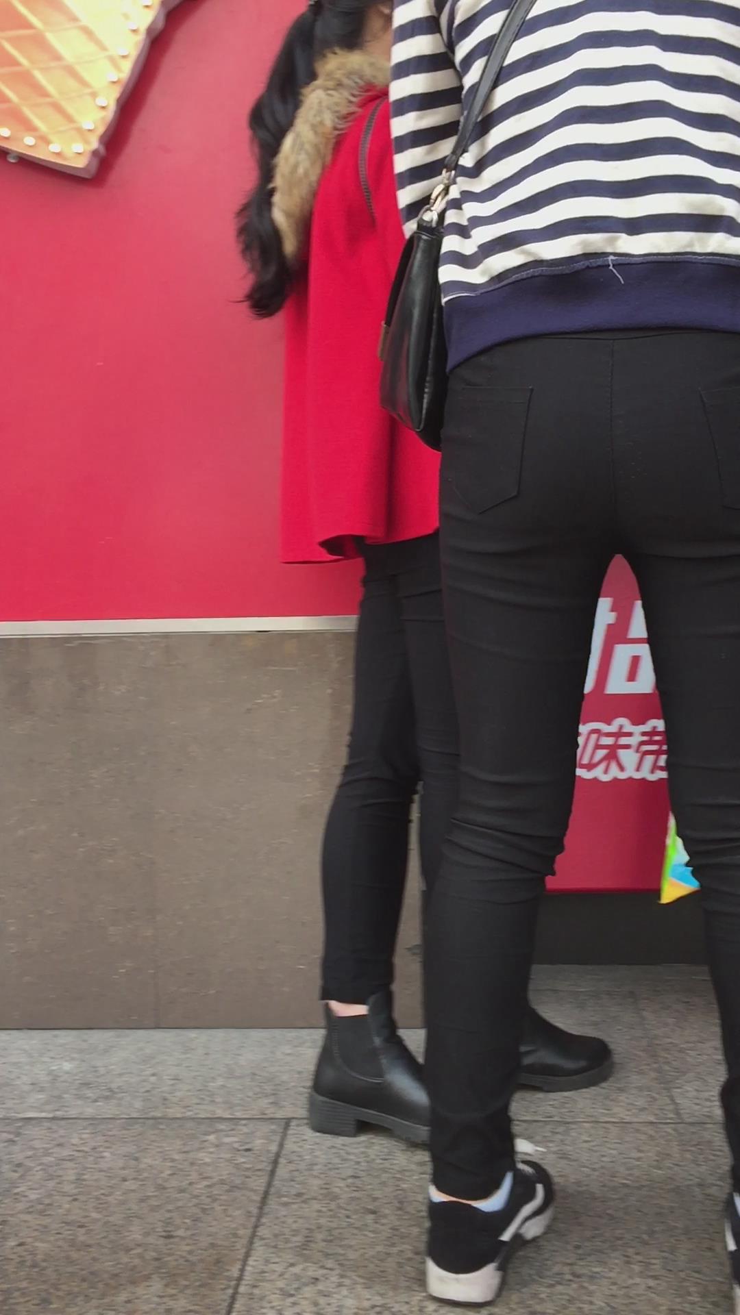 紧身黑裤吃货小美女排队买甜品,为了吃真能等 编号5499