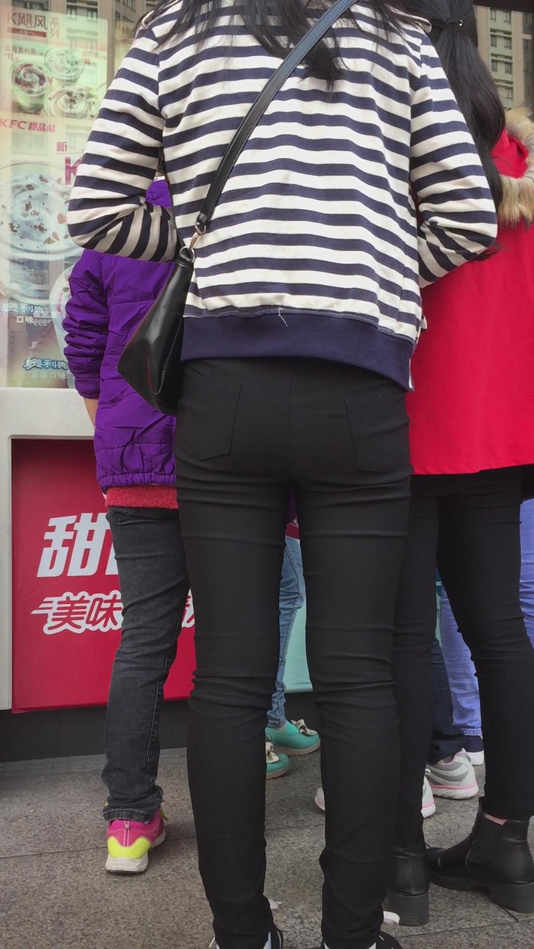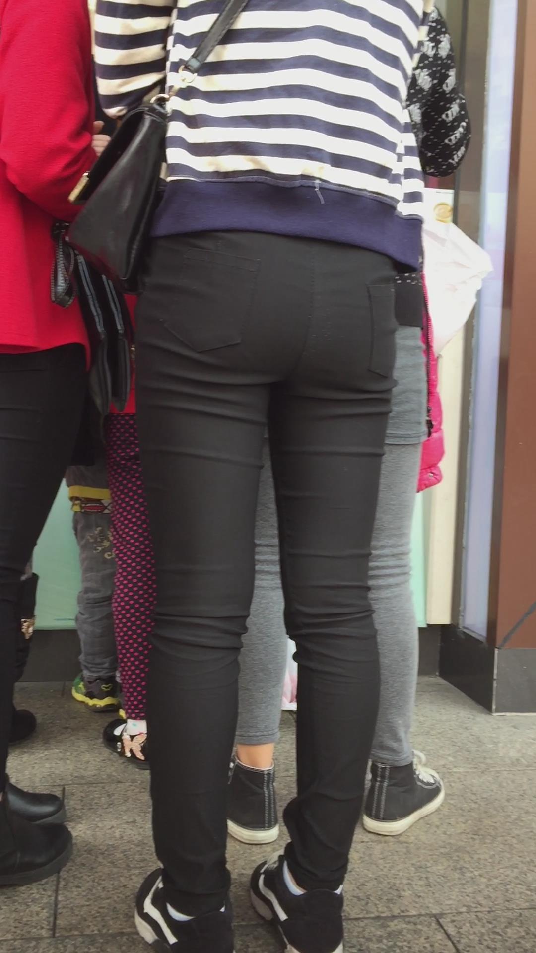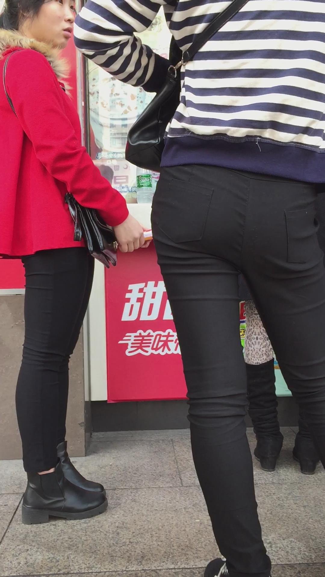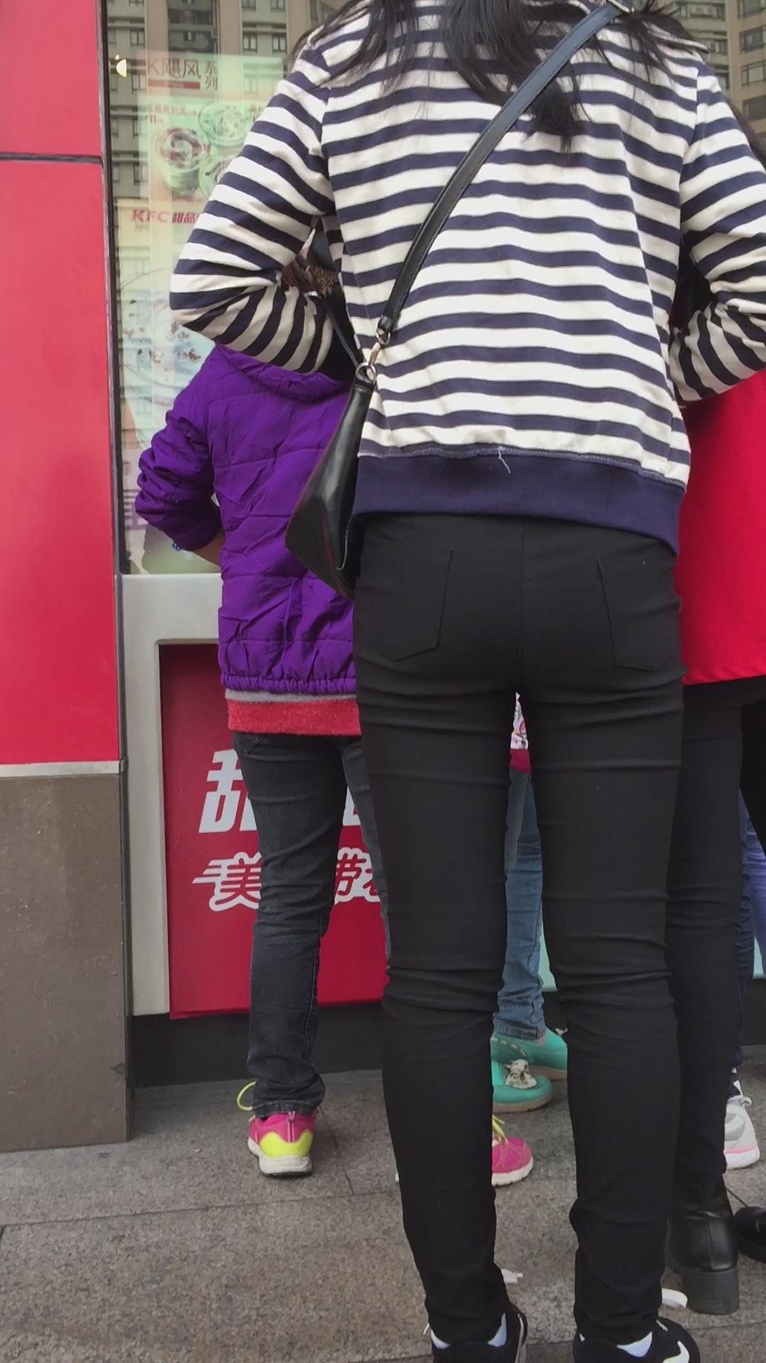 紧身黑裤吃货小美女排队买甜品,为了吃真能等 编号5499