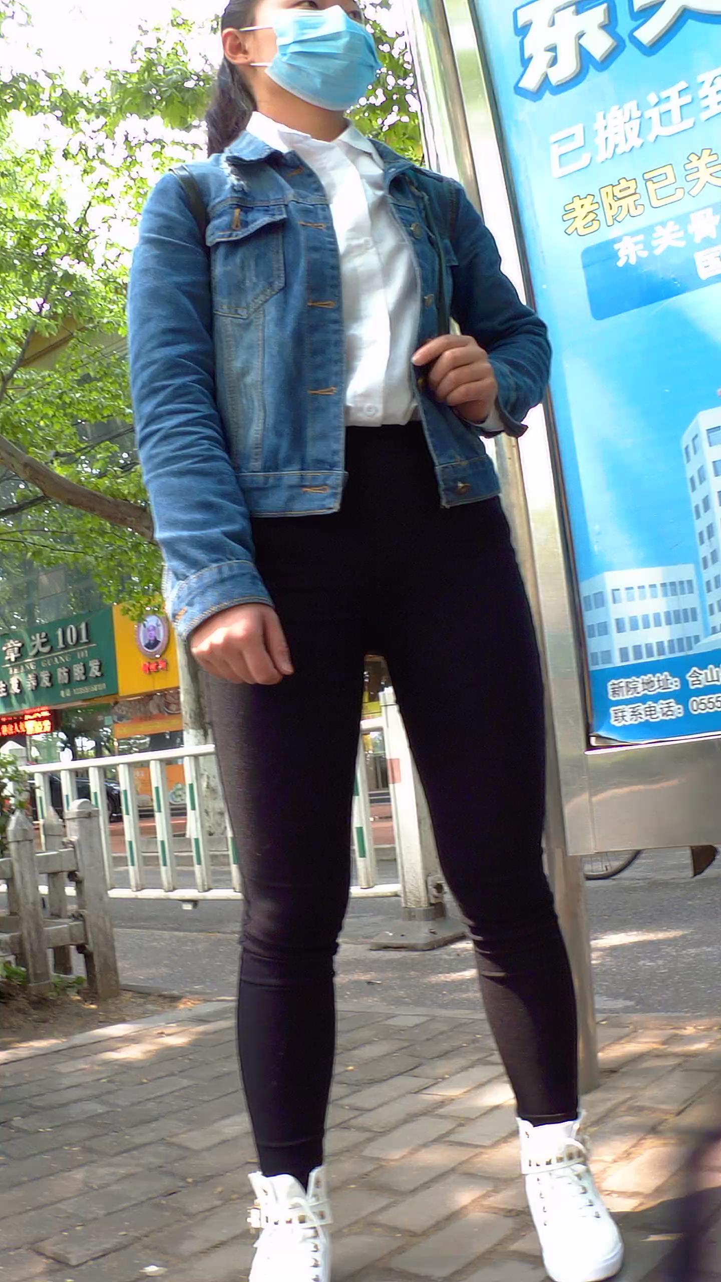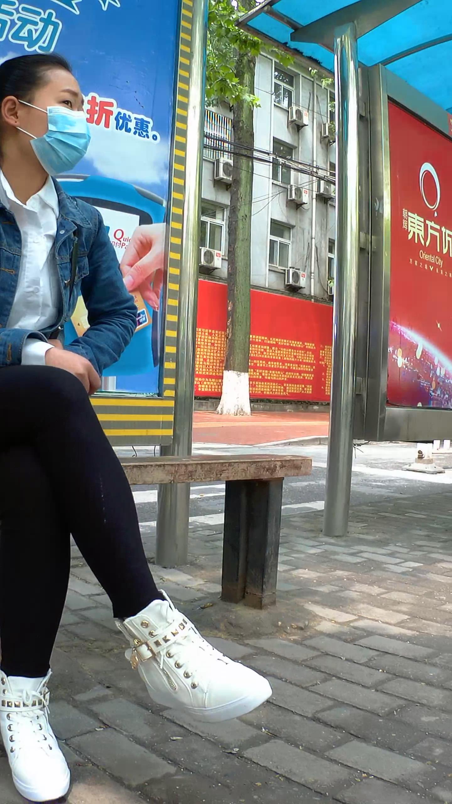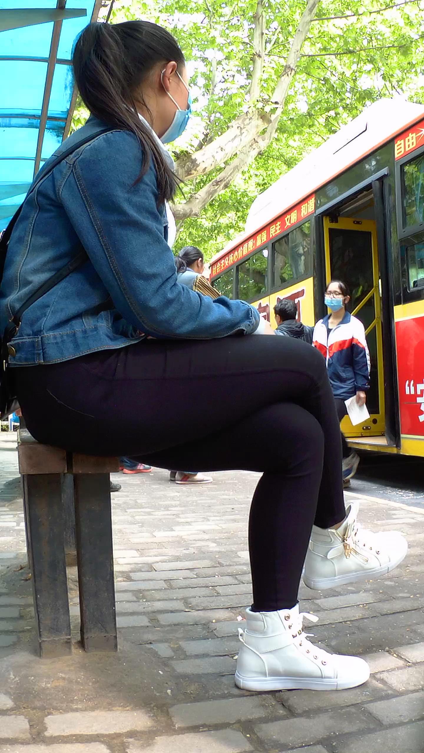 公交站拍摄黑色紧身裤宽臀学生妹 编号5551