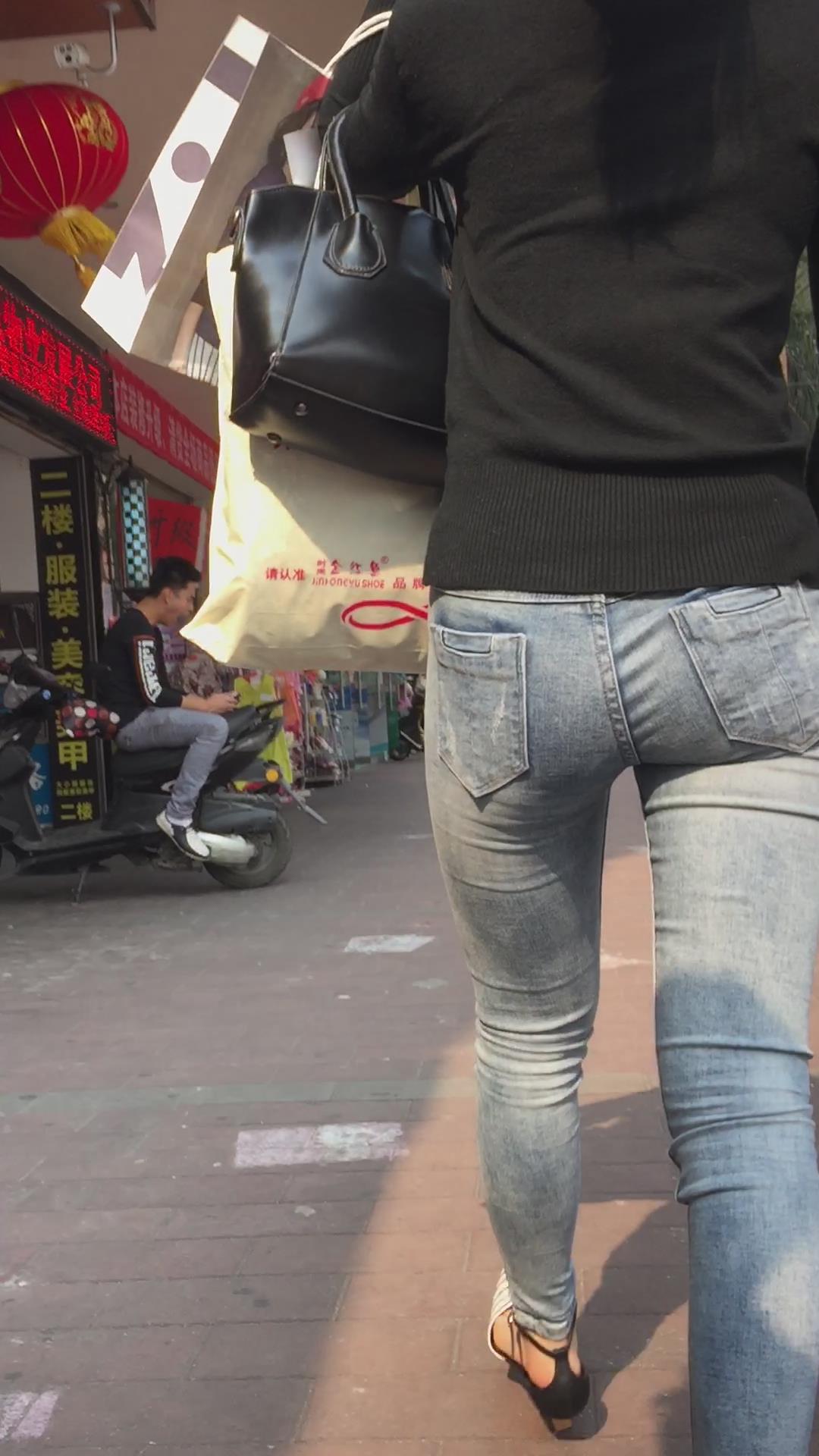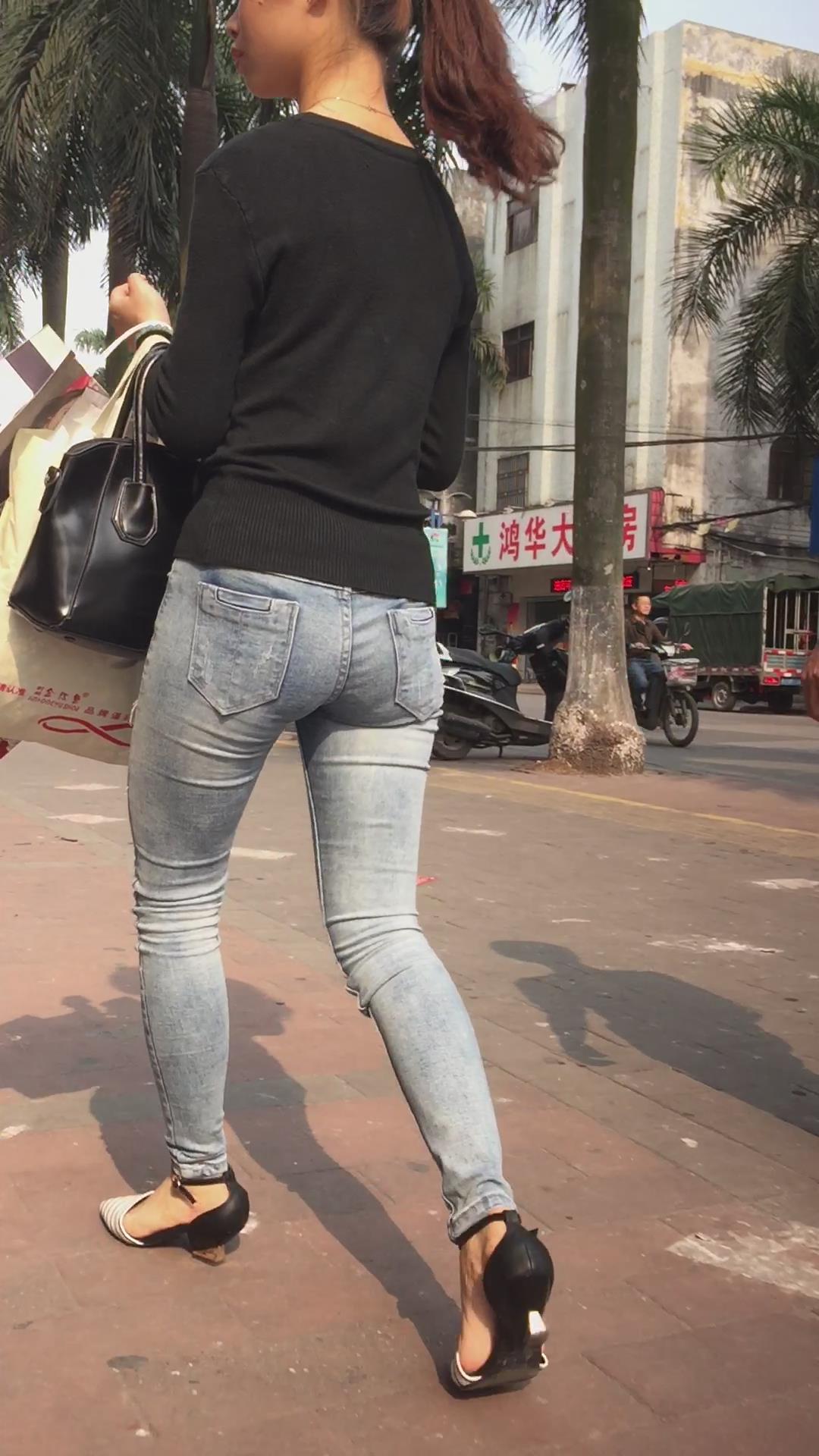 跟拍超紧绷蓝色牛仔裤马尾辫素颜美女 编号5558