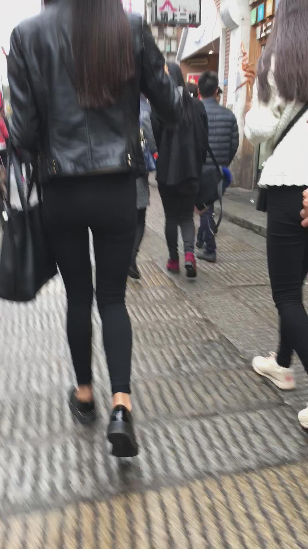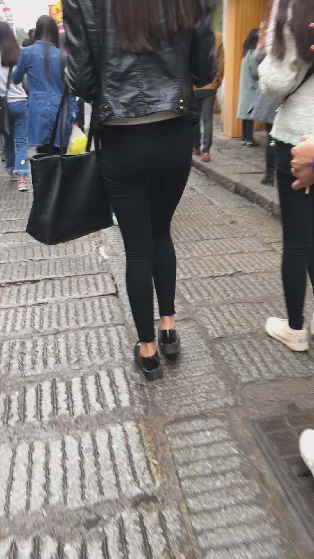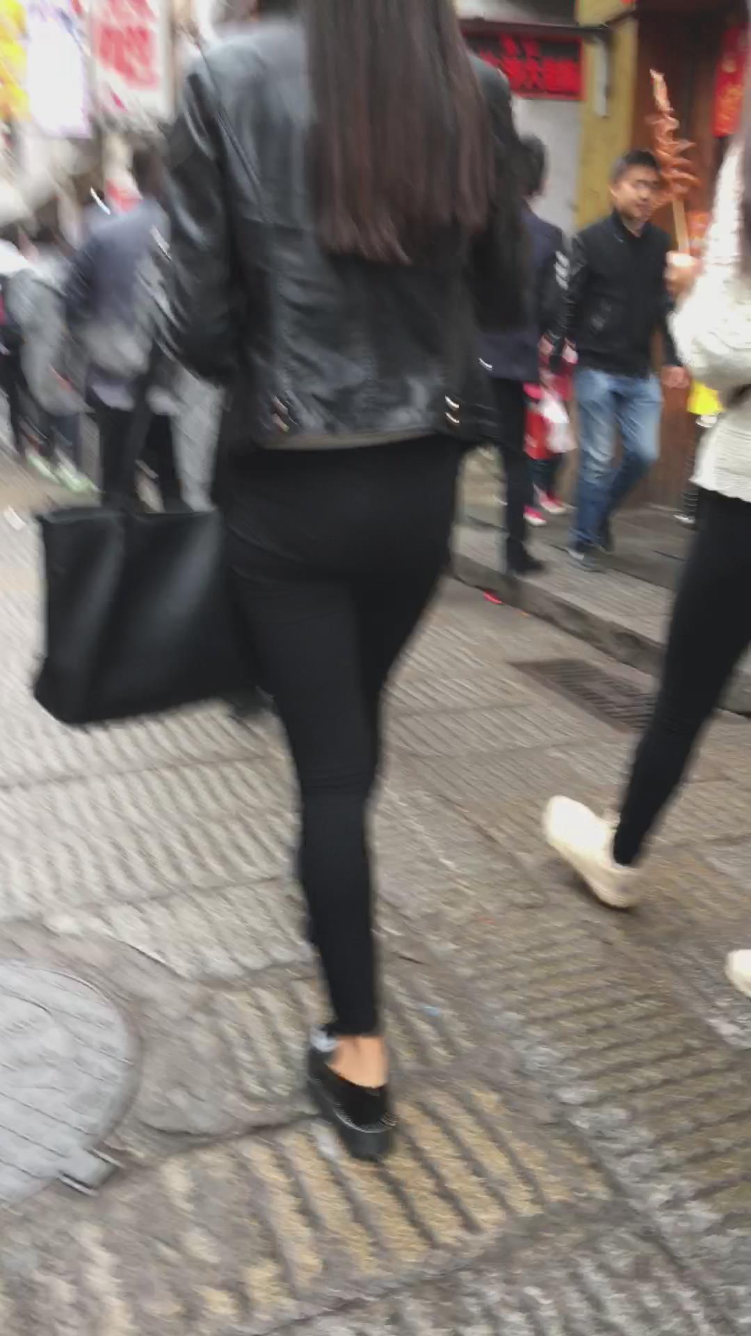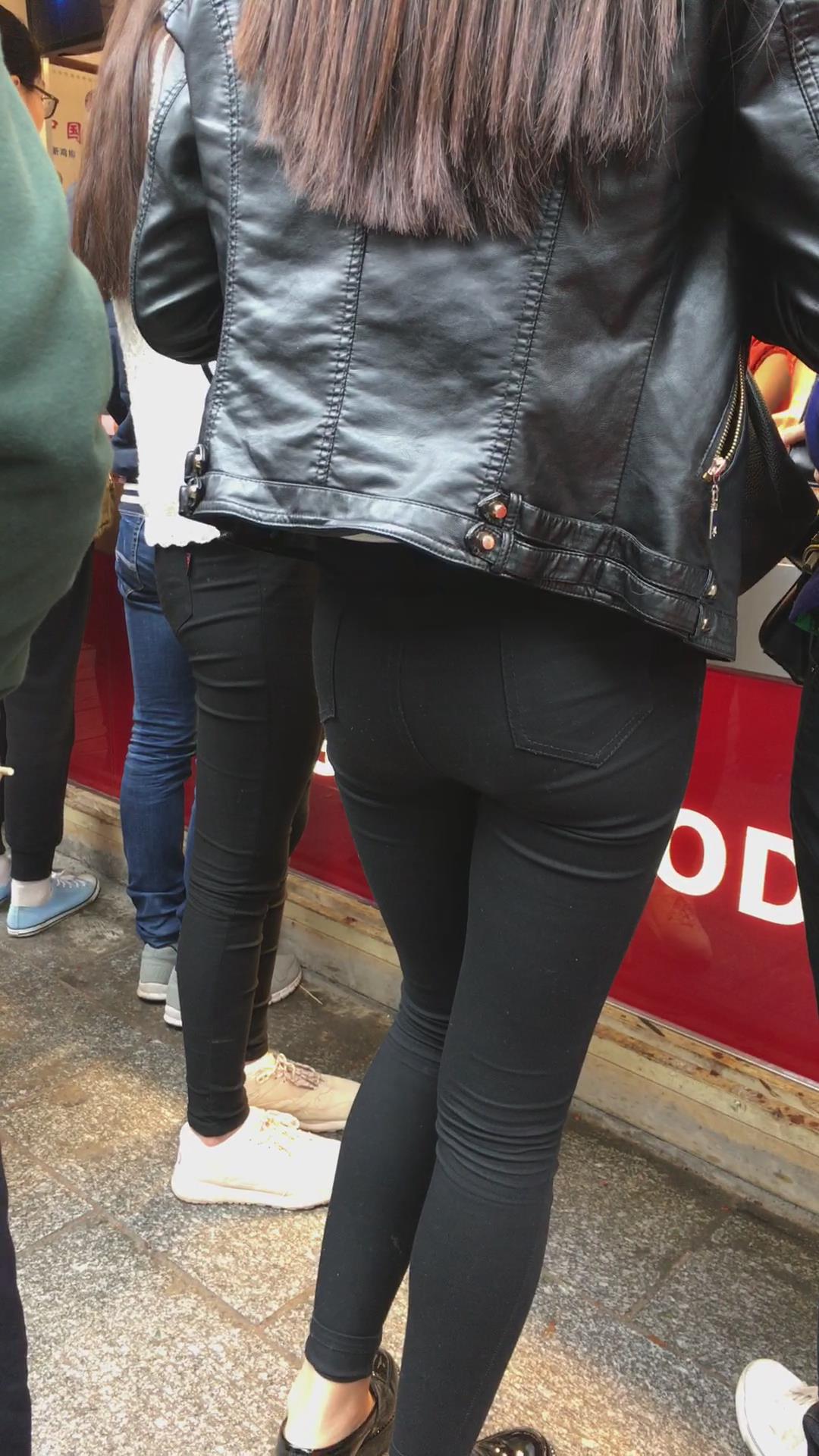 街拍皮衣紧俏美臀紧身黑裤美眉 编号5581