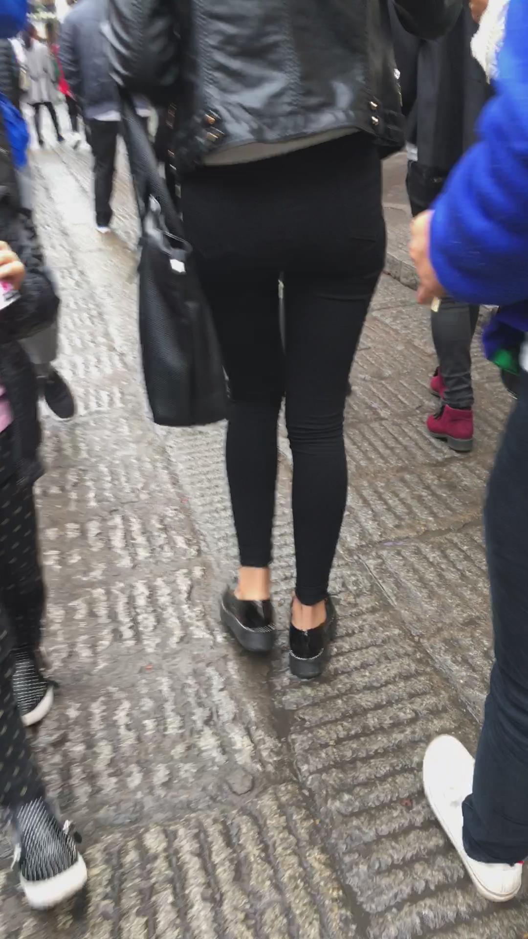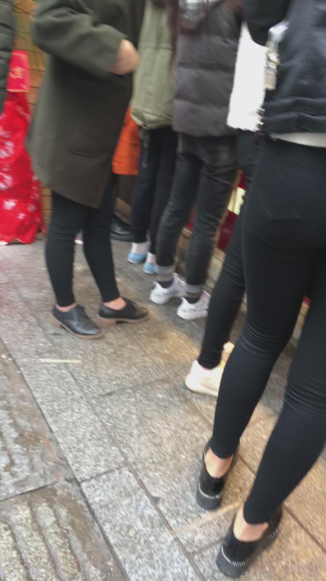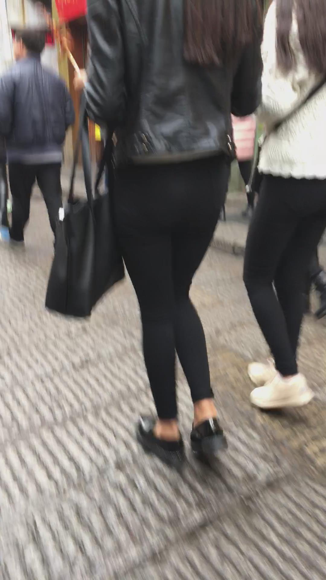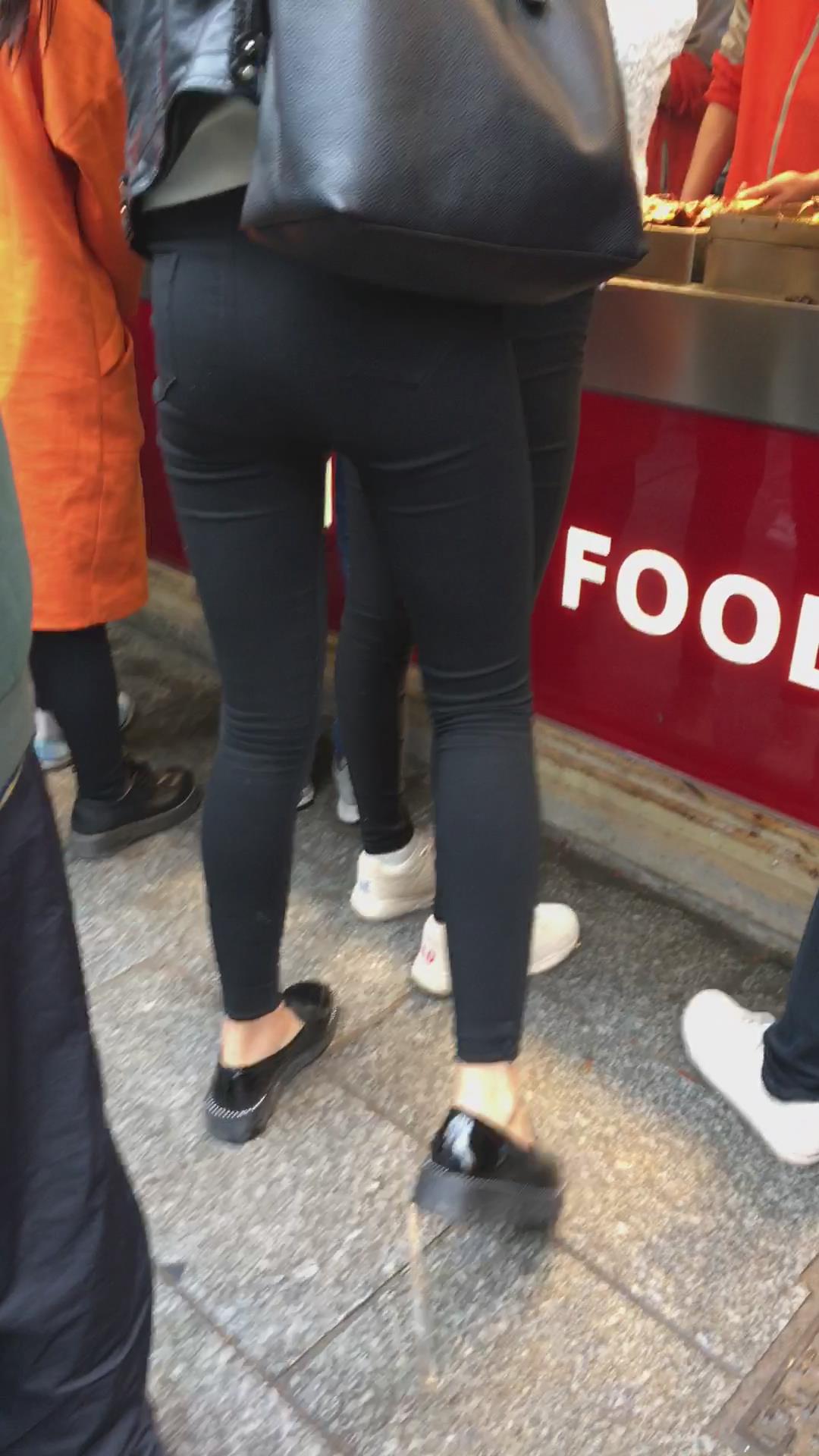 街拍皮衣紧俏美臀紧身黑裤美眉 编号5581
