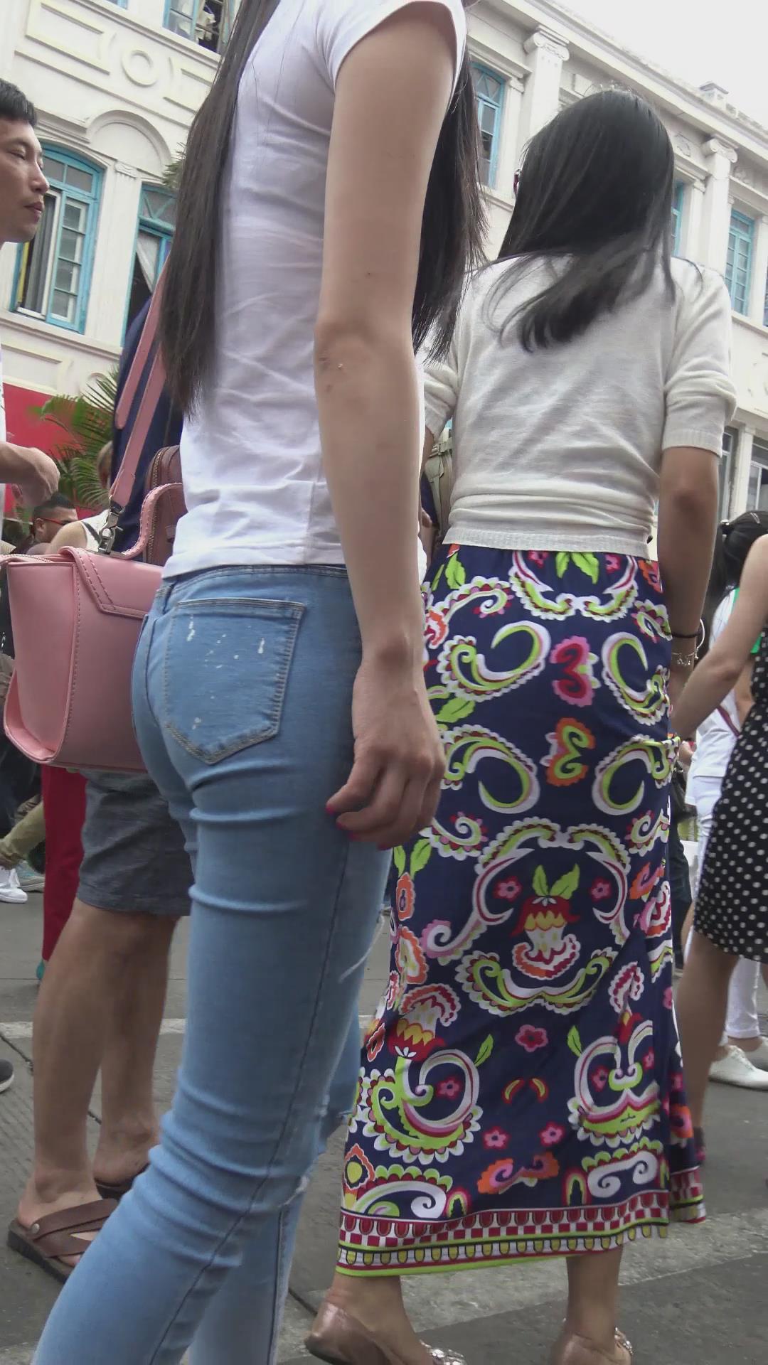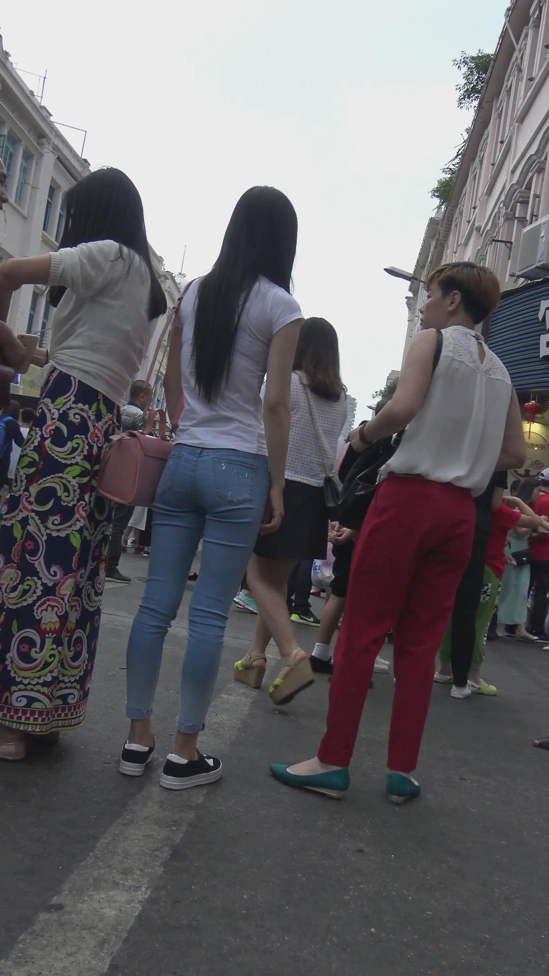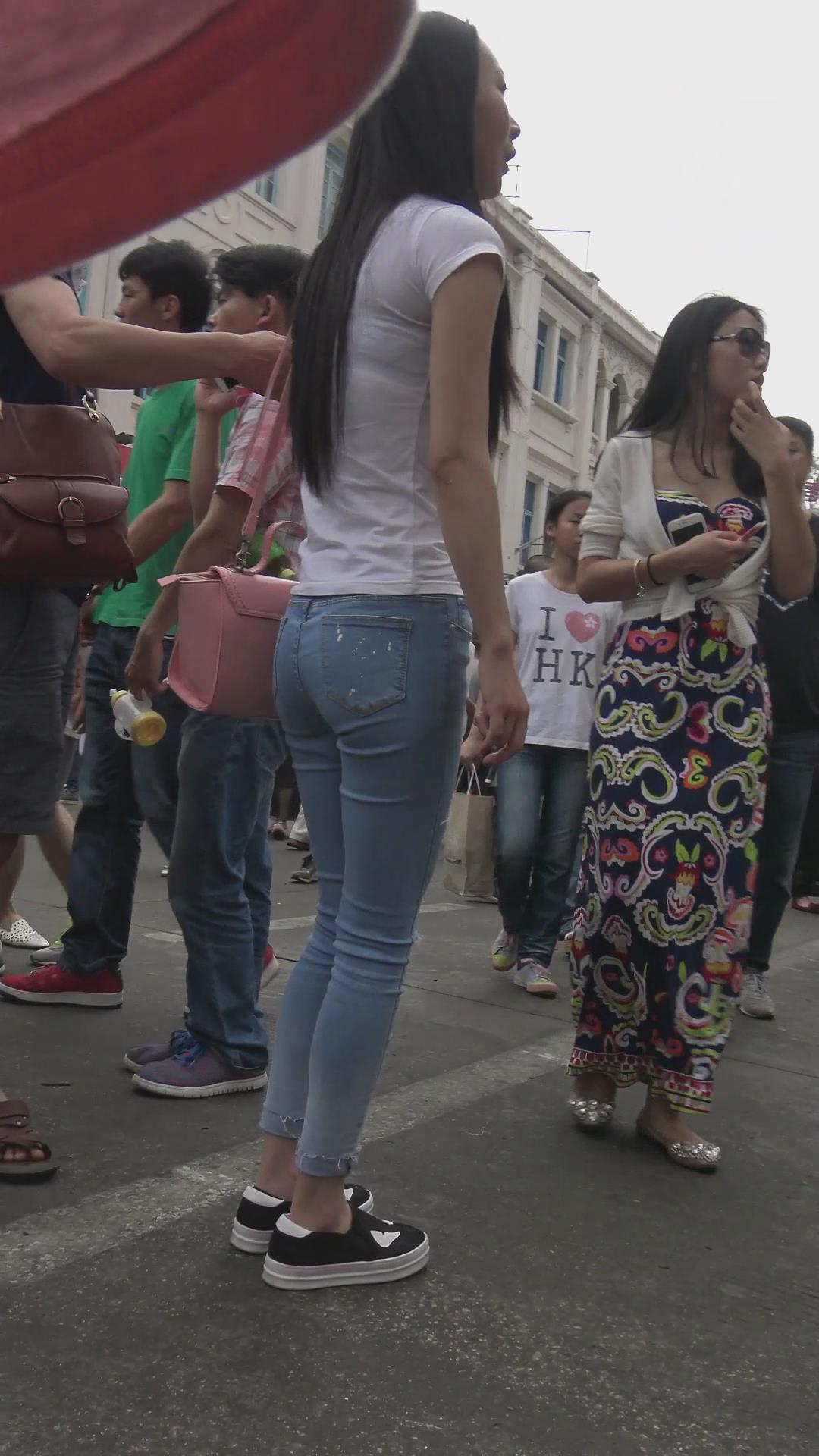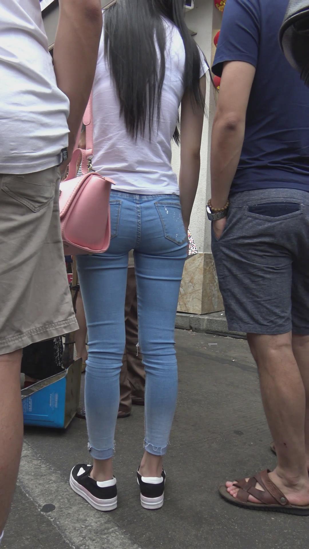 街拍蓝色紧身牛仔裤清纯小清新美女 编号6143