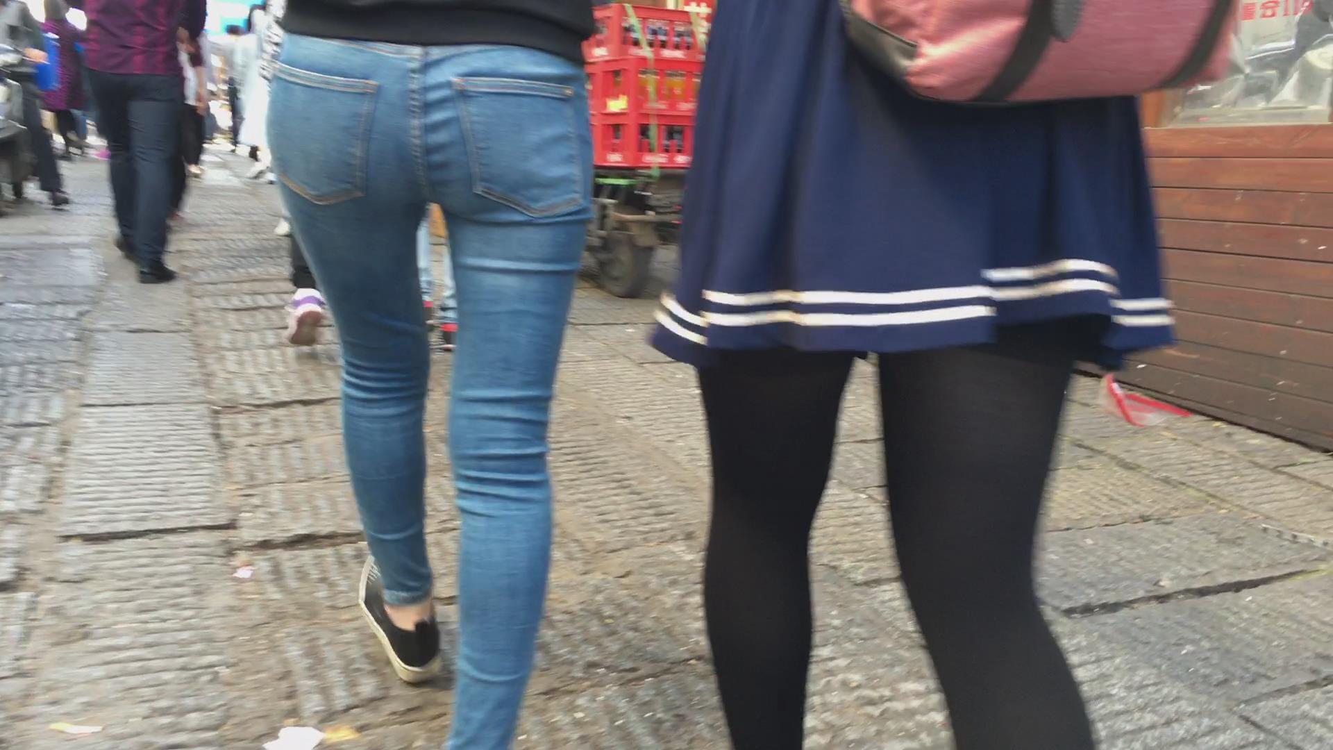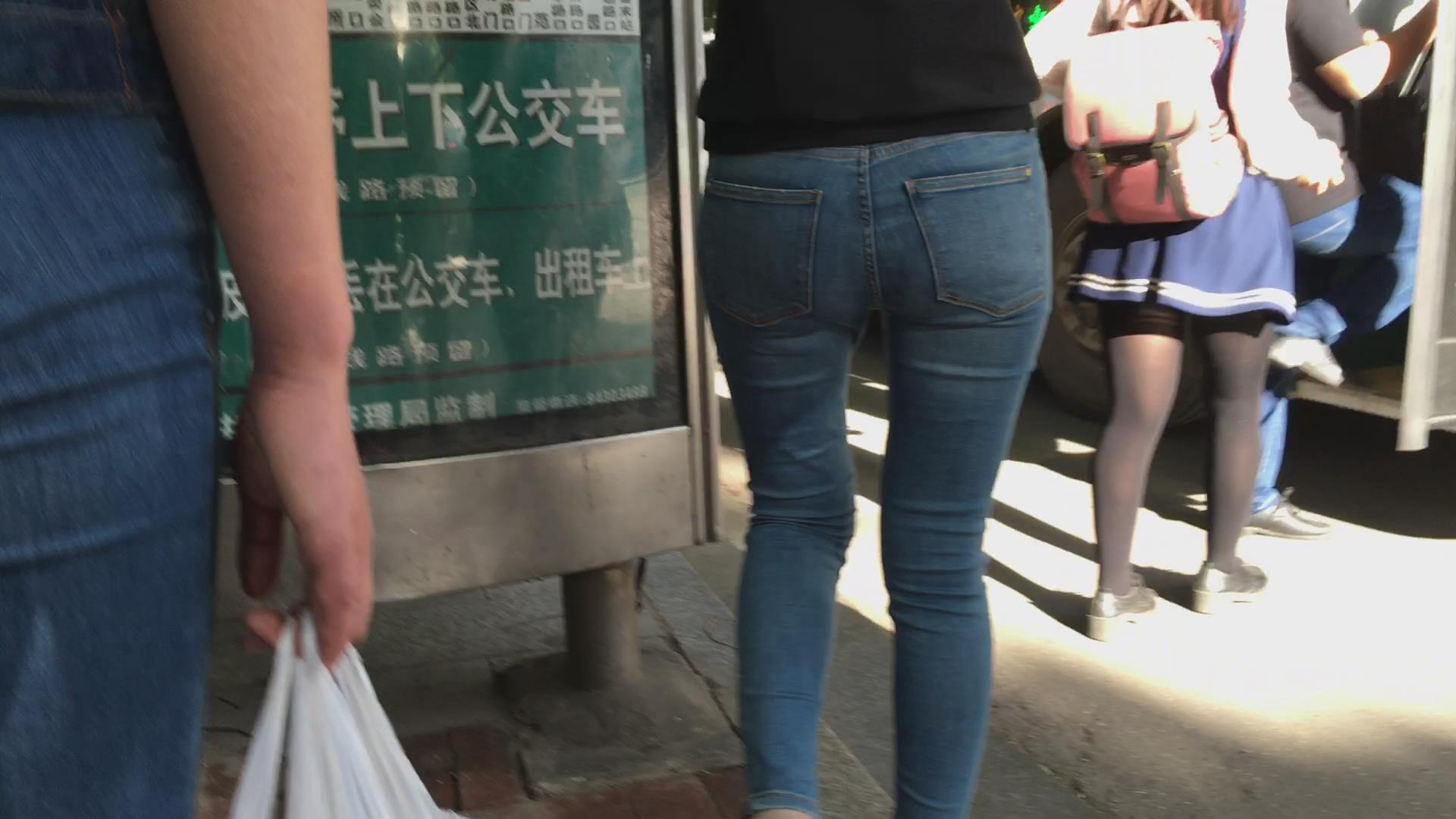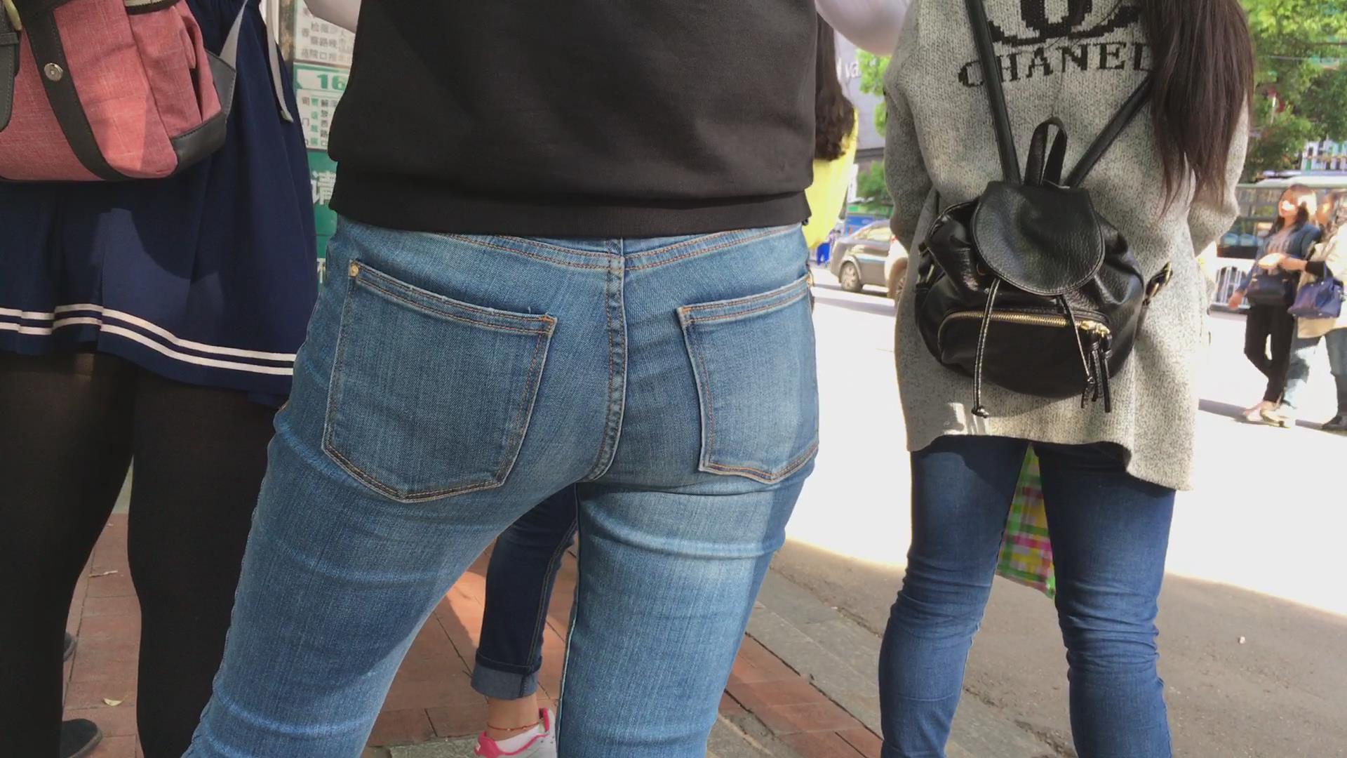 街拍超紧身蓝色牛仔裤宽臀美女 编号5633