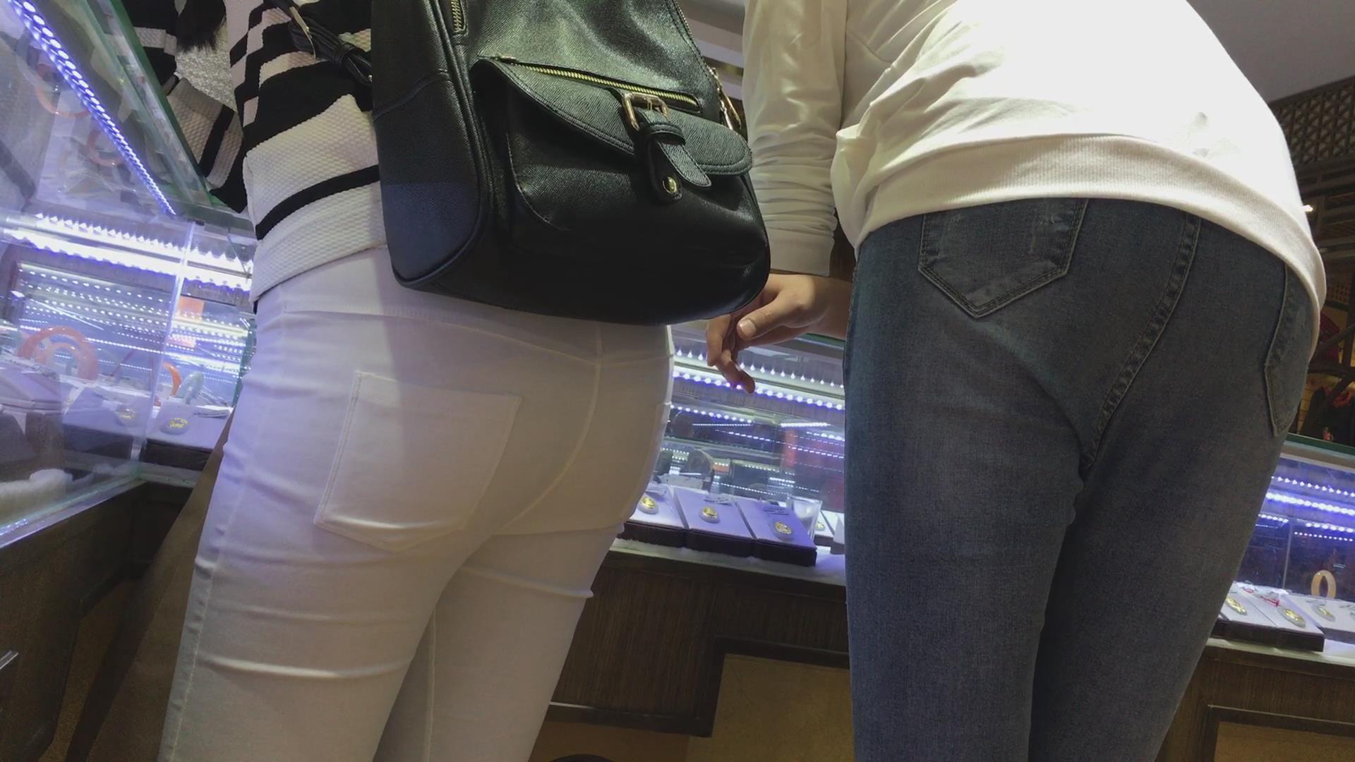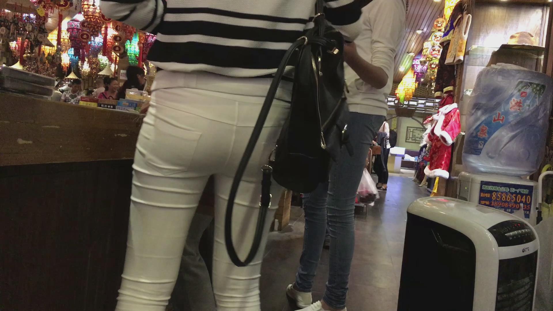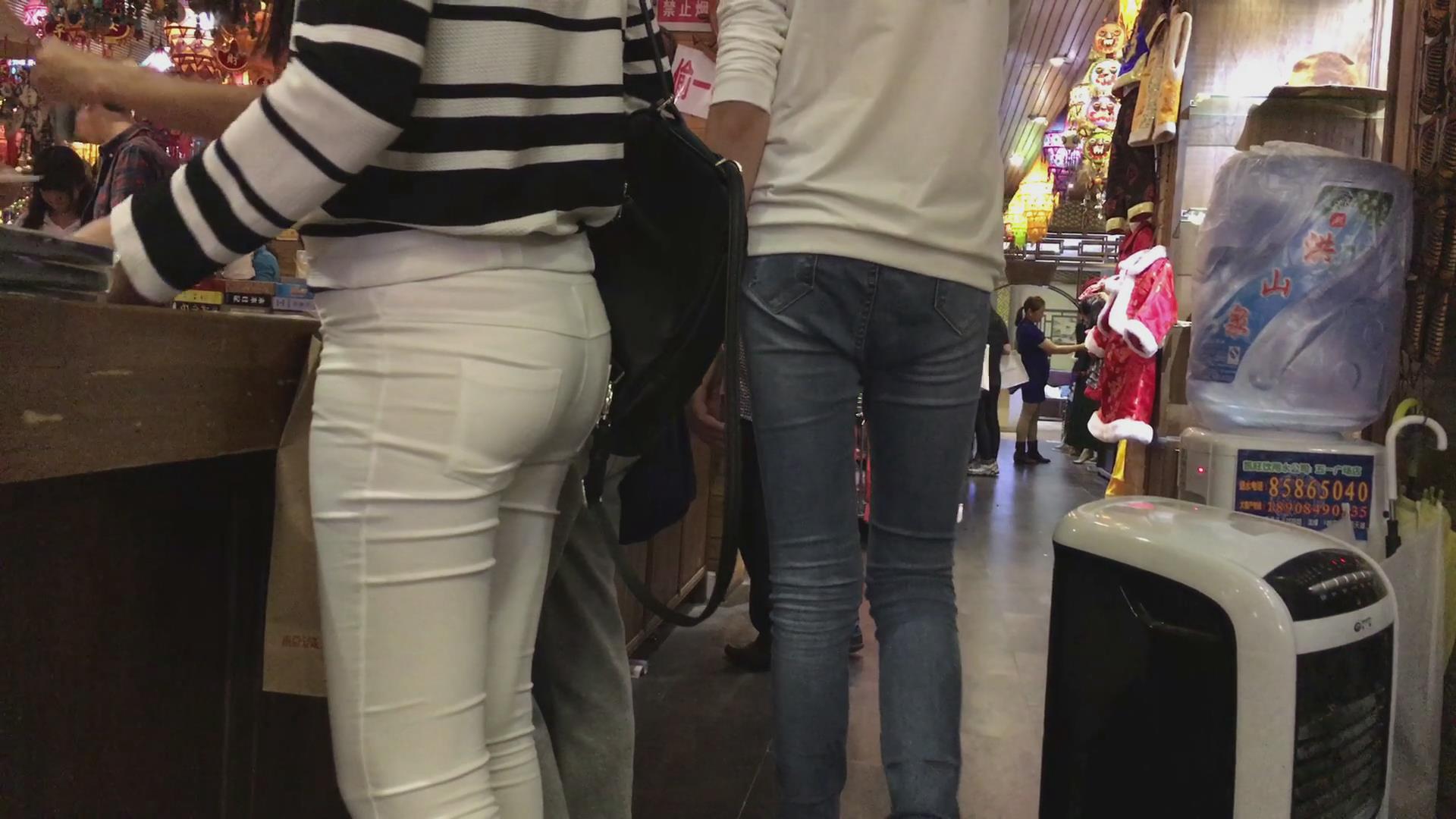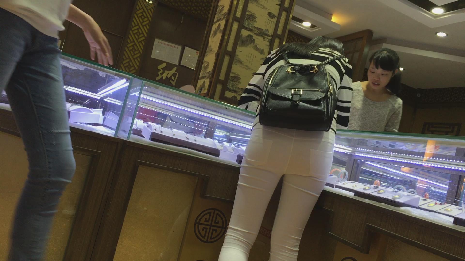 街拍紧身白裤翘臀美女逛玉器店 编号6146