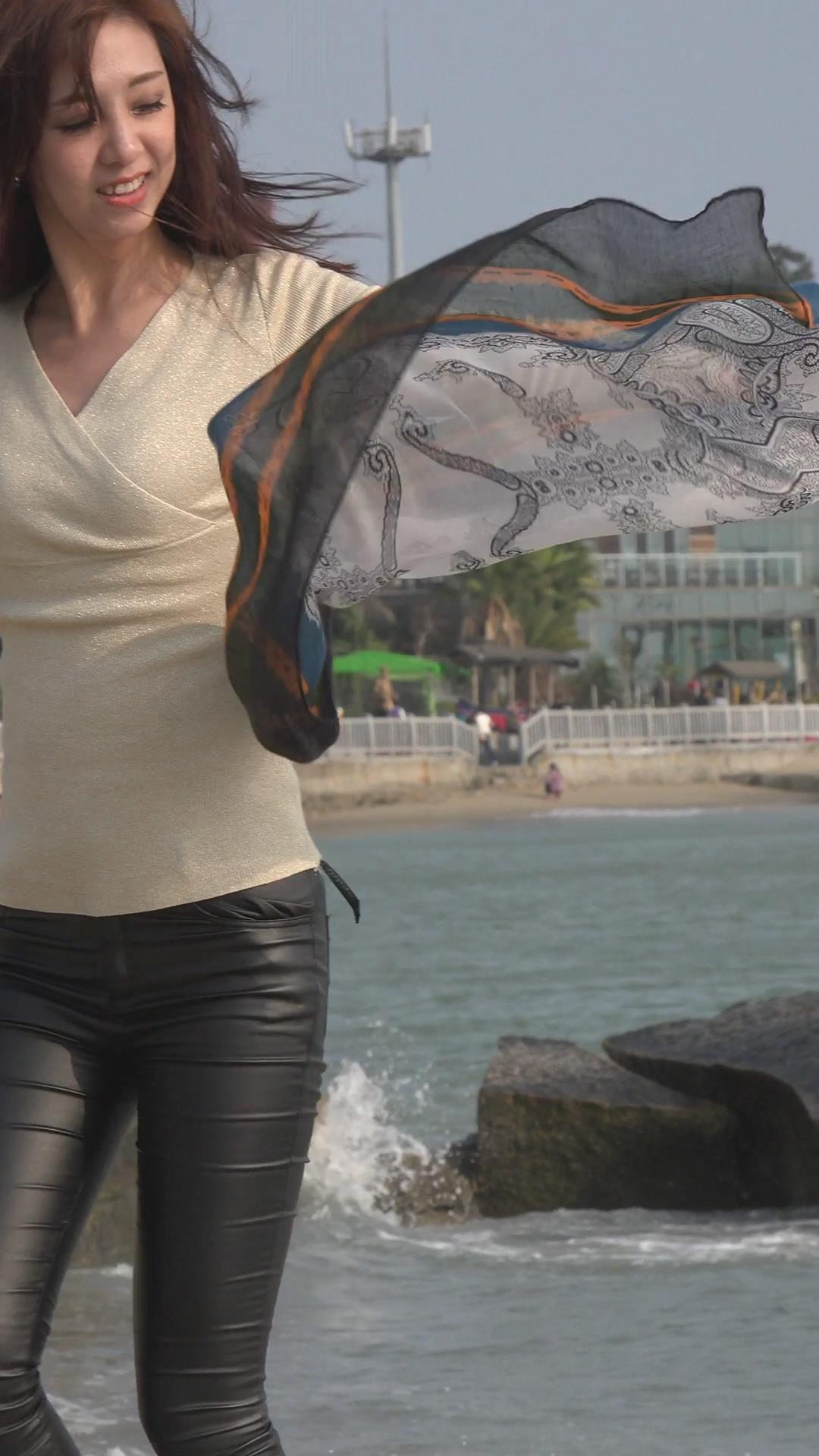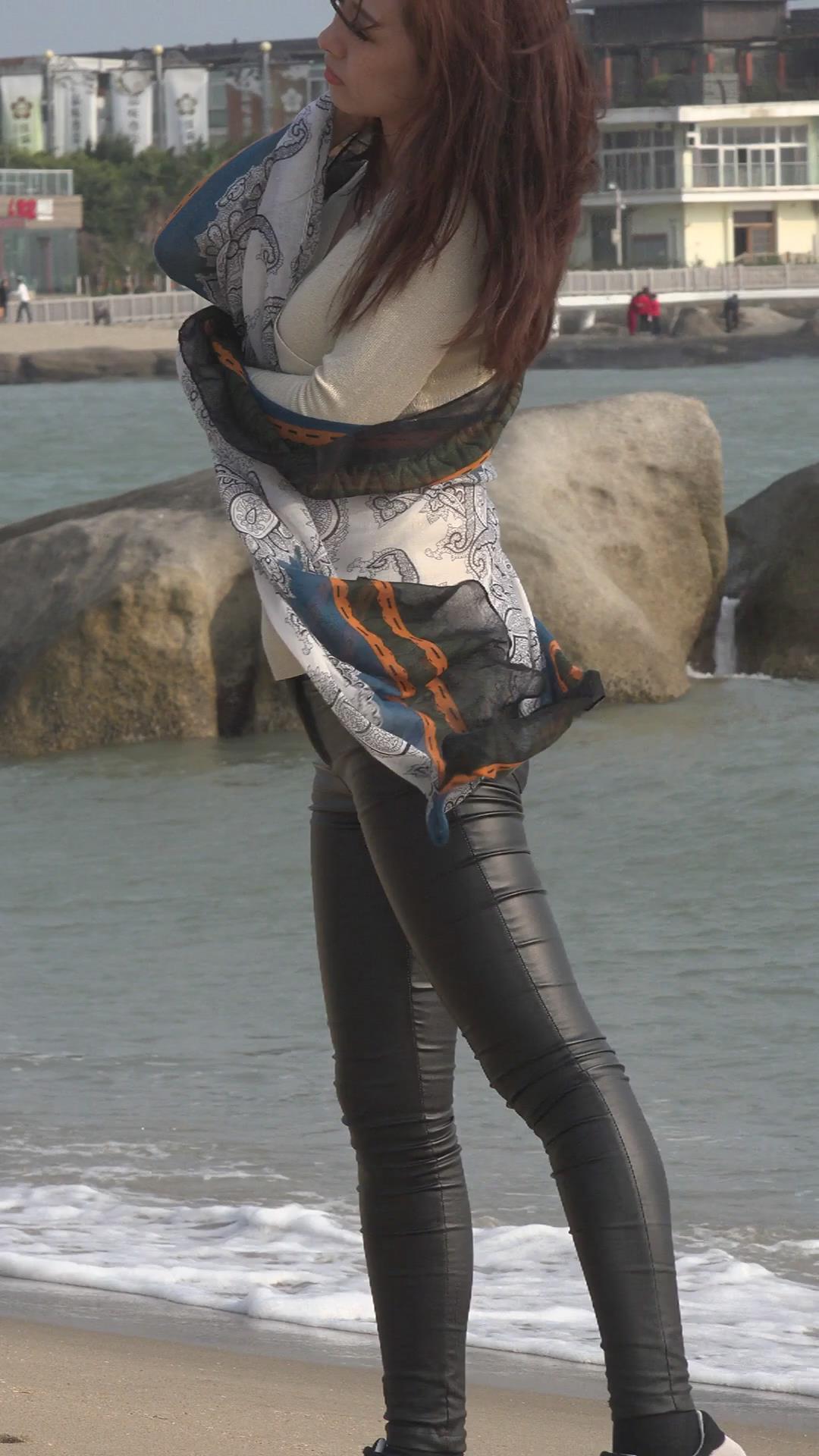 海边迎风拍照超美的皮裤运动鞋美女 编号5693