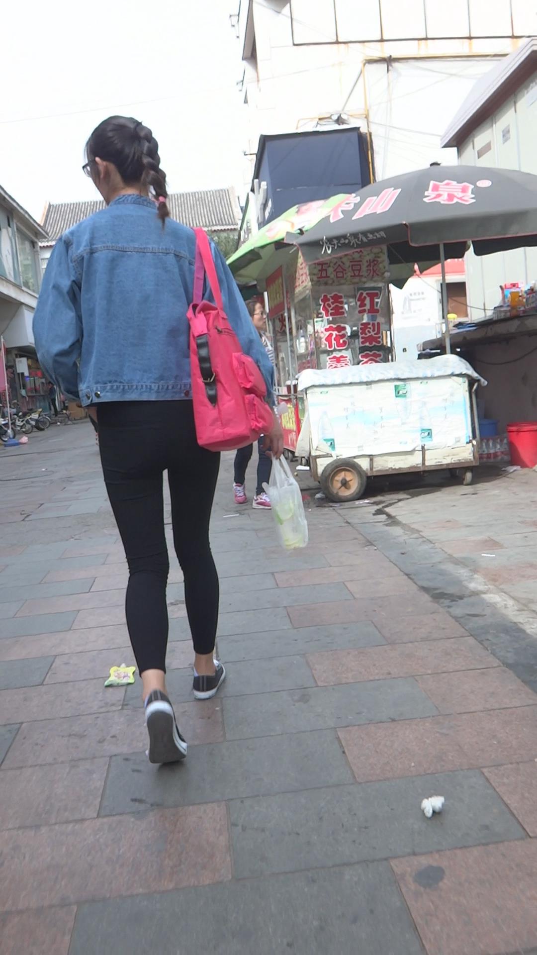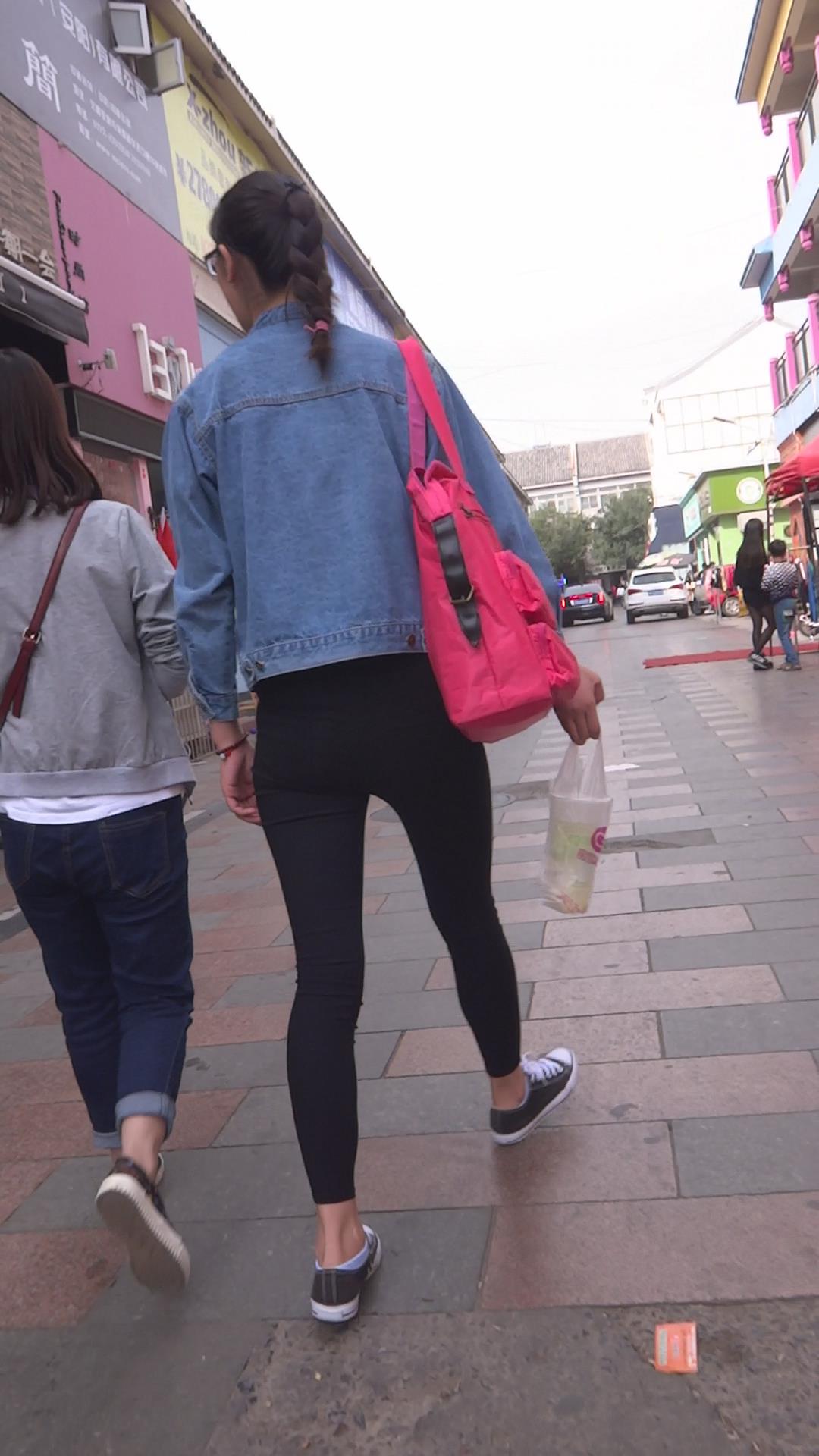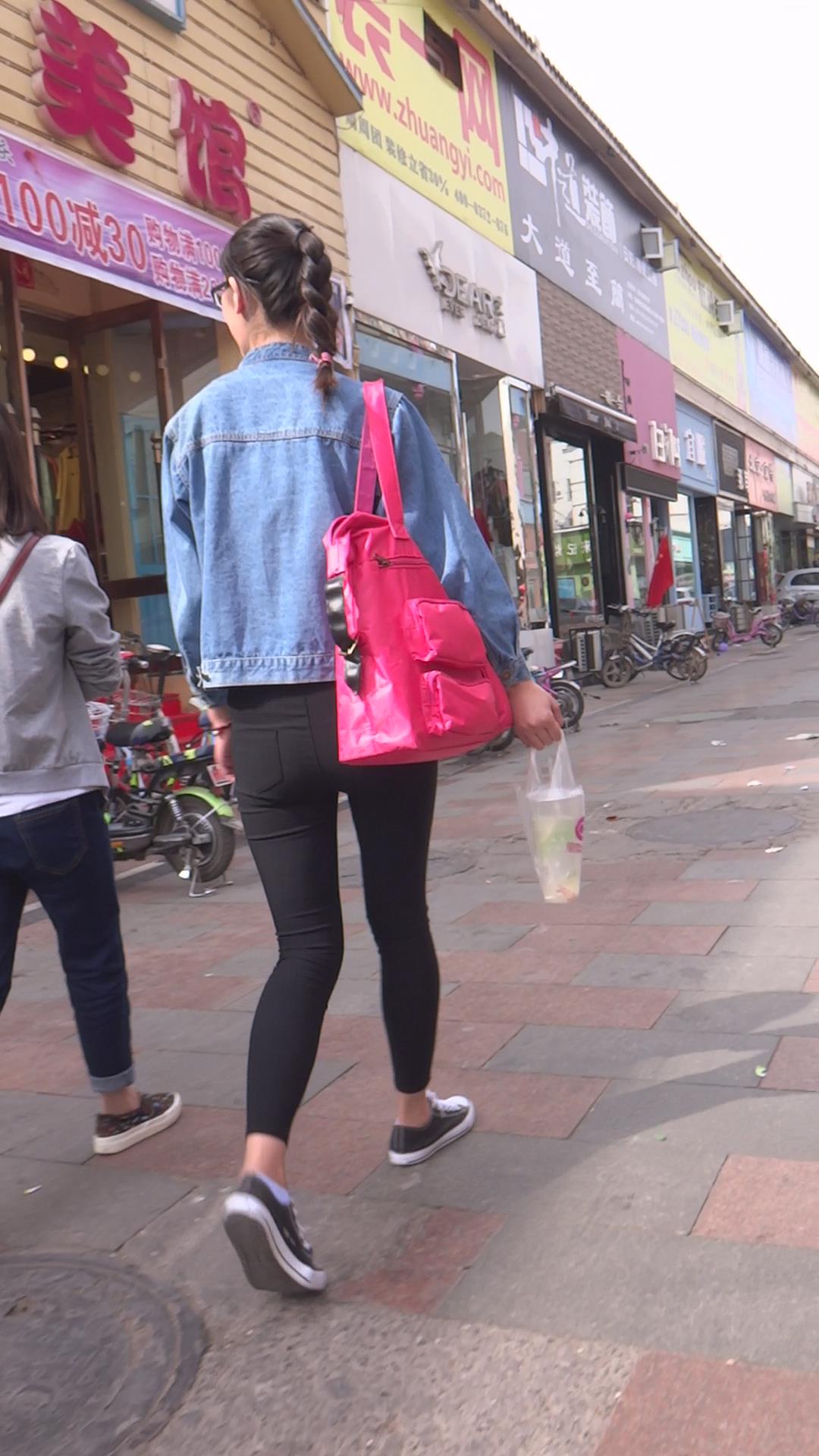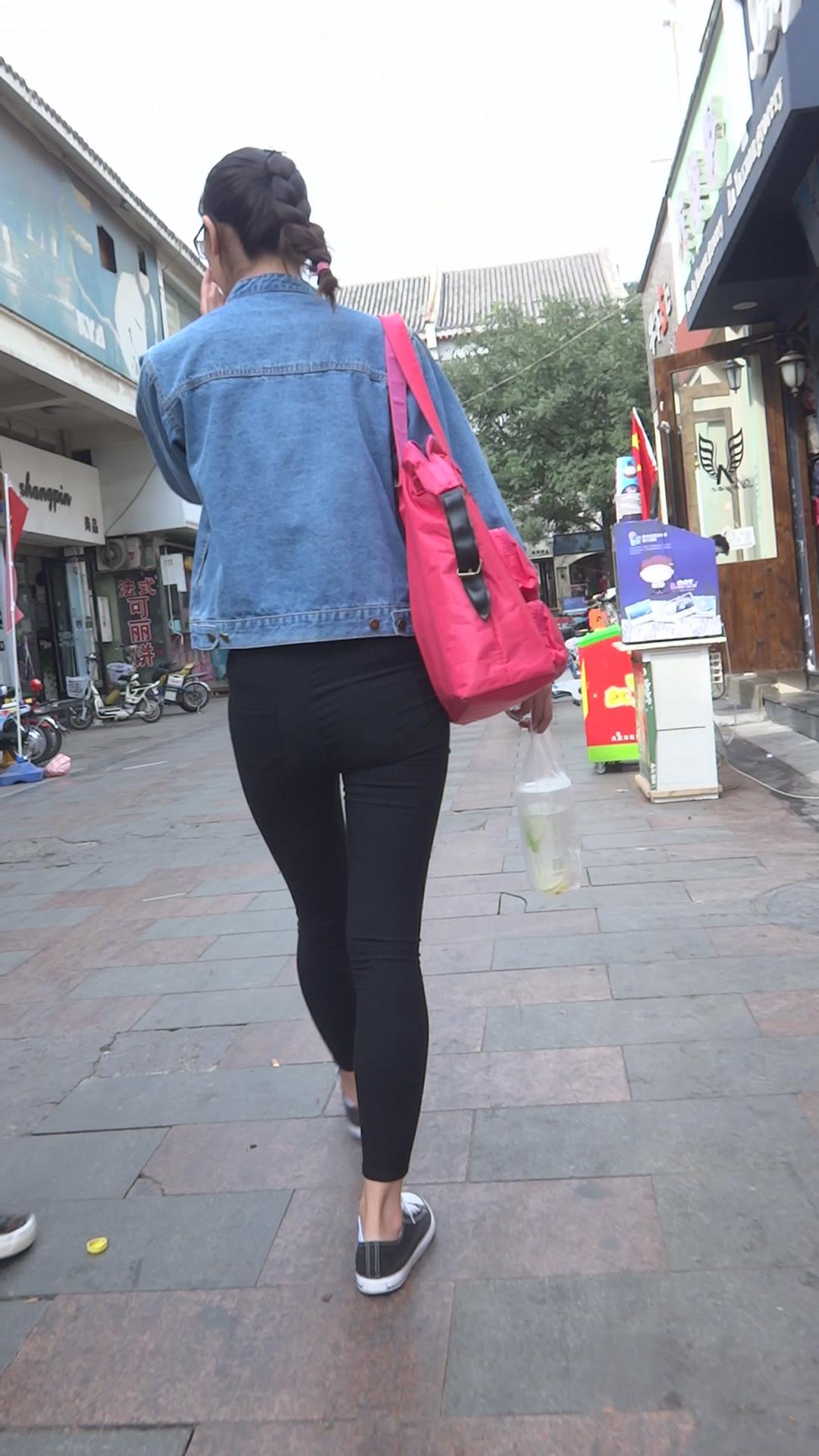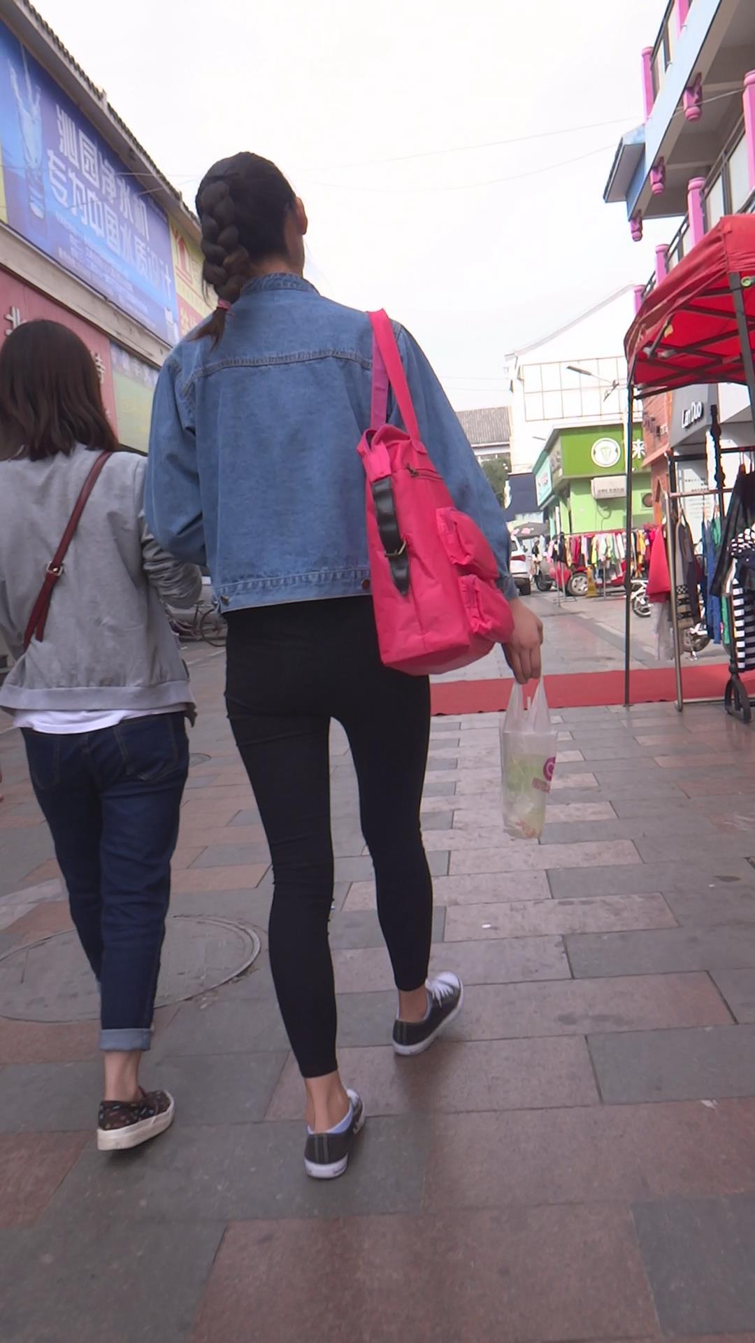 牛仔小外套紧身黑裤女孩跟闺蜜压马路 编号5701