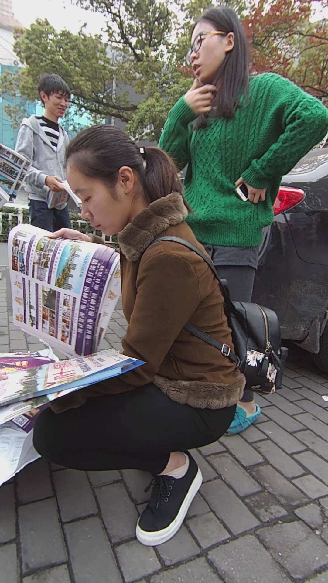 黑色紧身裤宽臀棕色外套学生妹路口发传单 编号5829