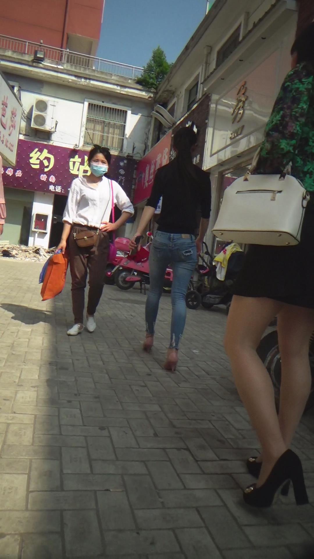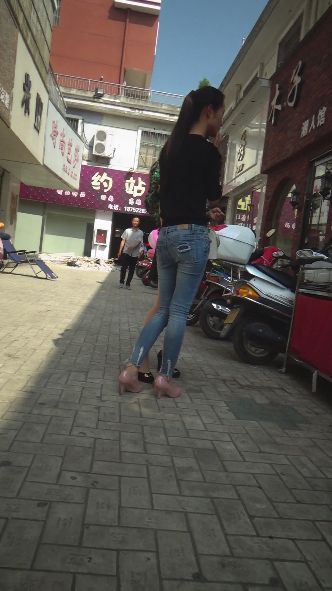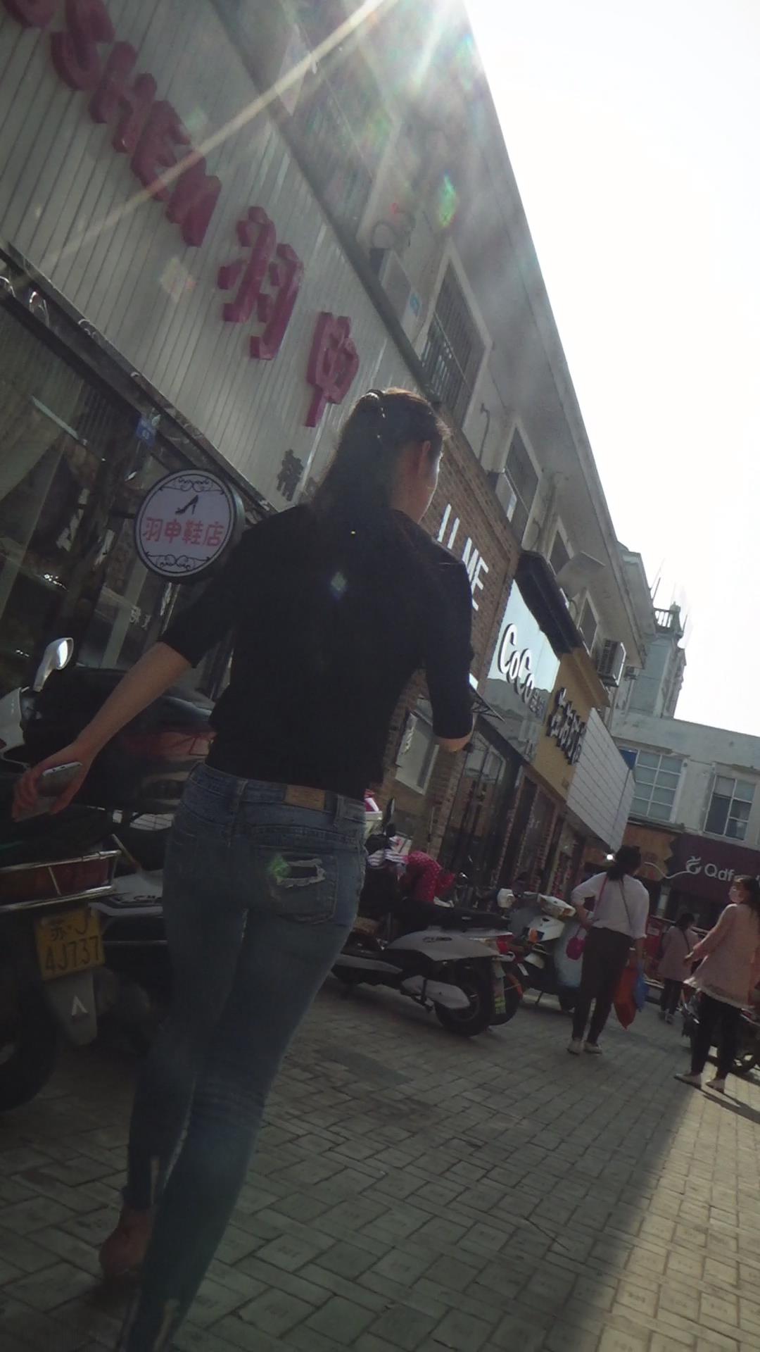 街拍紧身蓝色牛仔裤美女 编号5884