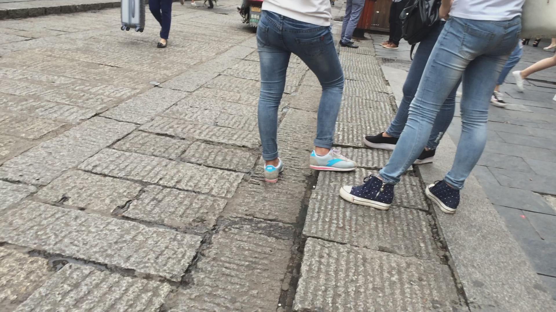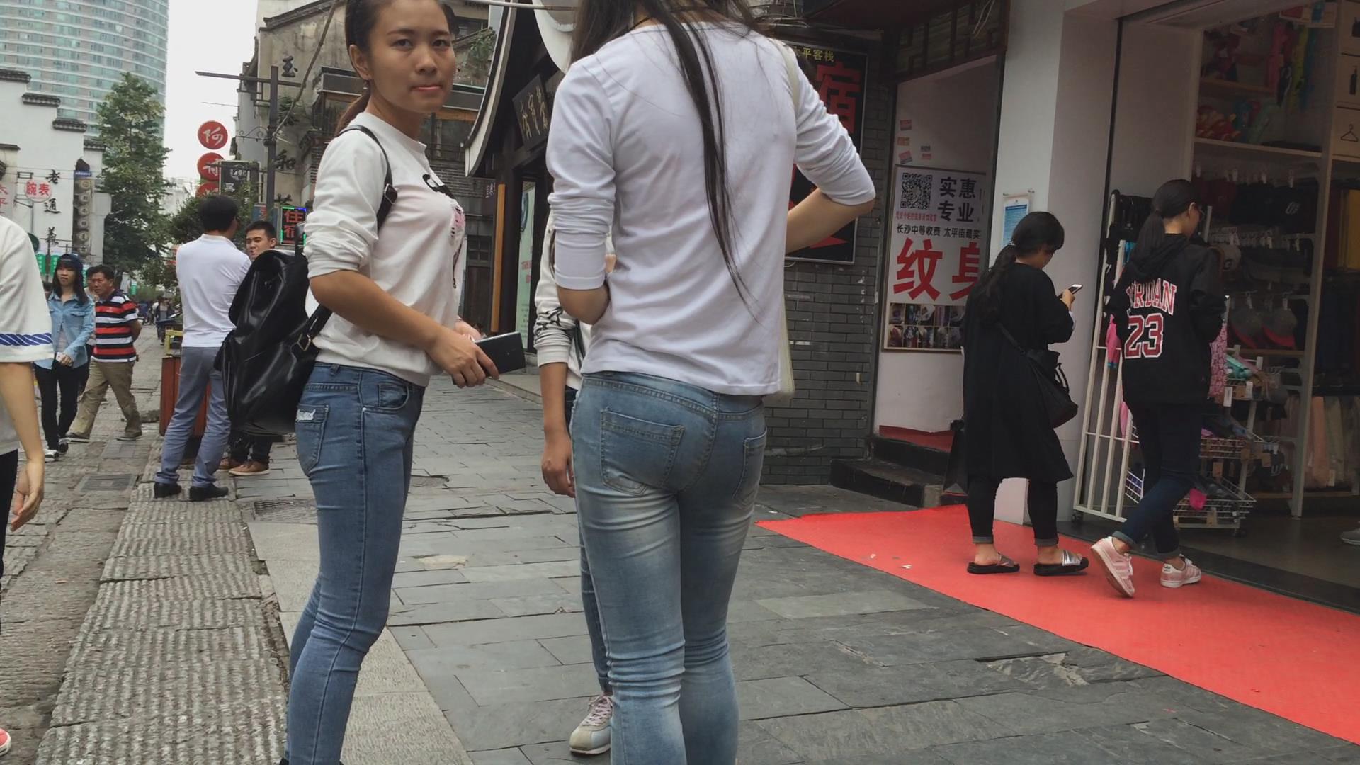 街拍三位紧身蓝色牛仔裤学生妹 编号5987
