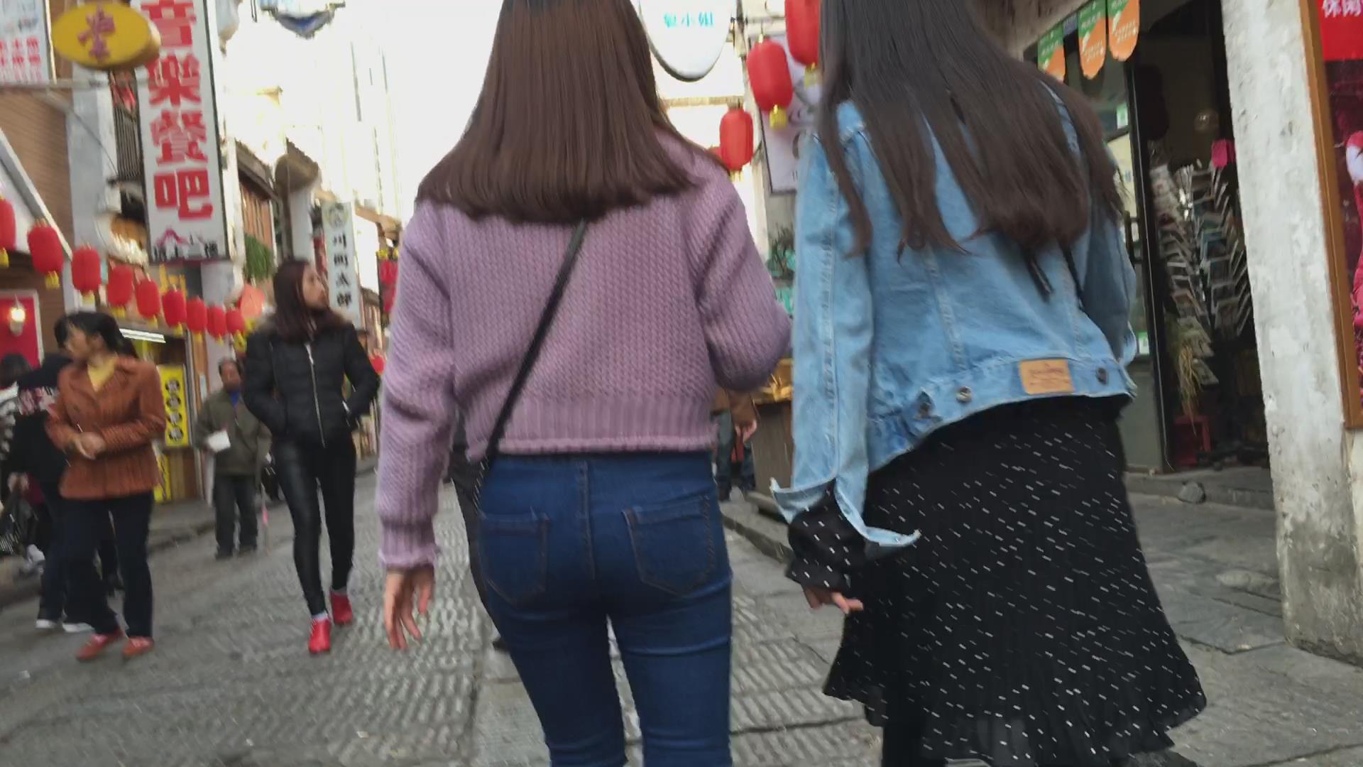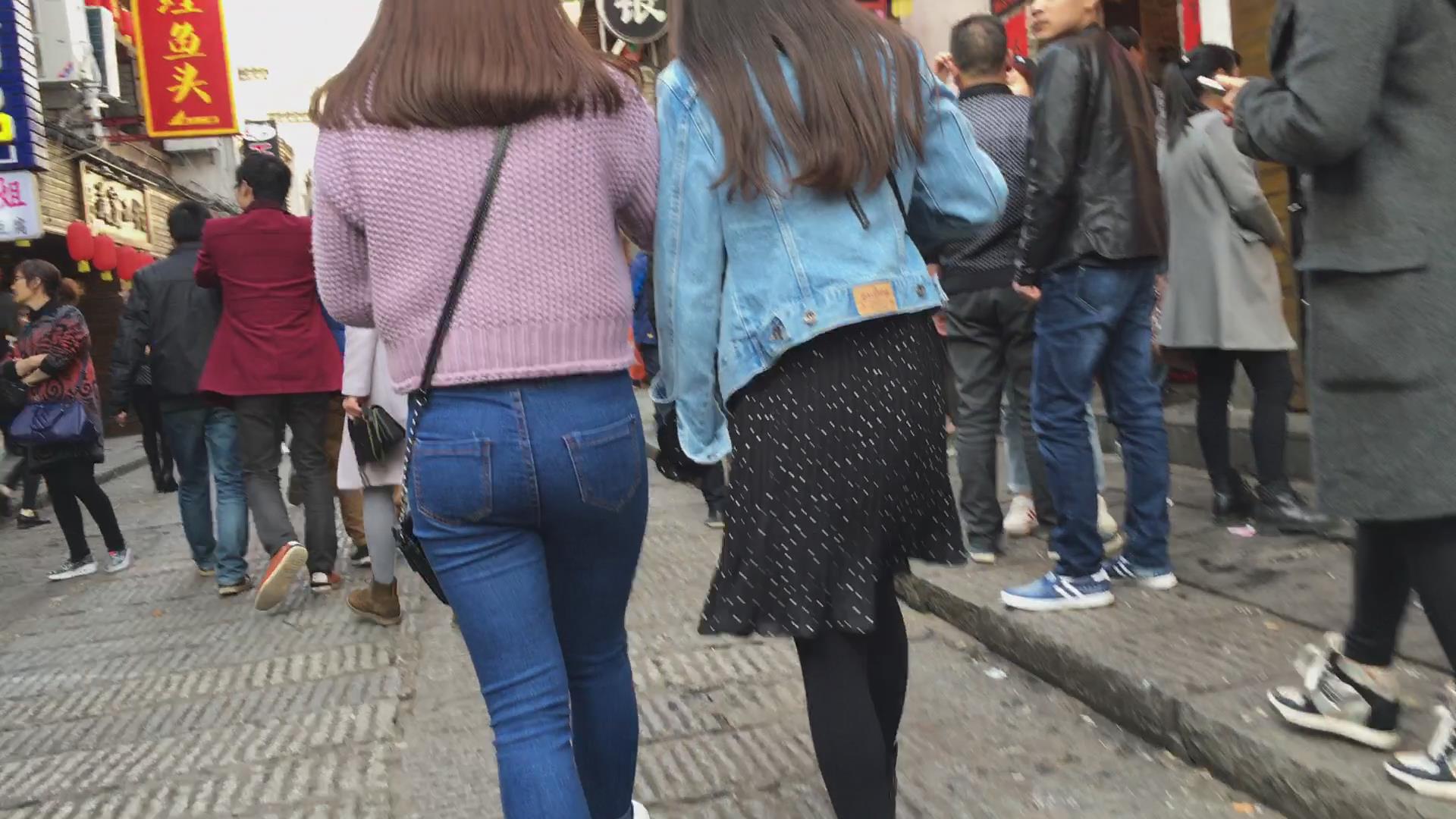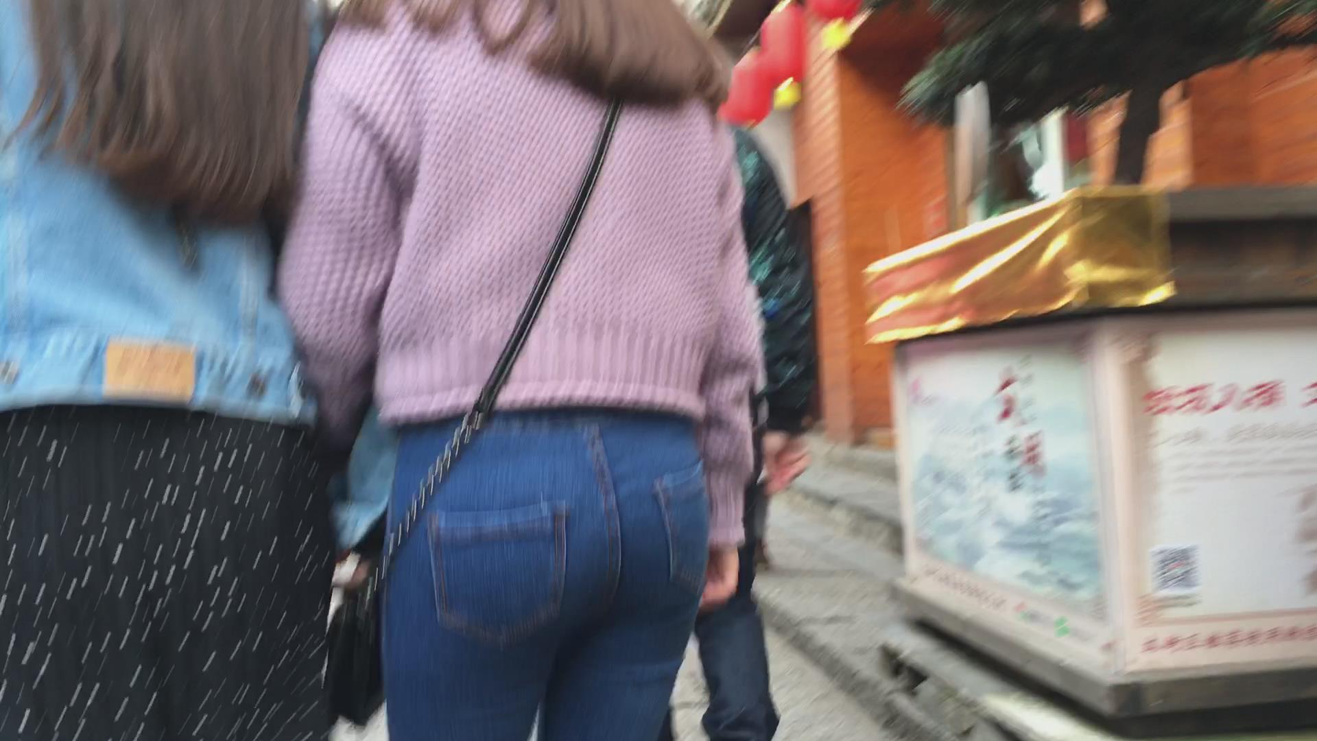 街拍超级圆臀紧身蓝色牛仔裤美女 编号5998