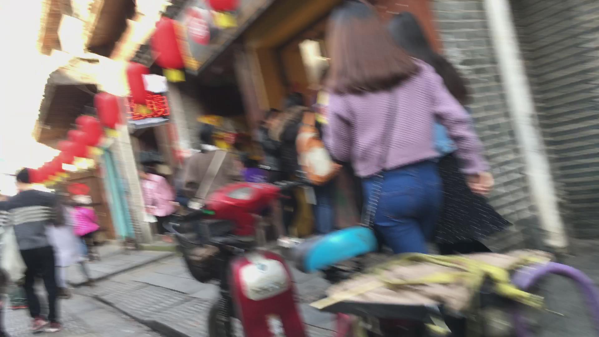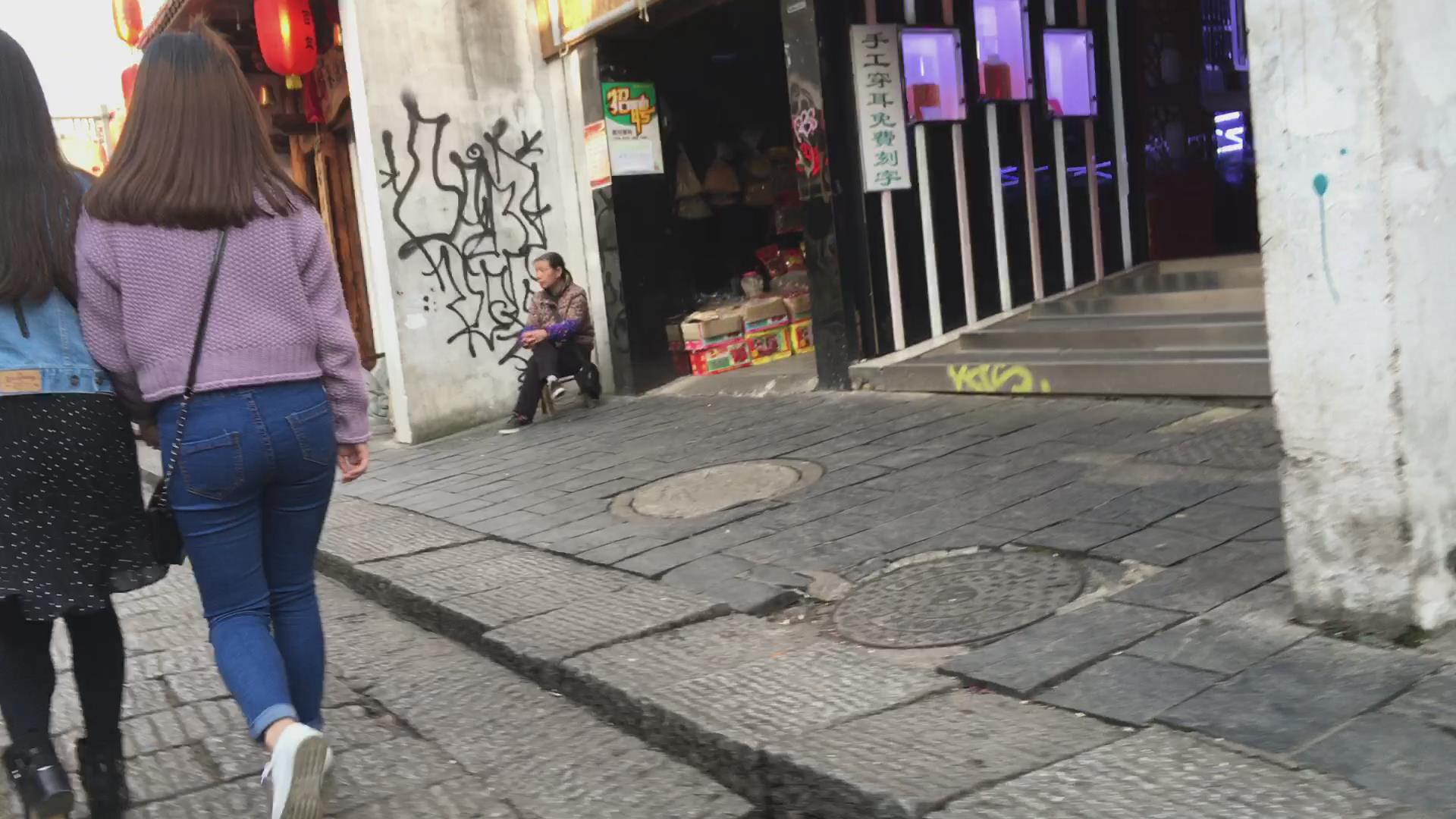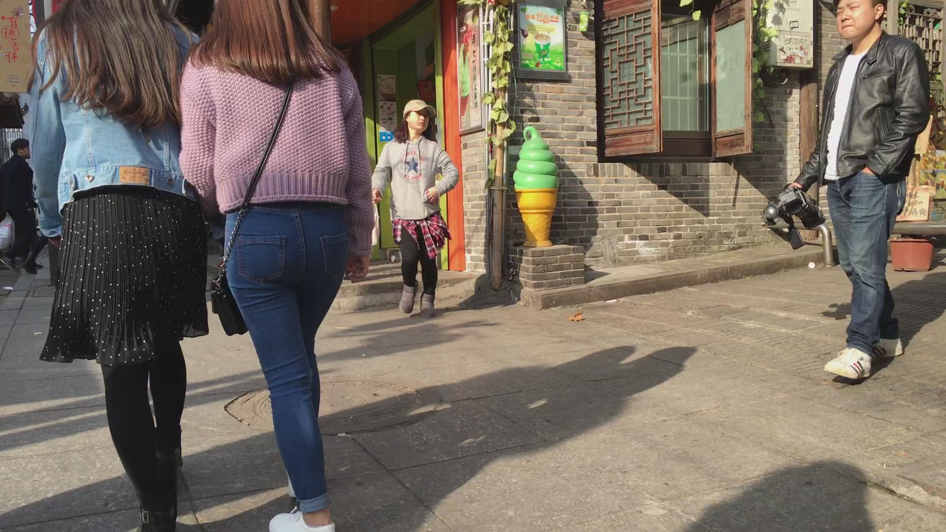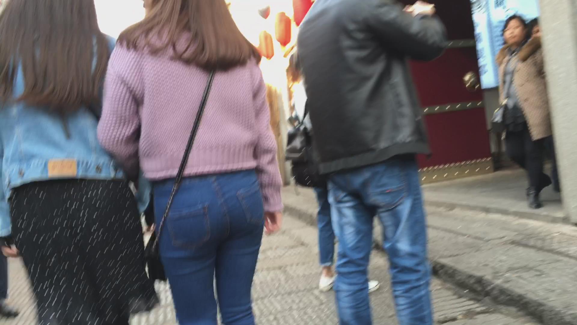 街拍超级圆臀紧身蓝色牛仔裤美女 编号5998