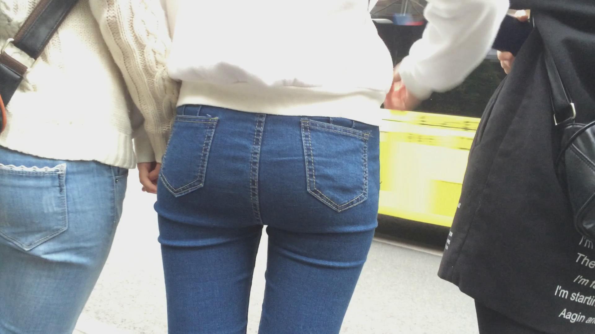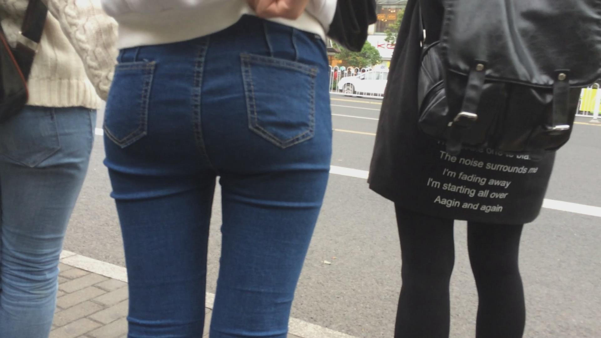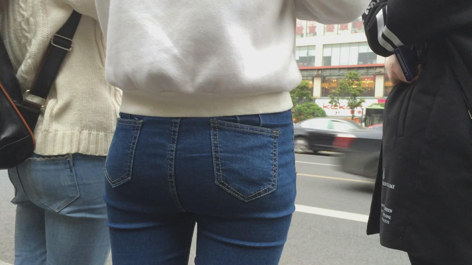 街拍路边等公交的紧身蓝色牛仔裤美女 编号6019