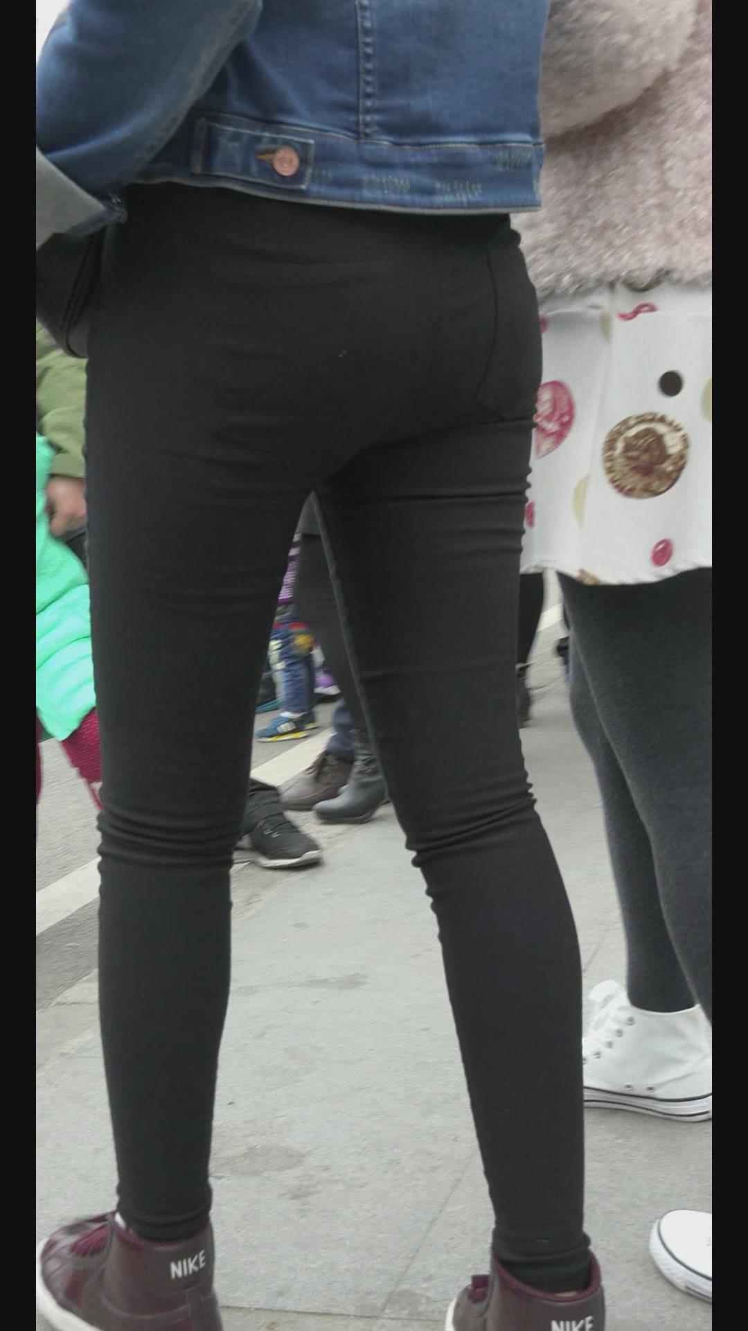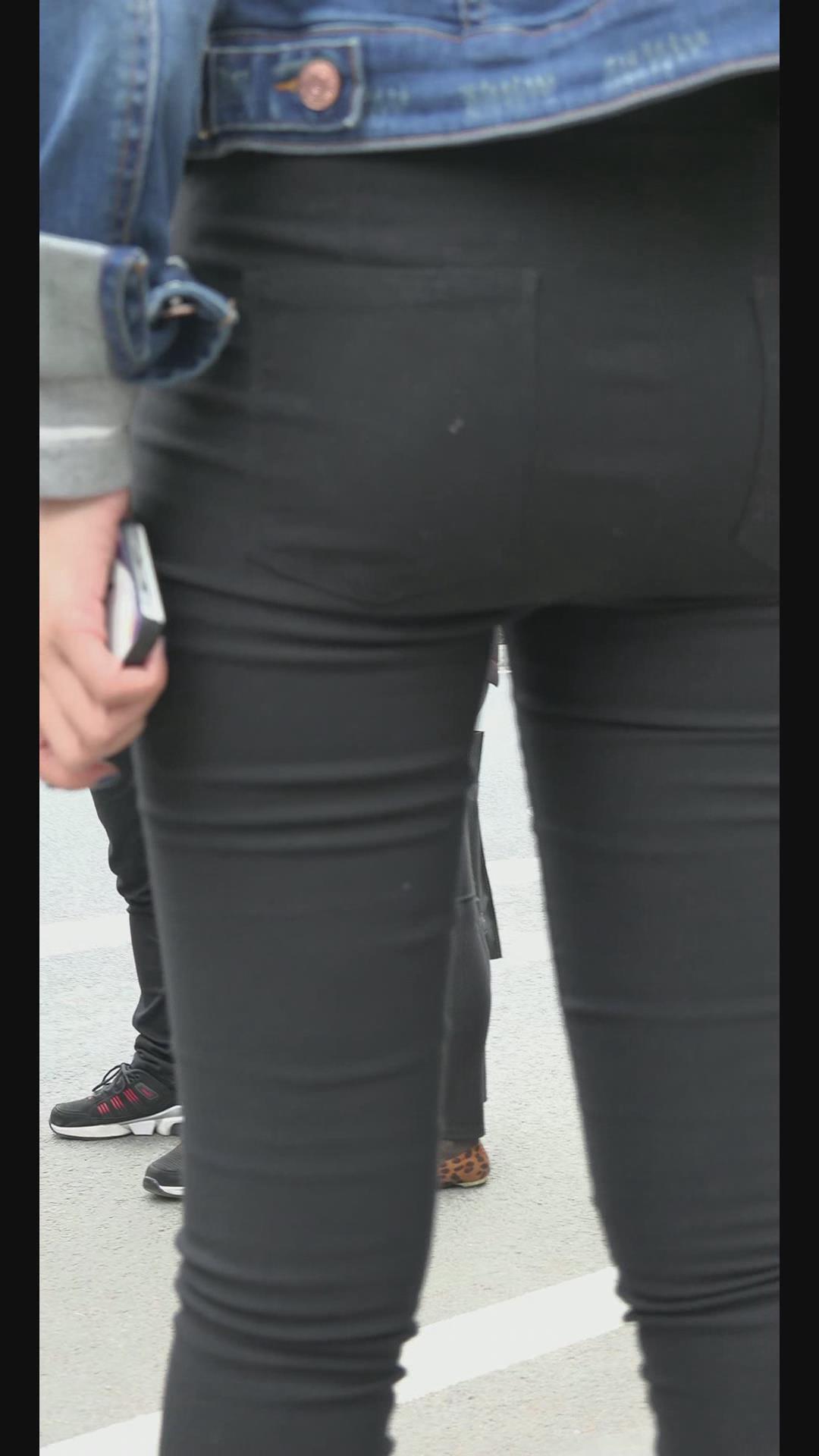 街拍牛仔小外套紧身黑裤清纯小美女 编号6020