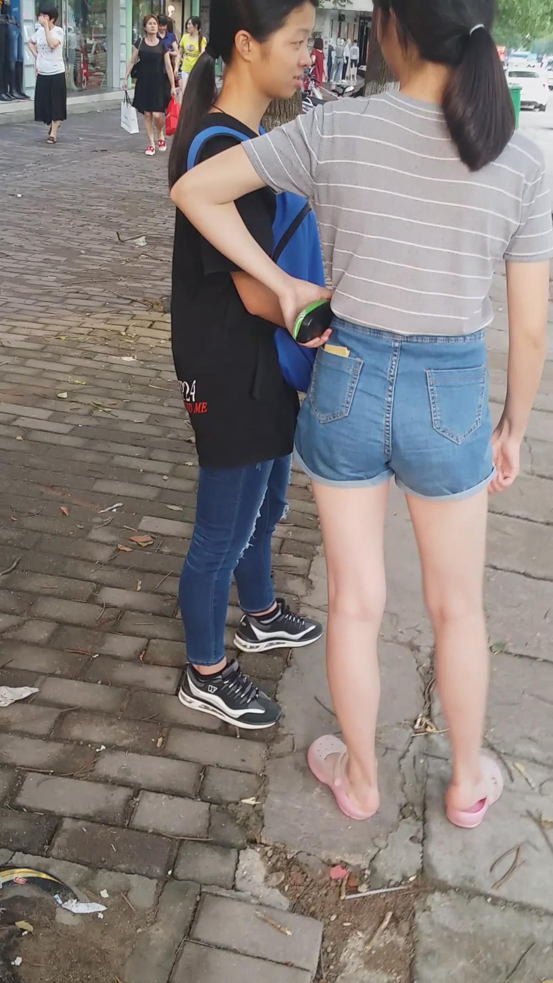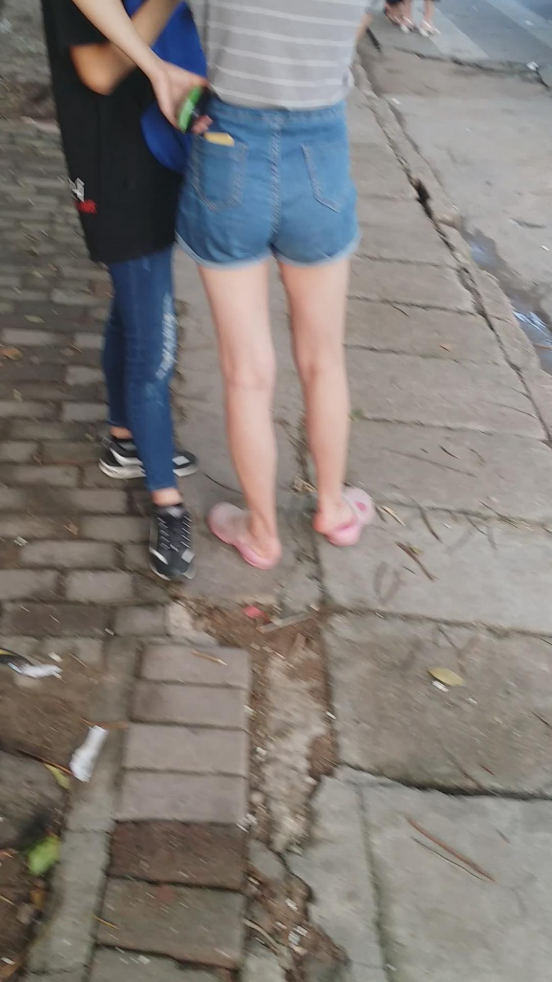 路边等车的条纹T恤衫牛仔热裤纤细街拍美腿 编号4500